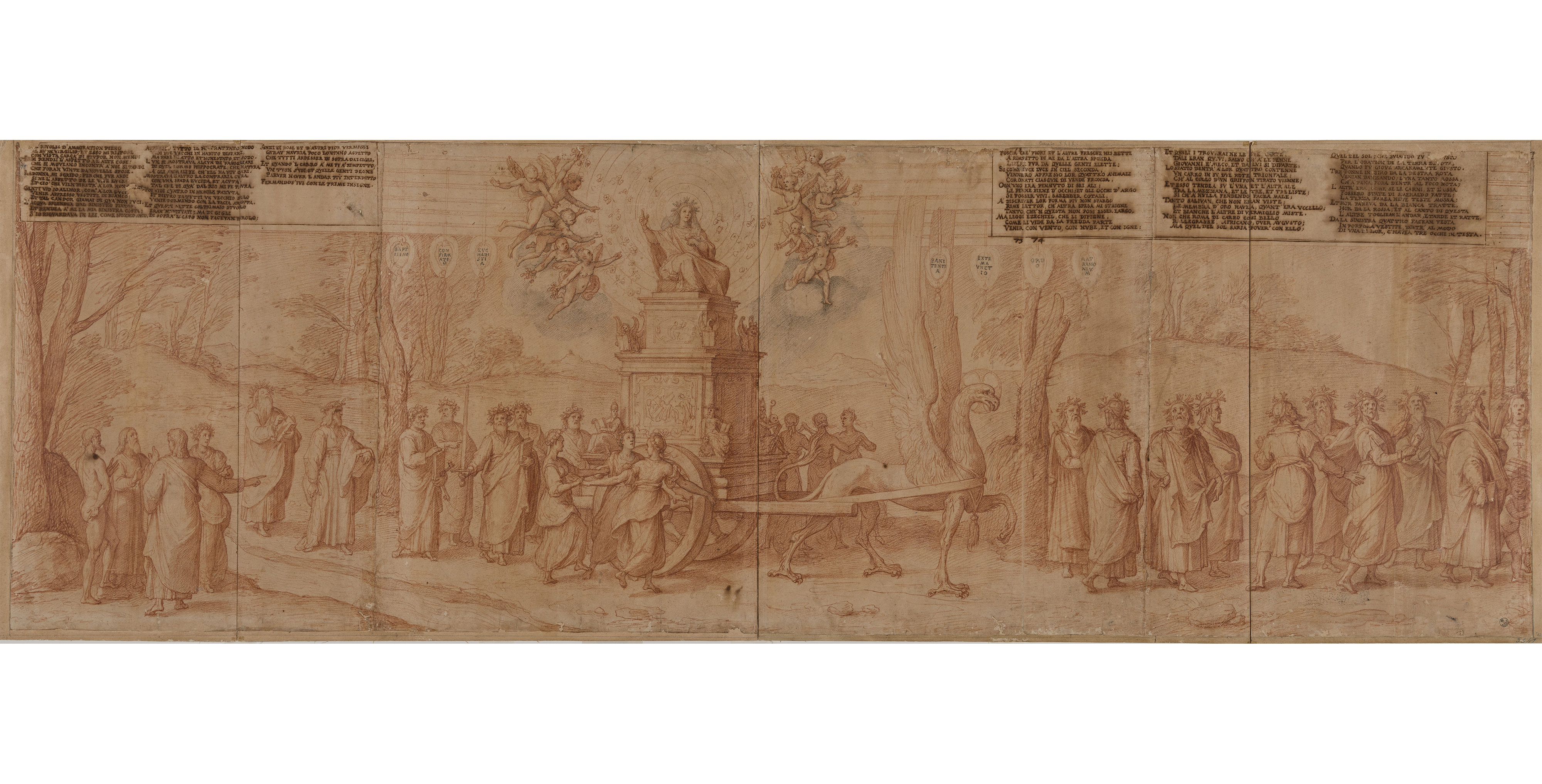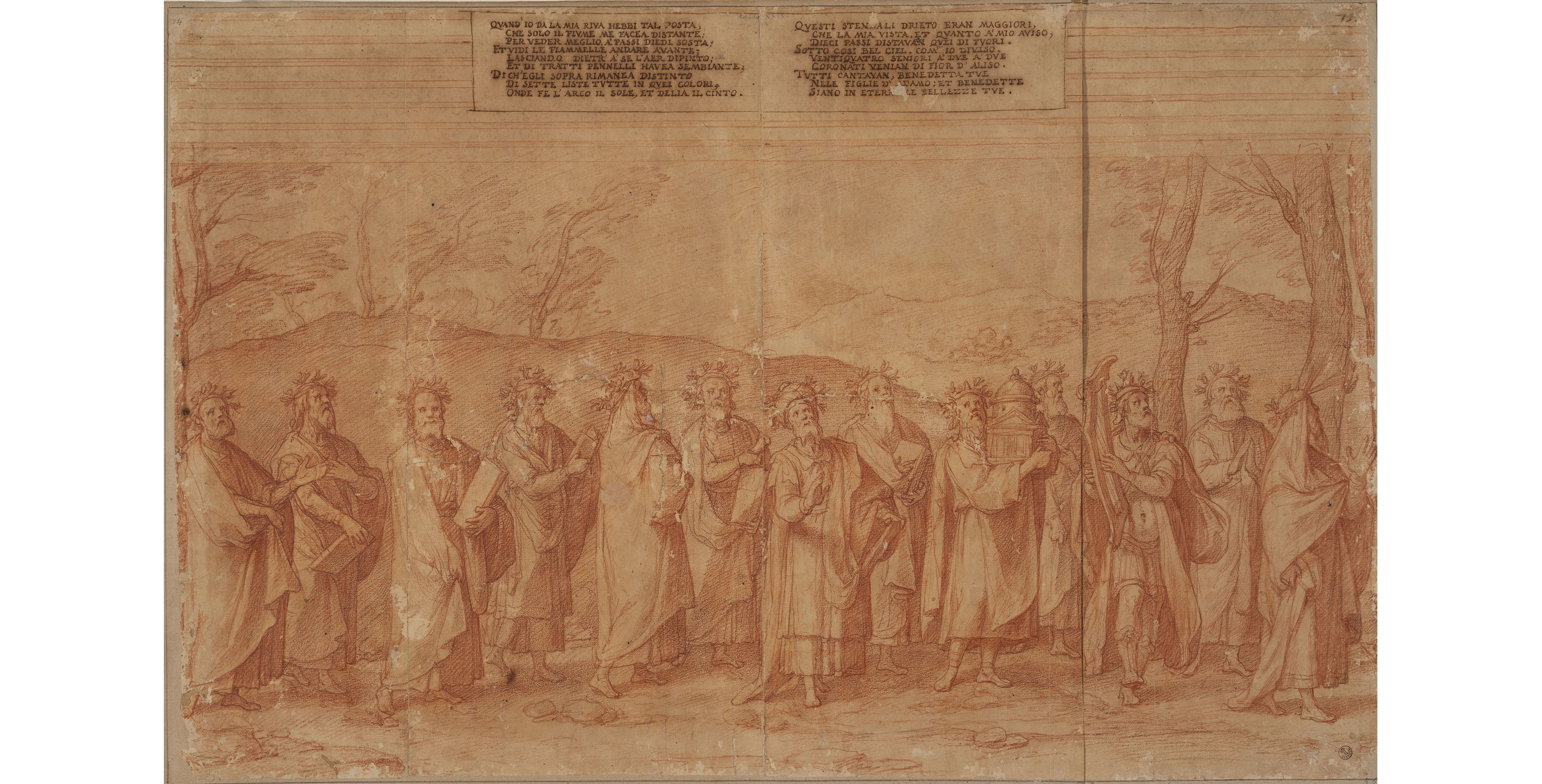 et ciò che vien di retr’ a lor non guardi?»Nel formato eccezionale del disegno, commisurato al tema da rappresentare, è visualizzata l’intera sequenza della processione mistica del Paradiso Terrestre. Dietro i ventiquattro seniori viene un carro, trainato da un grifone e circondato dalle sette virtù teologali e cardinali, sul quale è assisa Beatrice, circondata da nubi di fiori e schiere di angeli. Sugli alberi, in alto, pendono sette nodi nei quali sono iscritti i sette sacramenti.