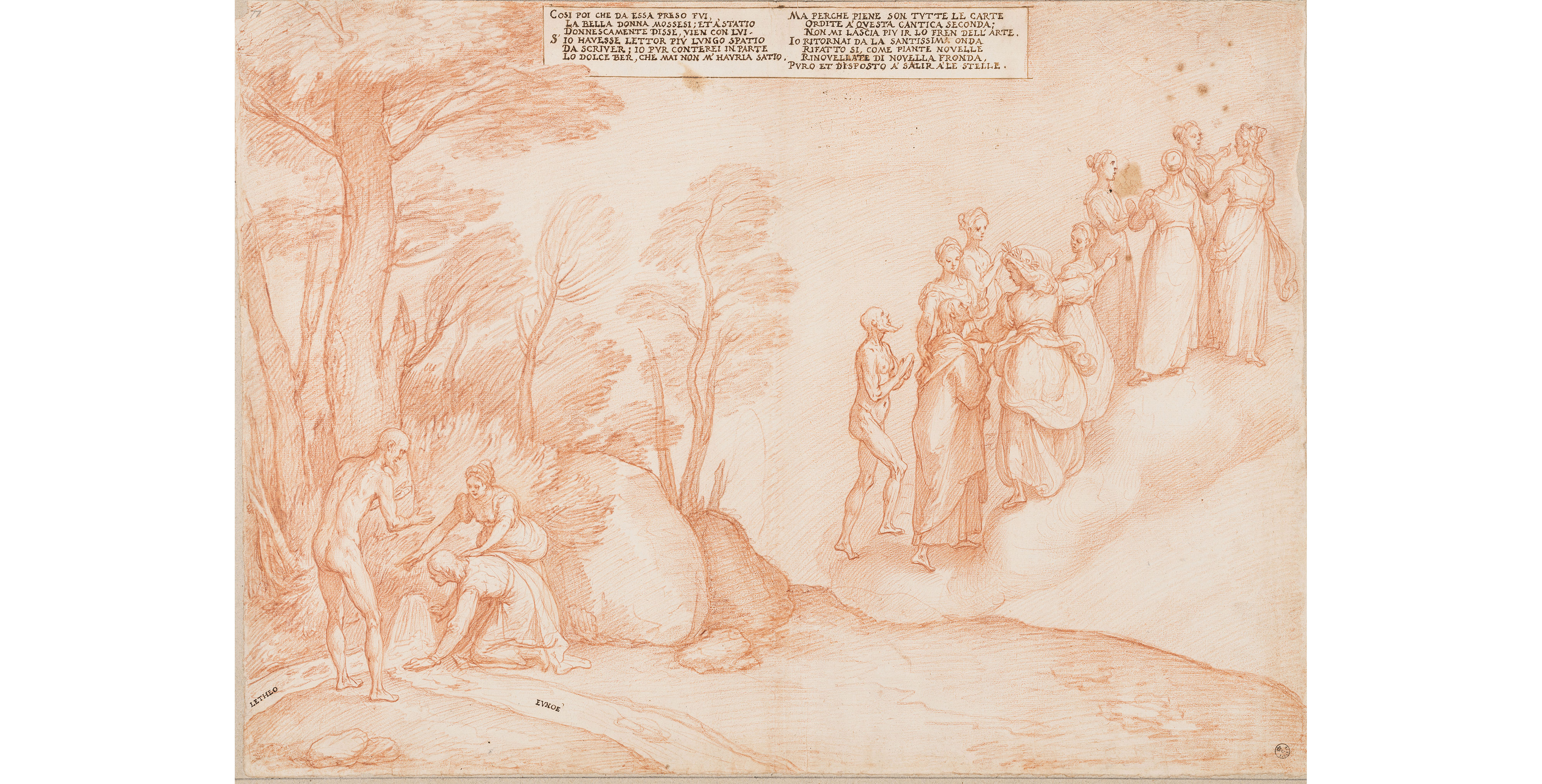 Commento di Federico Zuccari: «Paradiso terrestre. Canto XXVII. Giunti i poeti al Paradiso terrestre, Virgilio mette in libertà a Dante l’andare, lo stare e l’operare, come meglio li pareva e piaceva.