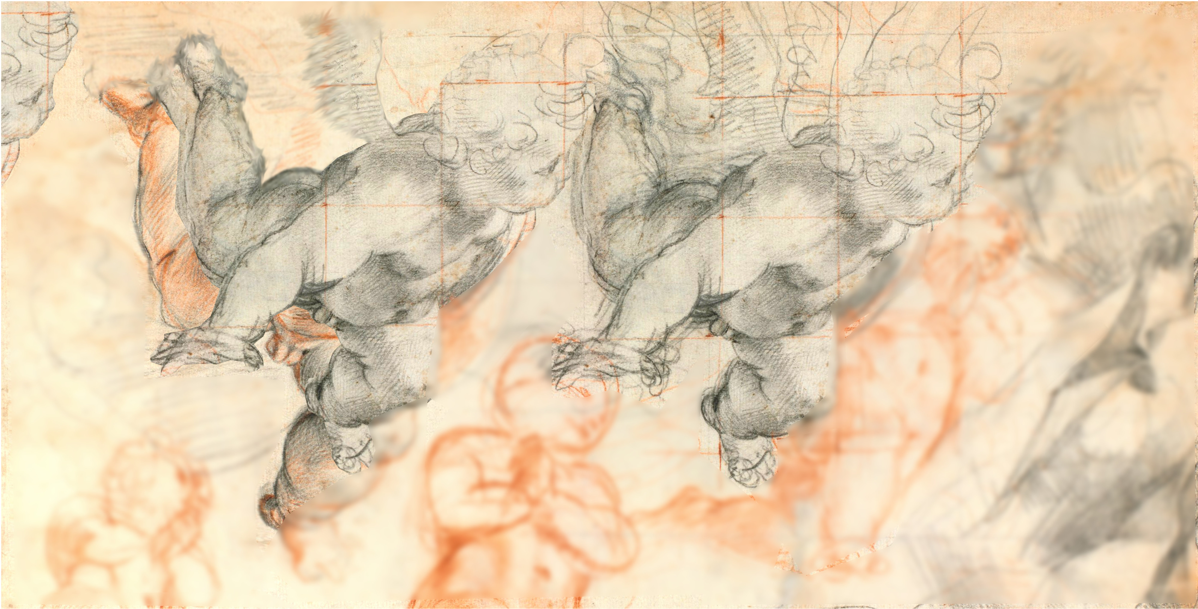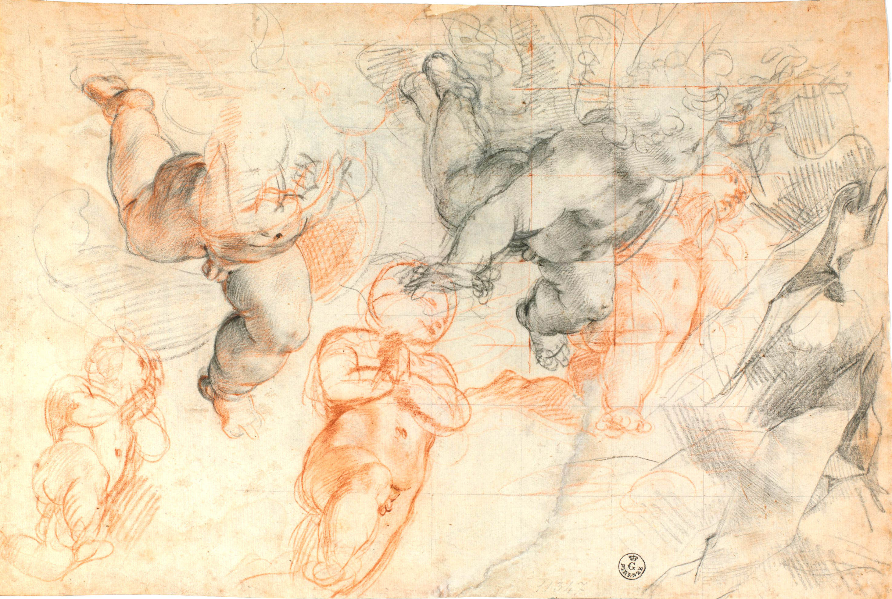 Inv. 11347 F rectoNel foglio il moto ricreato arriva a simulare anche il volo degli angeli, sottolineato non solo dallo svilupparsi delle forme nello spazio, ma anche dal susseguirsi dei ripensamenti dei singoli dettagli, come il piede destro del putto in alto a destra. La necessità di ricorrere costantemente alla ripetizione delle forme potrebbe aver contribuito a sviluppare questa particolare sensibilità per la resa dell’azione nel suo svolgersi.