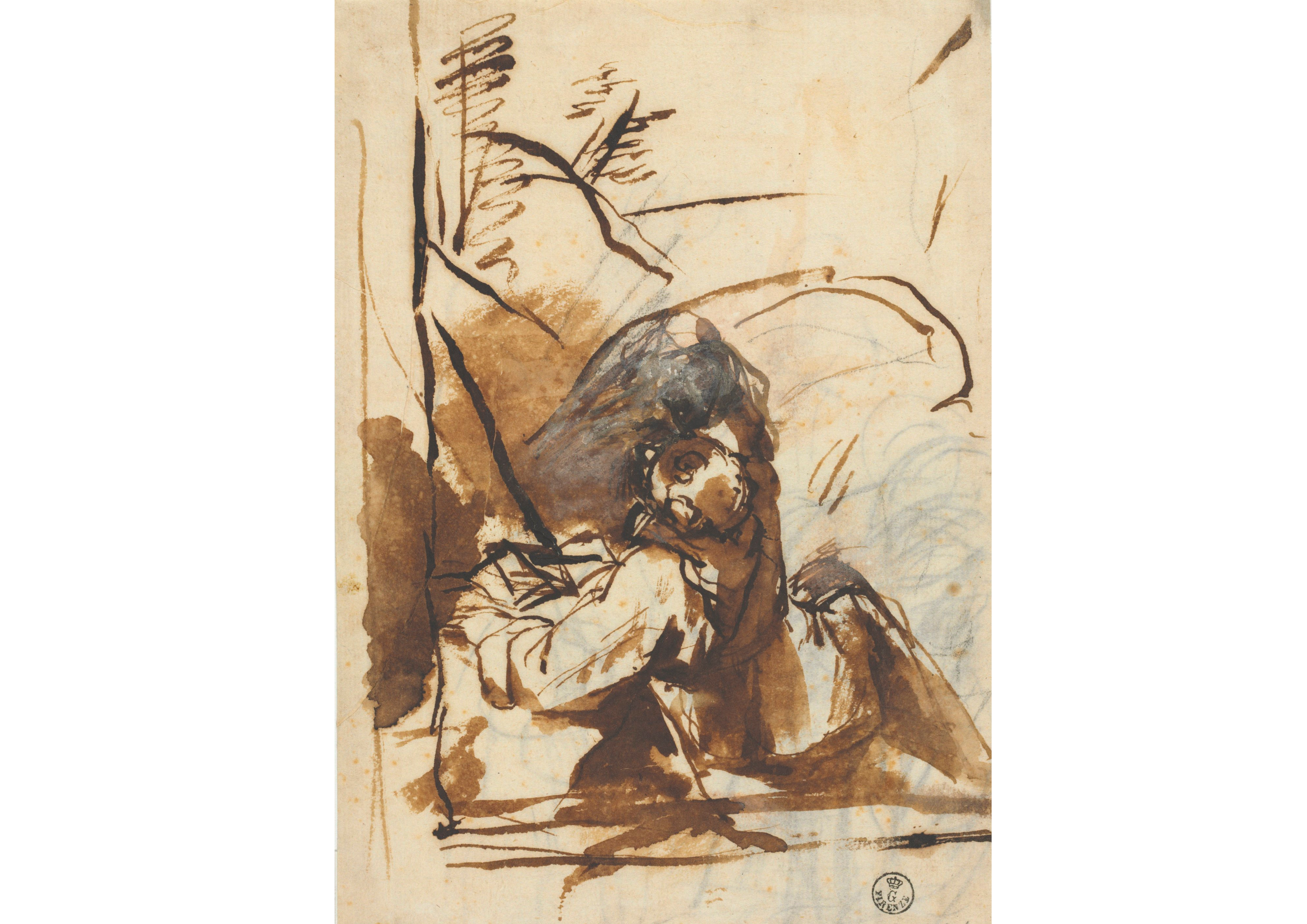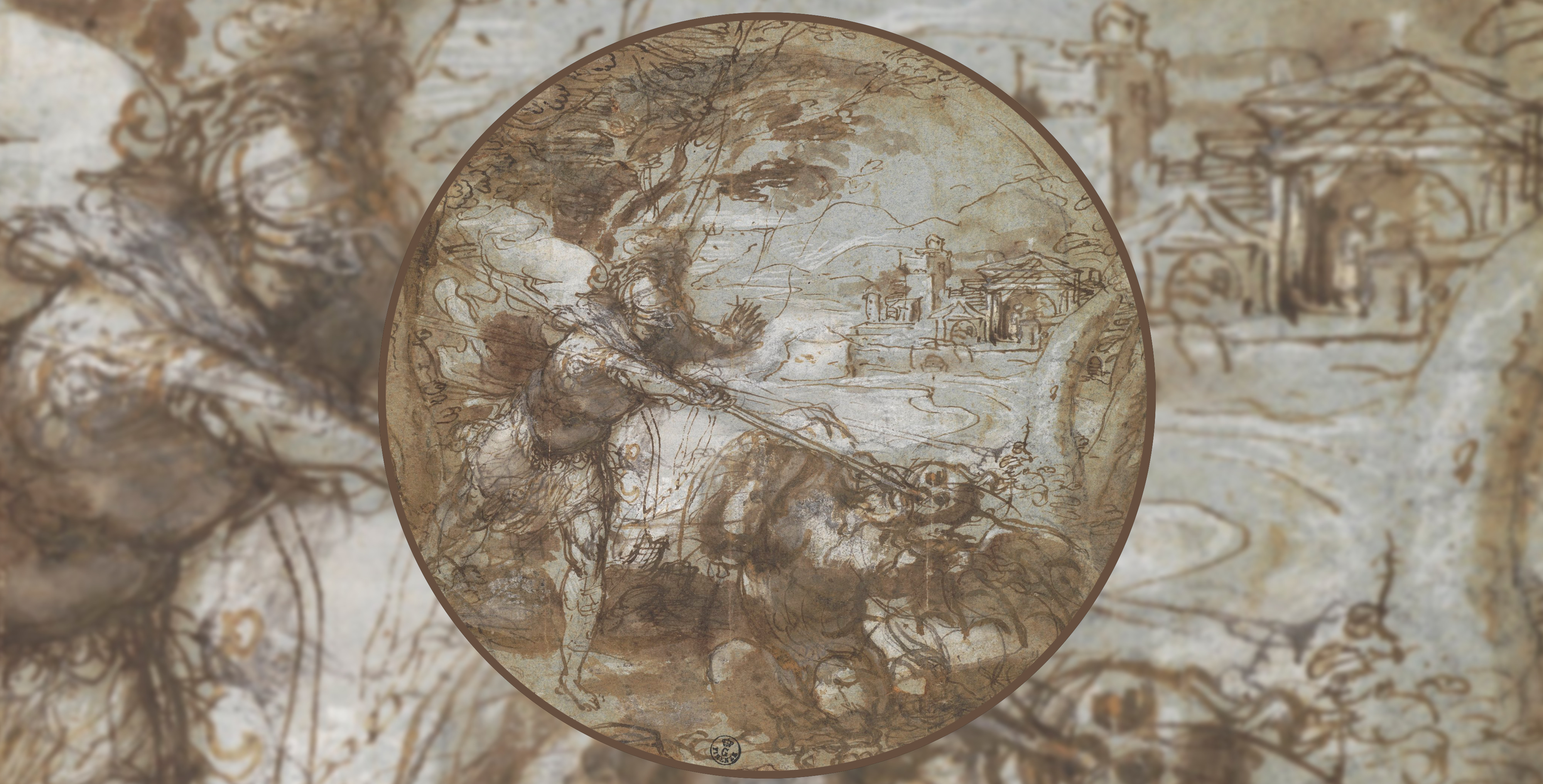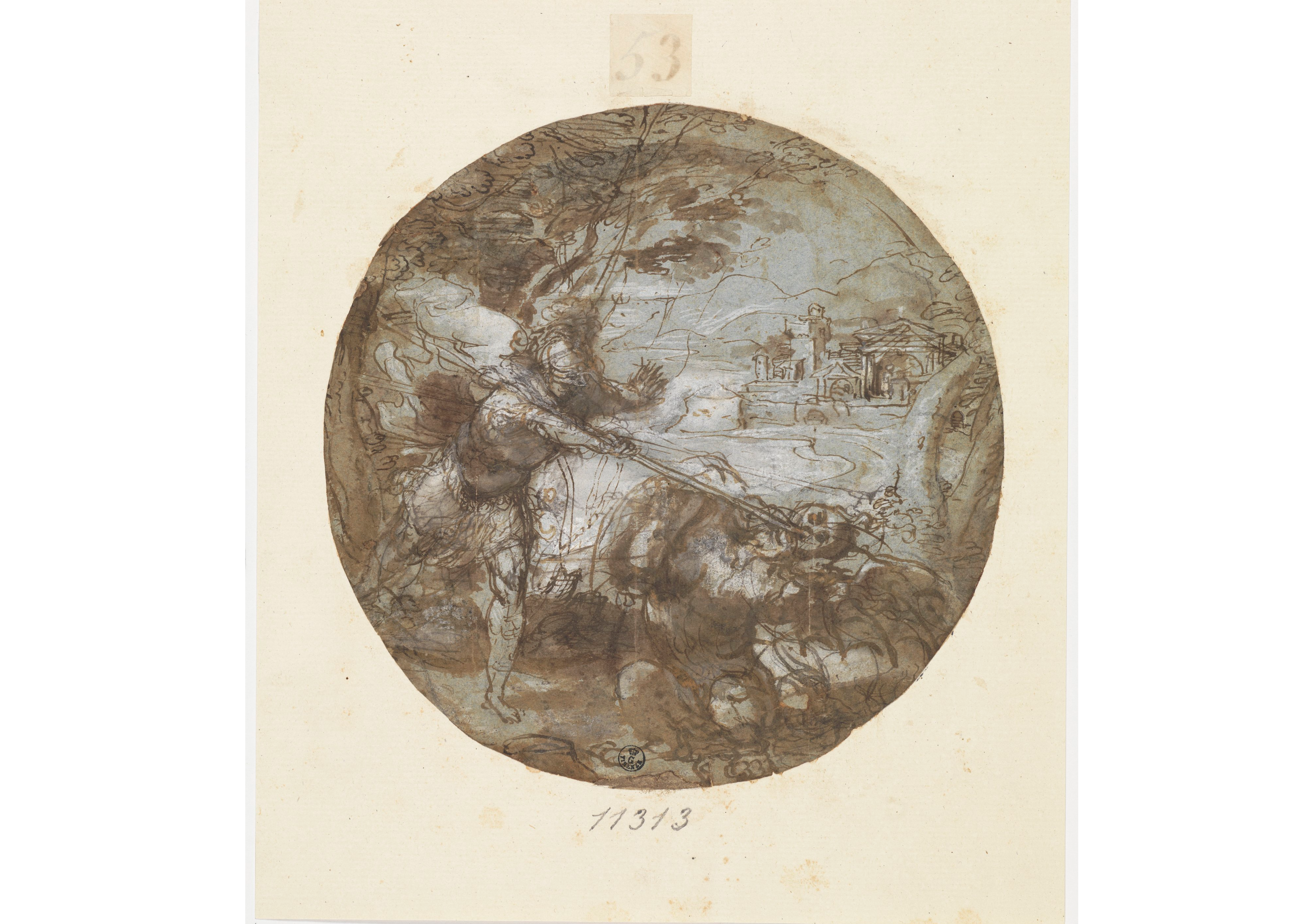Inv. 11313 FPer la sua peculiare forma circolare il disegno potrebbe essere un raro studio per un piatto in maiolica. Emerge con chiarezza la tensione esistente fra la rapidità del pensiero e l’attenzione per specifici aspetti compositivi, in particolare per i contrasti chiaroscurali. Emerge, poi, la capacità di armonizzare le figure con il paesaggio circostante grazie a un tratto vibrante vicino allo “scarpigno”, termine che sembra risalire allo stesso Barocci e che descrive degli schizzi tracciati velocemente, in cui da un intricato groviglio di linee emerge la prima idea compositiva.