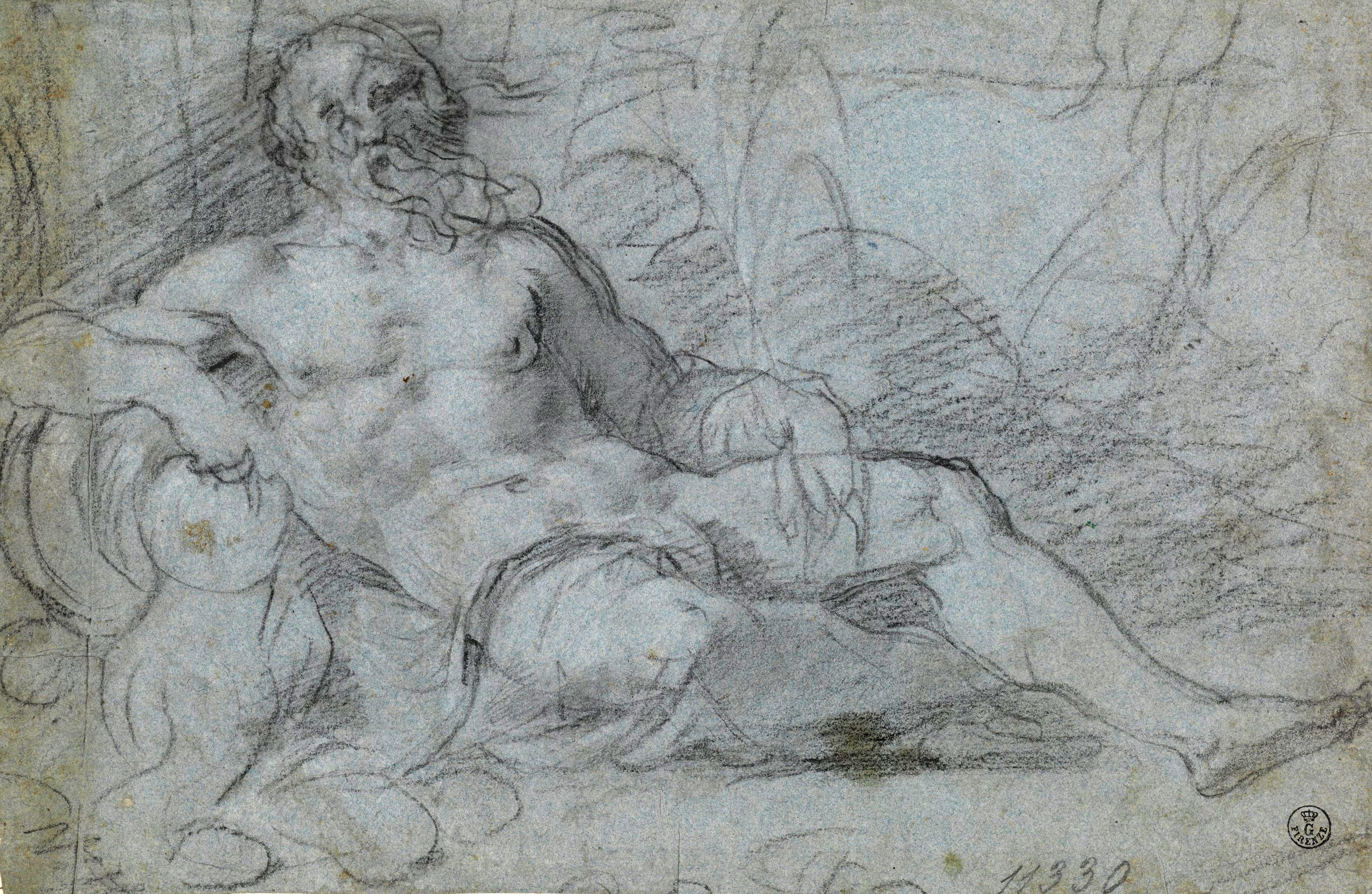 L'abitudine ad analizzare le figura da differenti prospettive appare legata alla consuetudine di creare piccoli modelli di cera o di creta, che secondo Bellori servivano a ottenere una resa naturalistica dei panneggi. I modelli, in realtà, ricoprivano un ruolo decisivo per la comprensione tridimensionale delle forme. - 20/34Monaco semidisteso con il braccio sinistro appoggiato a un masso
