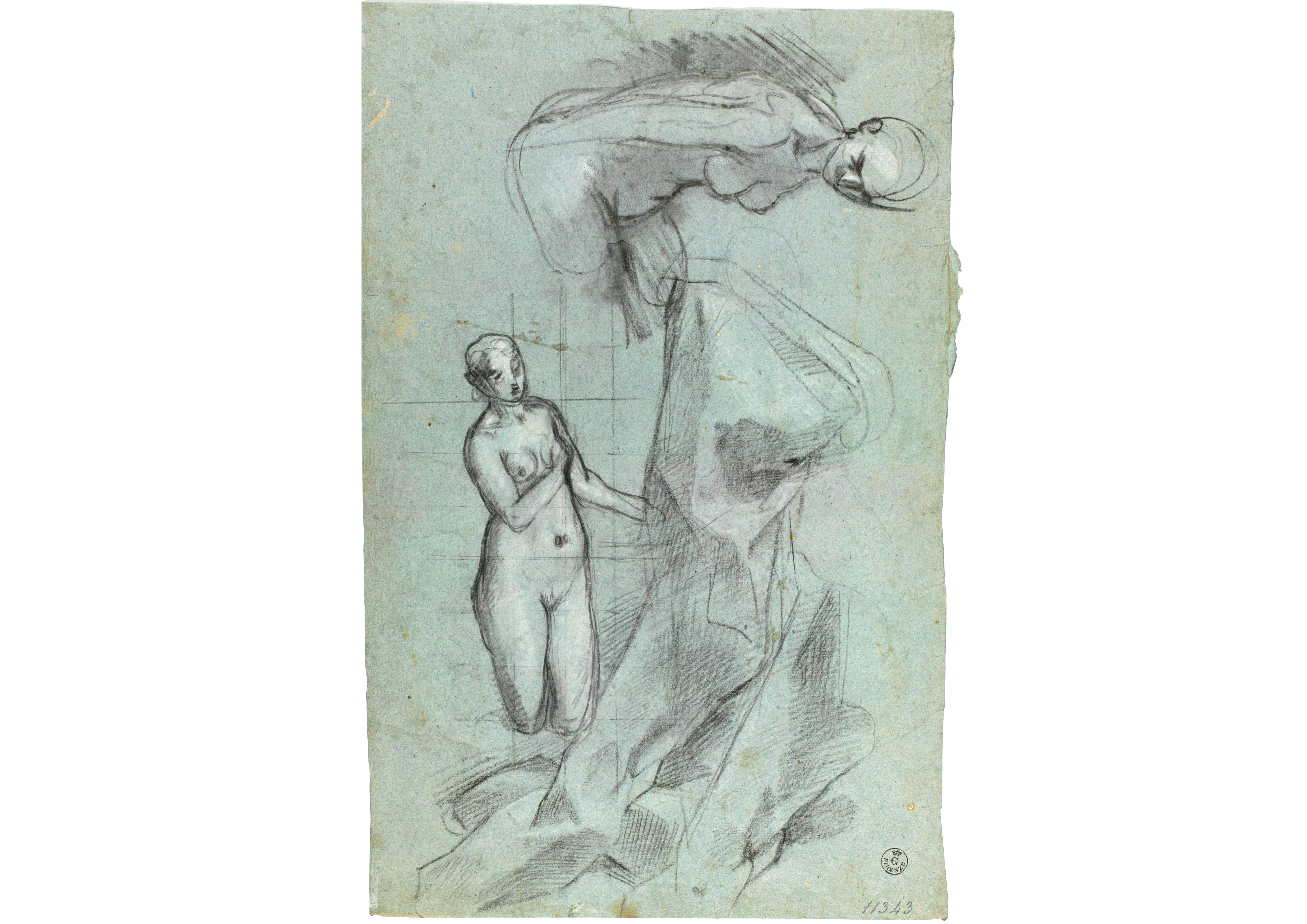 Inv. 11343 F rectoLa figura femminile al centro è preparatoria per la Vergine nell''Annunciazione’ destinata alla Basilica di Loreto (1582 - 1584, Città del Vaticano, Pinacoteca dei Musei Vaticani), cui risulta correlato anche il manto analizzato sulla destra, elemento che concorre a esaltare la gestualità e la delicata maestosità della Madonna. L'altro studio di figura femminile è invece ricollegabile alla donna in primo piano nel ‘Martirio di san Vitale’ (1580 - 1583, Milano, Pinacoteca di Brera). Entrambi i corpi, pur mostrando una certa morbidezza e una verosimile definizione volumetrica, risultano lontani da un'indagine condotta sul dato reale; infatti la linea di contorno sottile e astratta rivela quanto siano frutto di un'elaborazione ancora mentale.