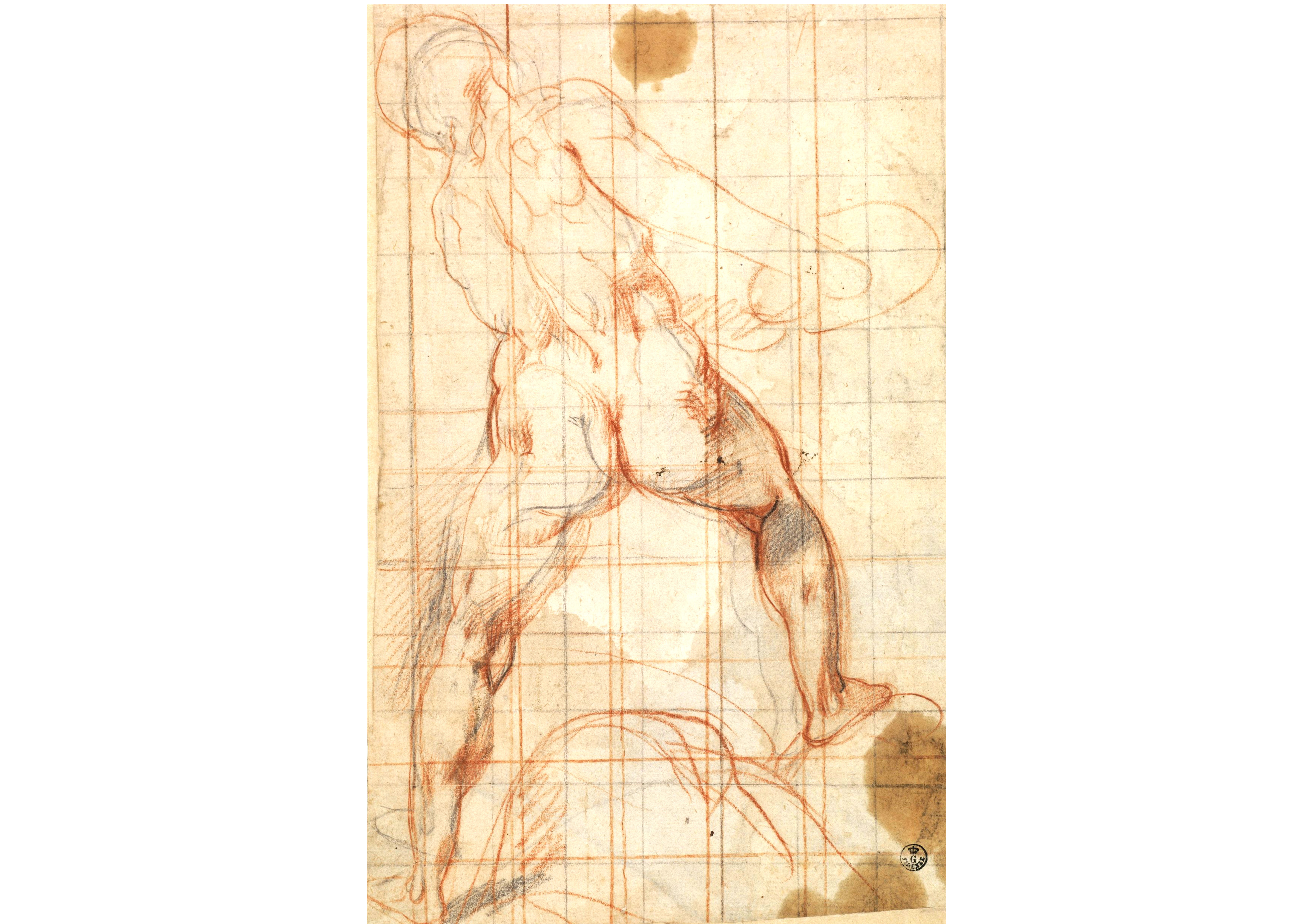 Inv. 11619 F versoAccanto a figure estremamente astratte o anatomicamente indagate dal vero, si ritrovano anche modelli stilizzati che tradiscono l'uso di manichini. Il ricorso a tale pratica, impiegata dagli artisti già dal Quattrocento, è testimoniata da questo foglio, in cui l'artista analizza la posa e il panneggio del tiranno seduto nel 'Martirio di san Vitale' (1580 - 1583, Milano, Pinacoteca di Brera).