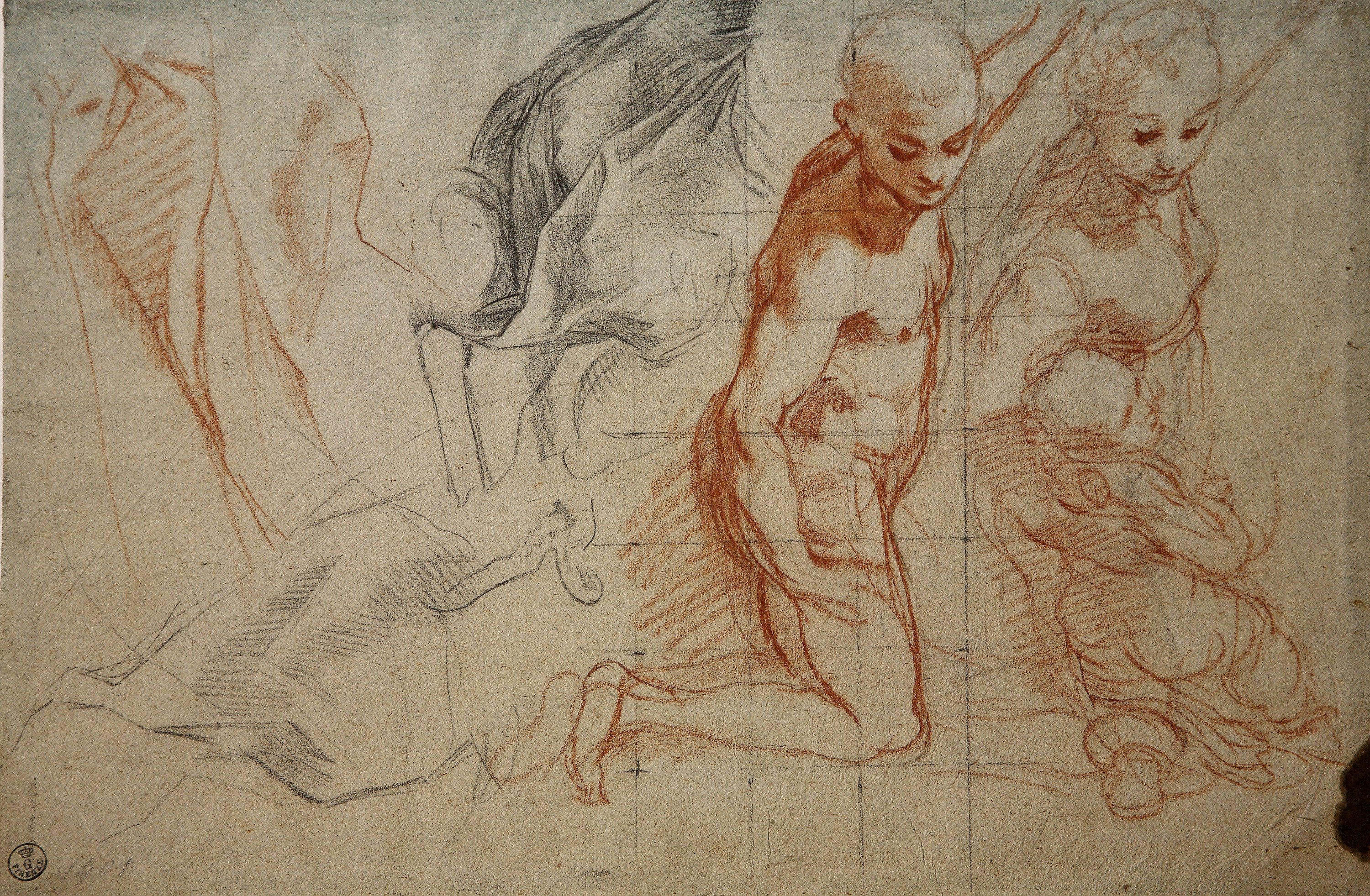 - 7/34Due studi di figura (una nuda e l’altra vestita con putto fra le braccia) e studi di panneggi