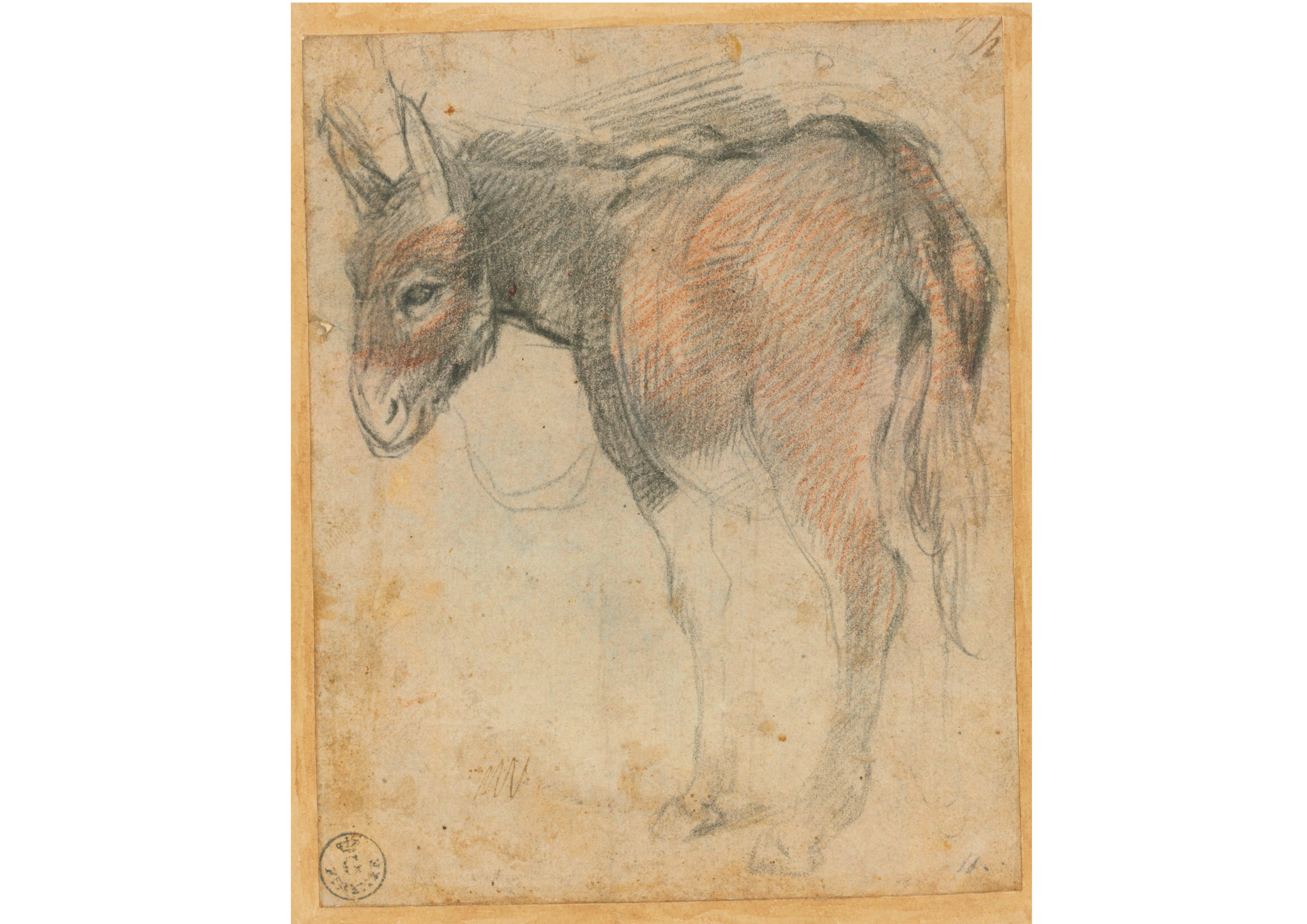 Inv. 925 OGli studi di animali e di dettagli, come le famose “arie di teste”, sono da sempre considerati emblemi dell’approccio immediato di Barocci al dato naturale. Essi invece sono spesso il frutto di una rielaborazione ponderata e di un'attenta verifica mentale. È il caso del disegno raffigurante un asino, dove la posa è subordinata al ruolo compositivo che esso svolge nel 'Riposo durante la fuga in Egitto' (1570 - 1573, Città del Vaticano, Pinacoteca dei Musei Vaticani).