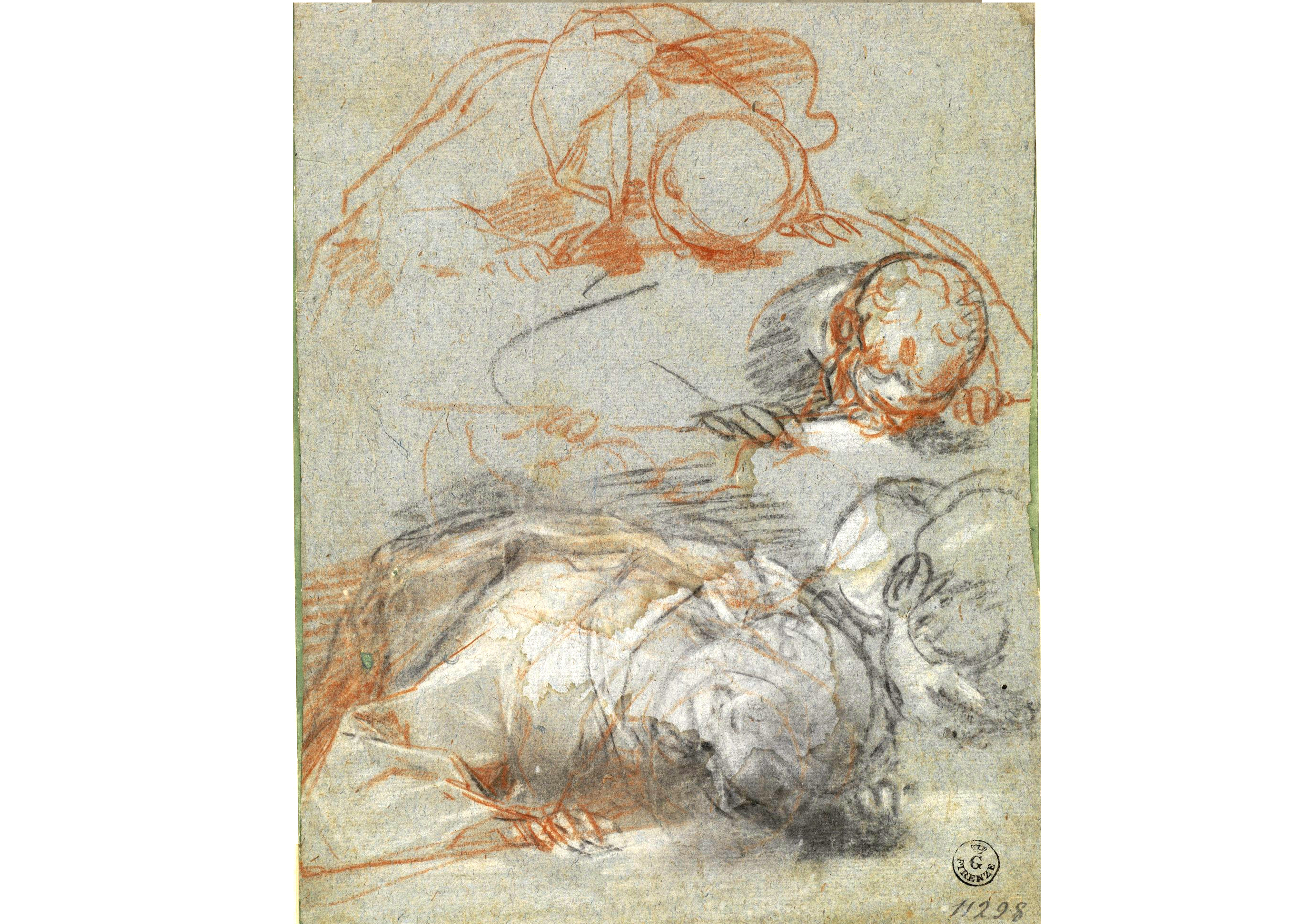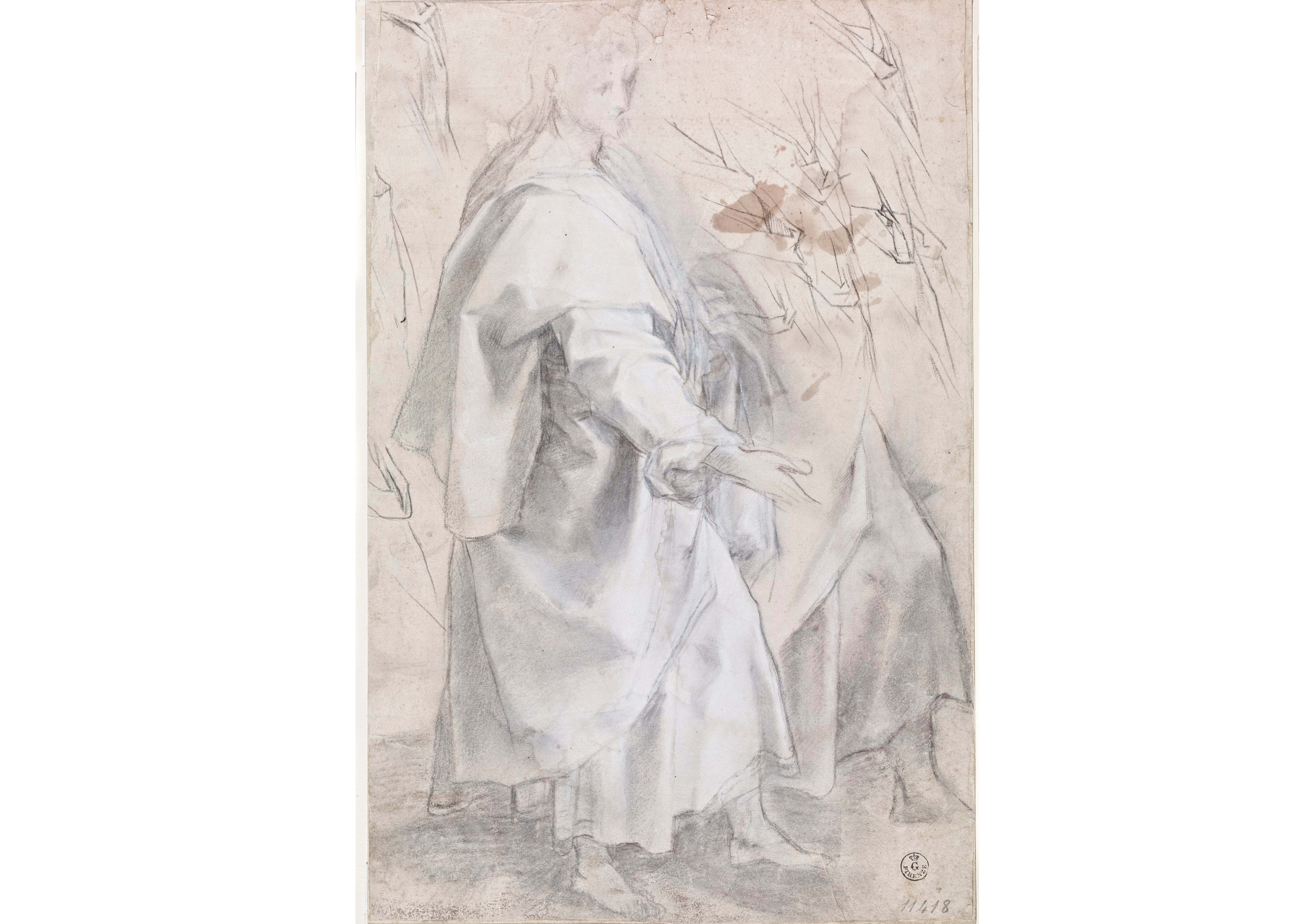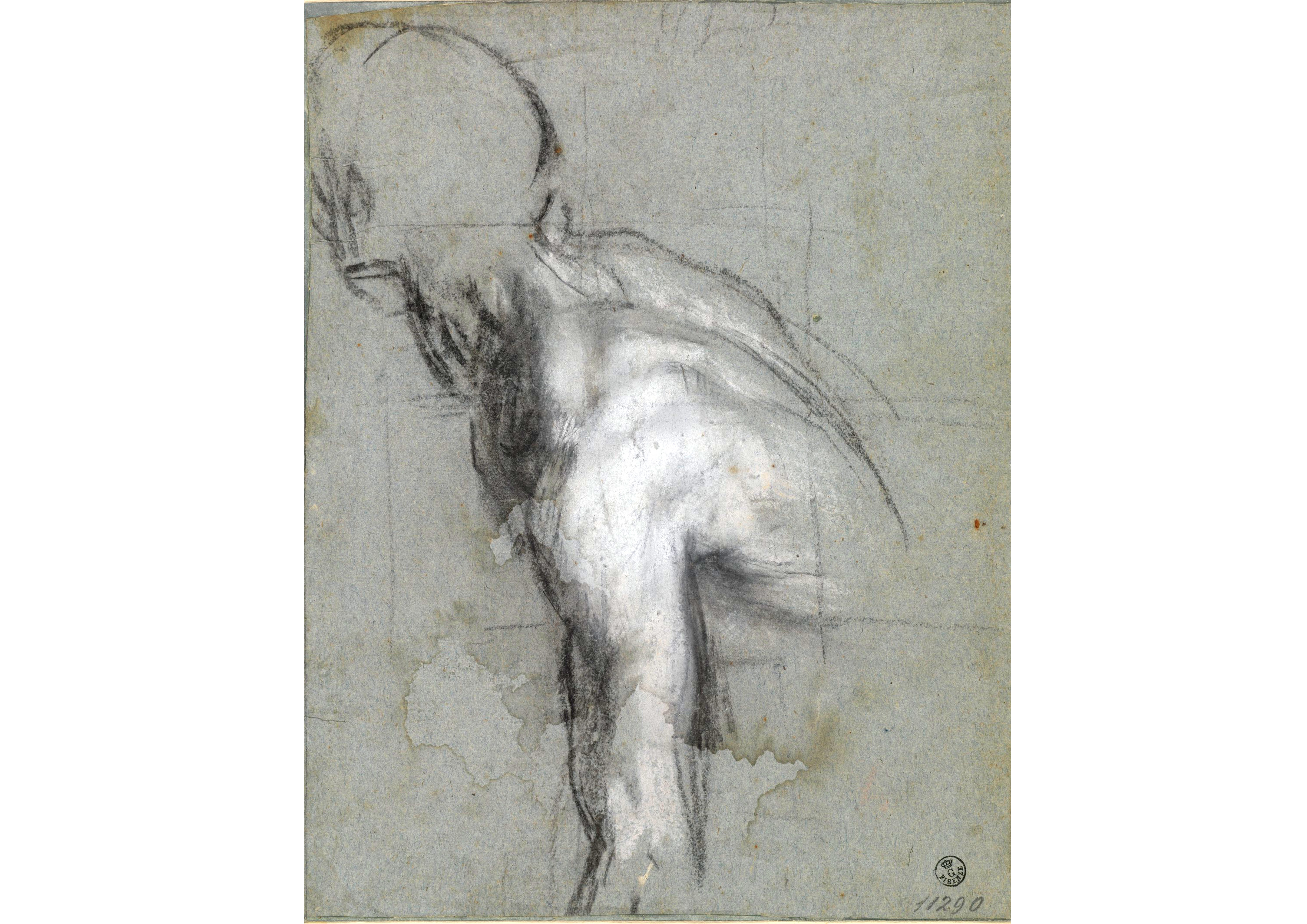 Inv. 11298 FIl tempo e lo spazio si dilatano nella bidimensionalità di un singolo foglio di carta fino a formare una vera e propria sequenza cinematografica. In questo studio per l''Assunzione della Vergine' è ripresa la progressione discendente del corpo dell’apostolo, che prende forma sotto i nostri occhi mentre si inclina e si sporge in avanti a guardare il sepolcro vuoto.
