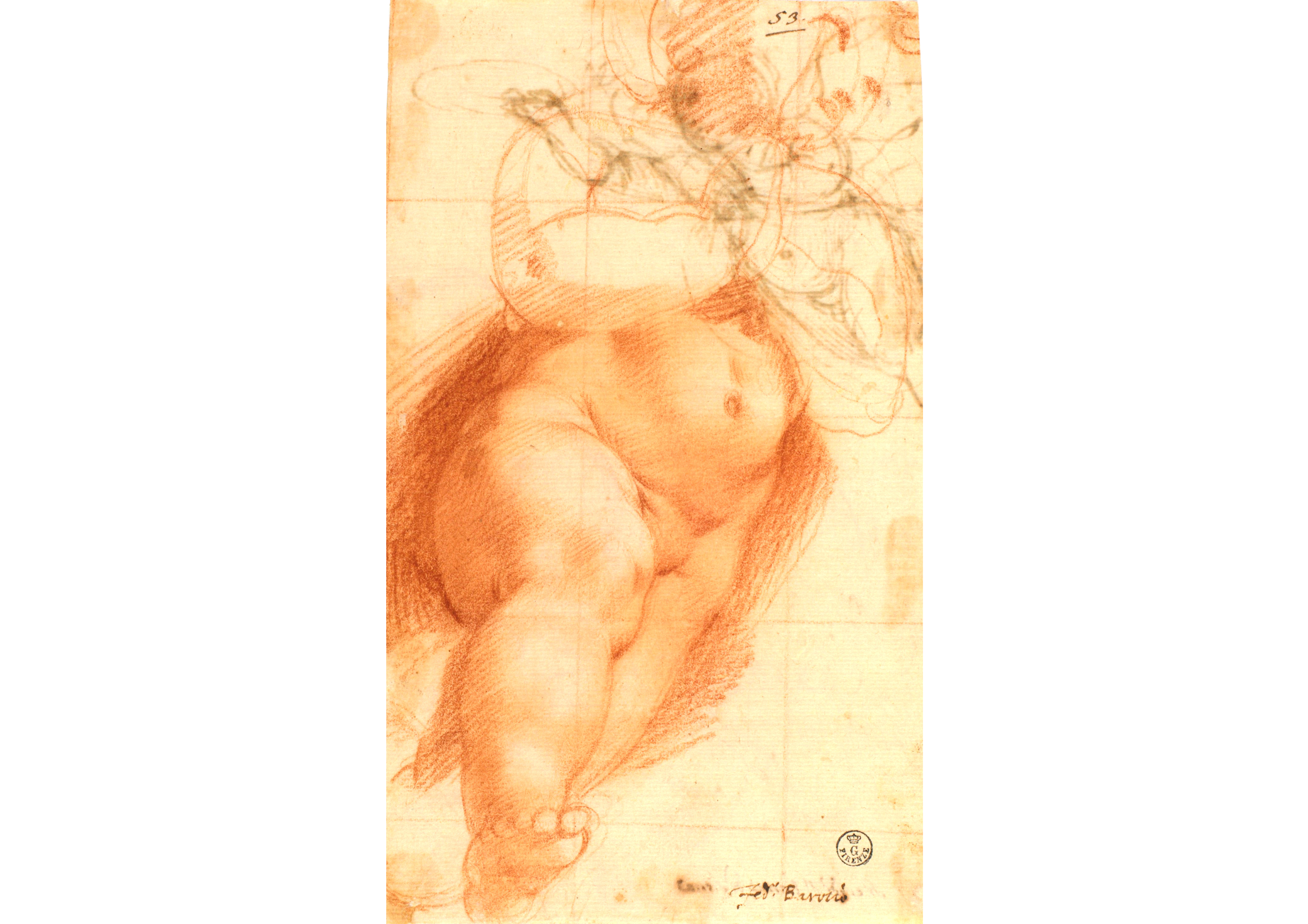 Inv. 11450 F rectoIl contrasto chiaroscurale, teso a restituire la volumetria del corpo dell'angelo, è ottenuto attraverso l’uso a risparmio della carta e una stesura morbida della pietra rossa. Appare, dunque, evidente come Barocci sappia interpretare il dato naturale con una sensibilità in questo caso molto vicina a quella espressa, più o meno negli stessi anni, da Annibale Carracci (Bologna, 1560 - Roma, 1609) a Bologna.