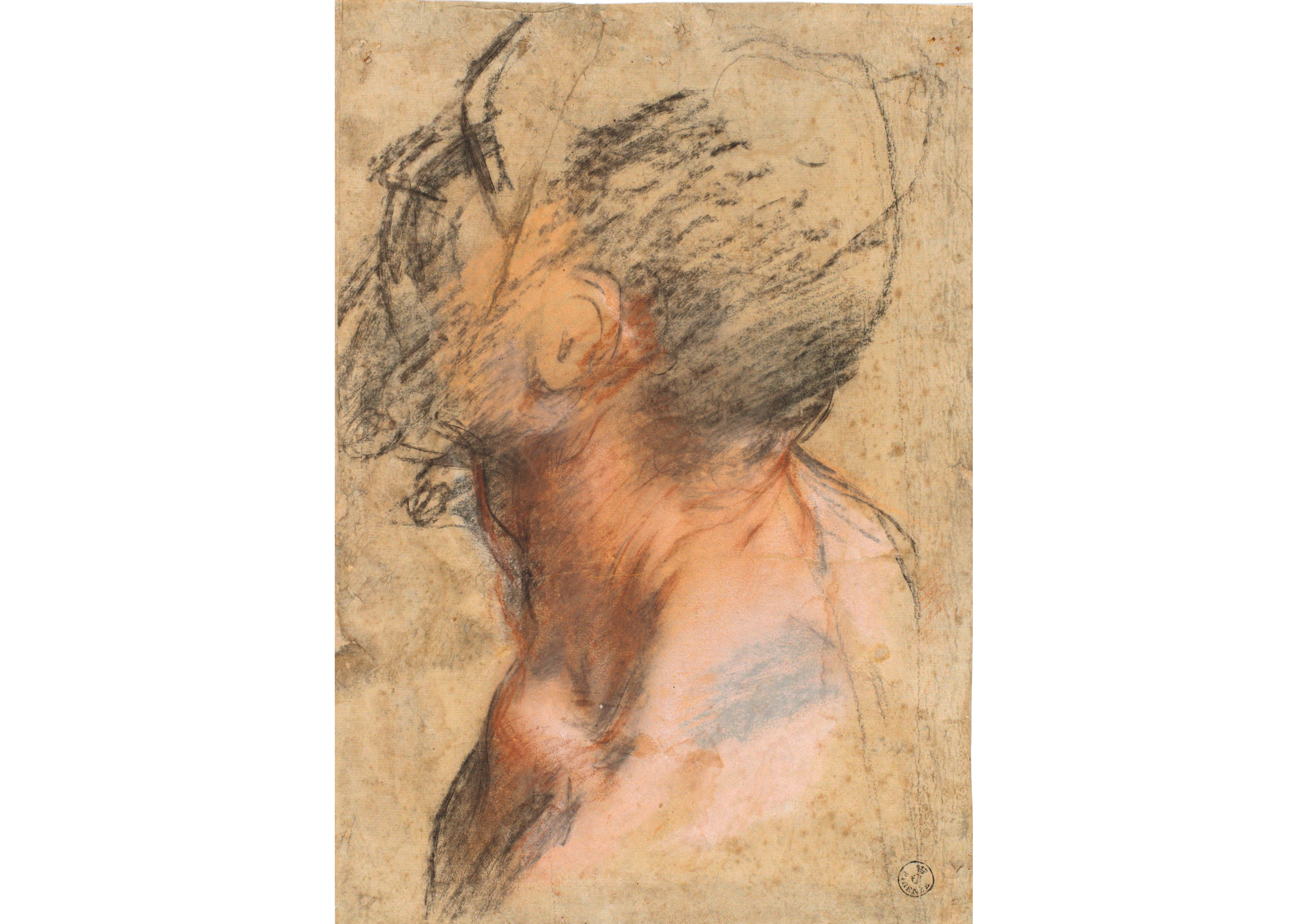 Inv. 11397 FIn questo studio, caratterizzato da un’estrema libertà formale ed espressiva, la fisionomia del volto è restituita soltanto da un segno largo e sgranato del carboncino, mentre con il pastello rosa, combinato alla pietra rossa e al gessetto bianco, l'artista ricrea attentamente l’effetto dell’epidermide investita dalla luce.