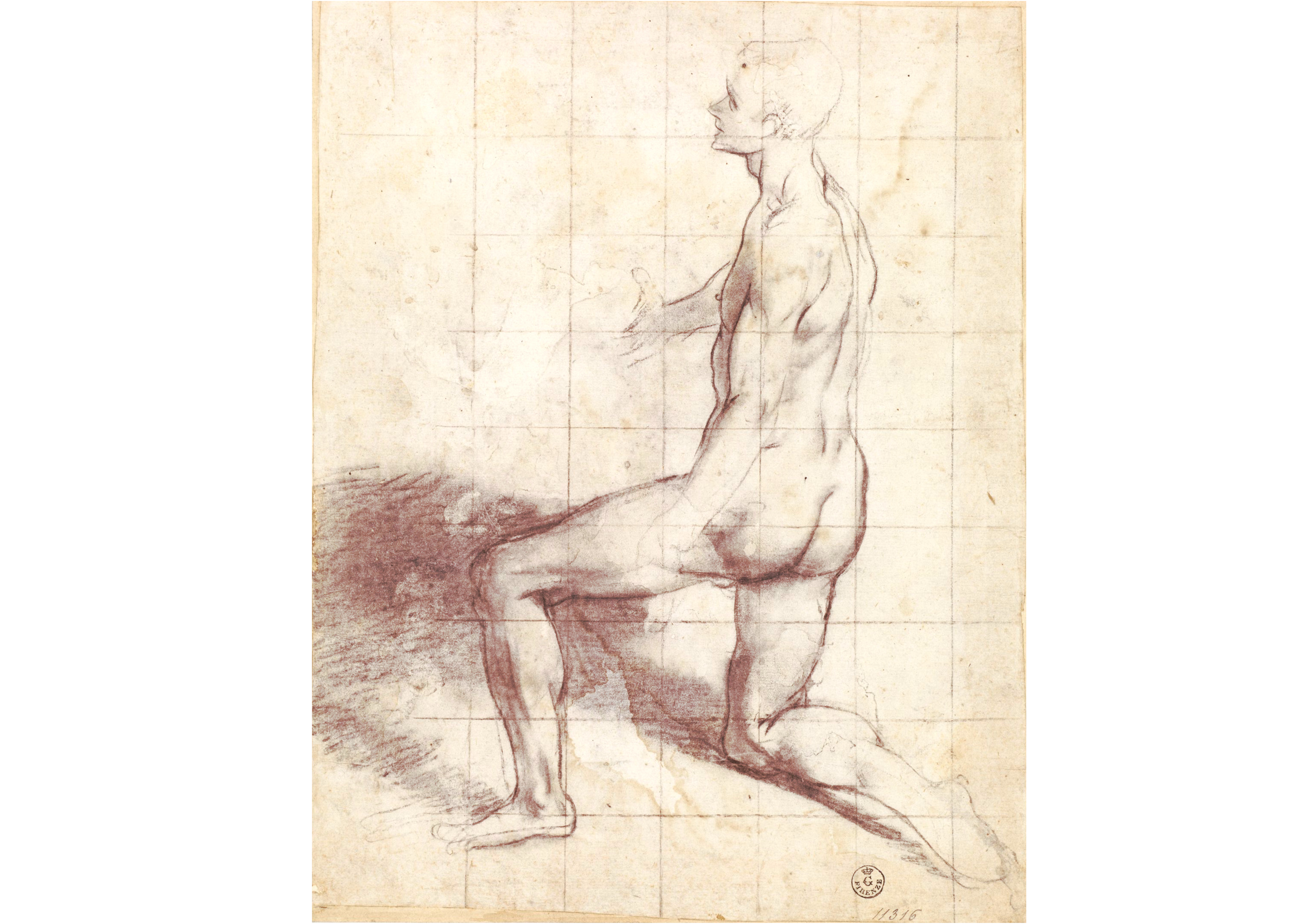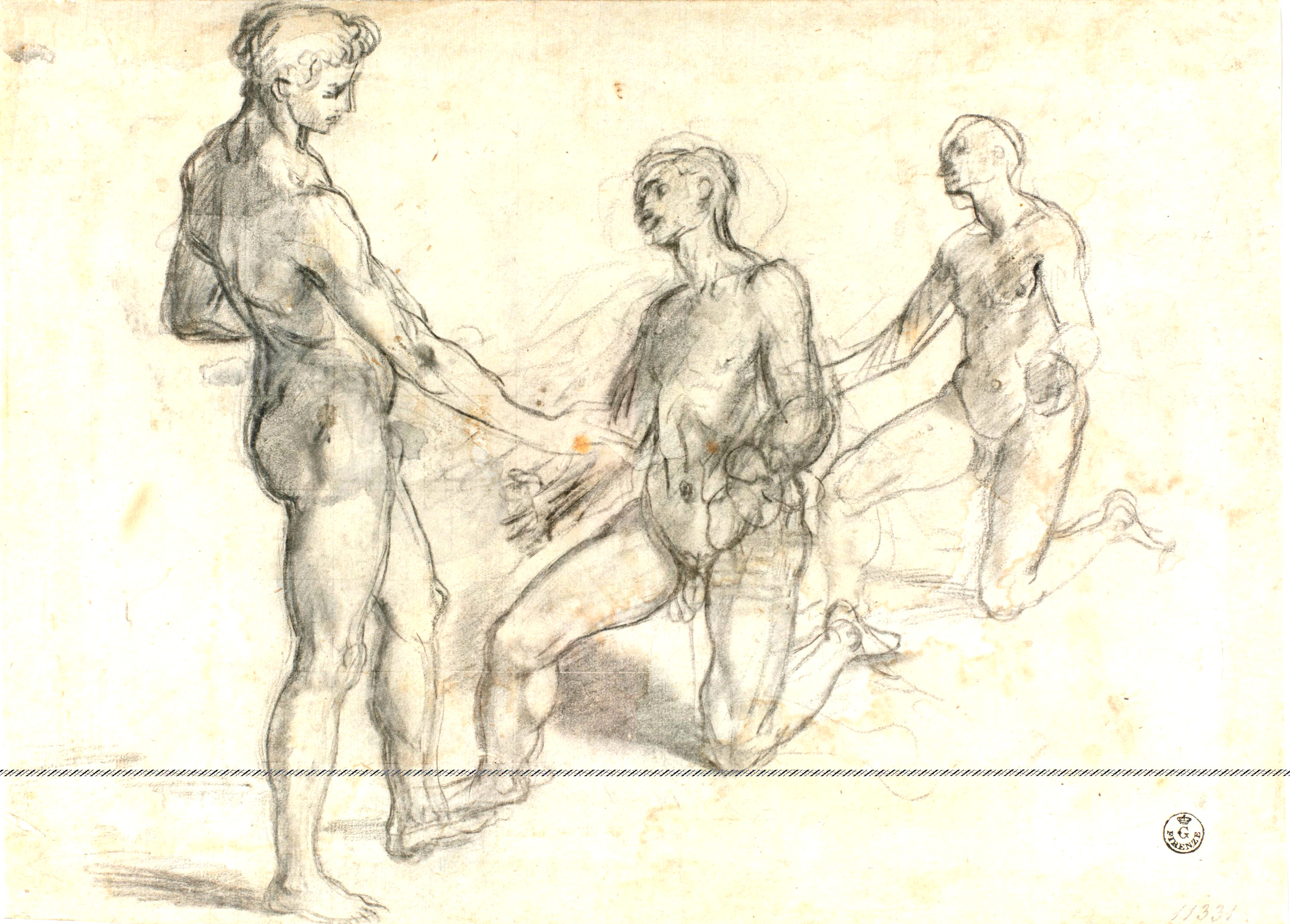 - 14/34Uno studio di figura maschile nuda in piedi e due di figura maschile nuda inginocchiata