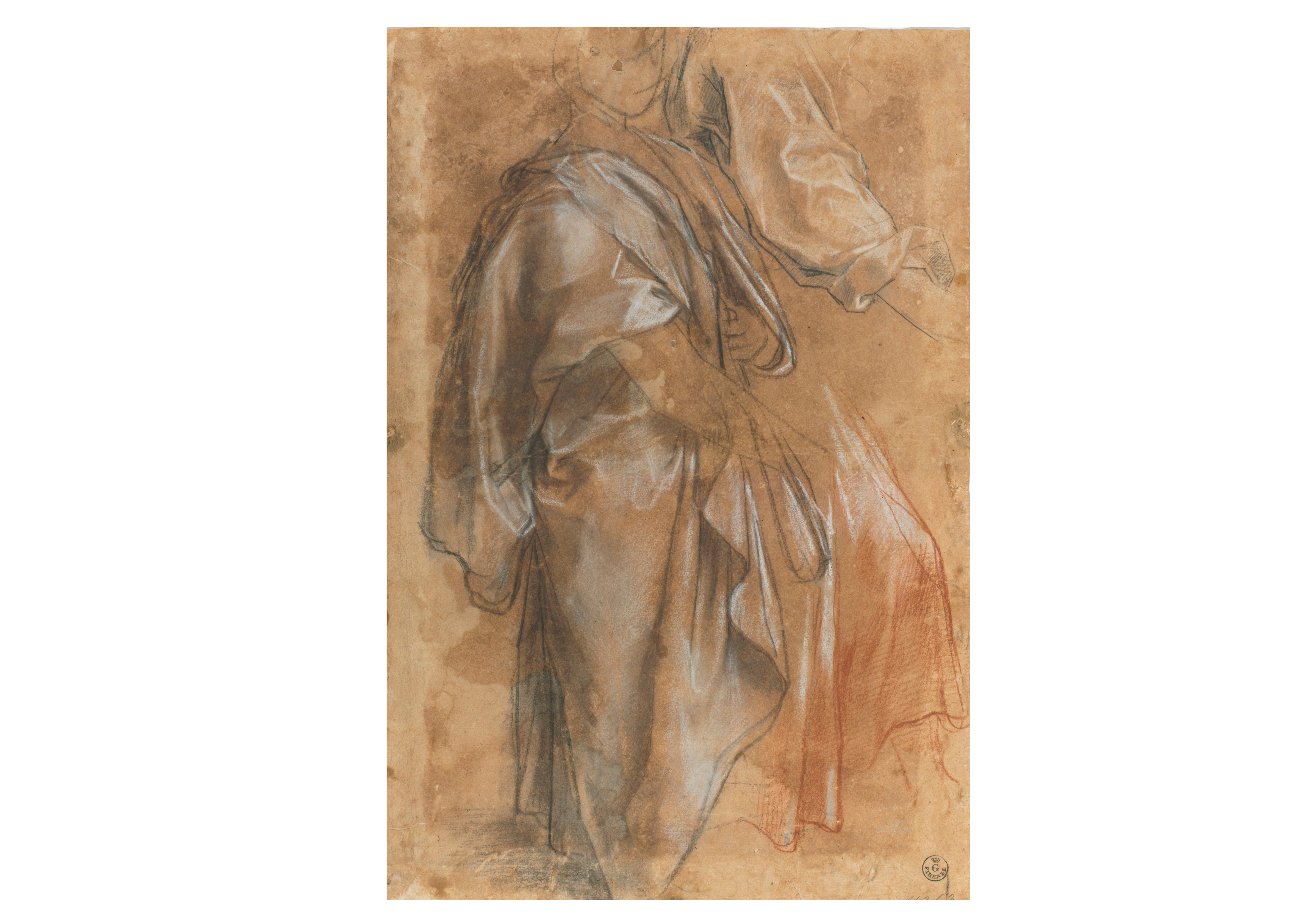 Il disegno, preparatorio per gli affreschi del Casino di Pio IV (1561 - 1563) - importante commissione papale ricevuta durante il secondo soggiorno romano - è uno dei pochi esempi in cui traspare in modo chiaro la presenza di un modello scolpito, anche se non è stato individuato un preciso prototipo di riferimento. Il foglio sembra mostrare l'interesse sia per esempi antichi, sia per la produzione coeva, come quella di Bartolomeo Ammannati a Villa Giulia. - 3/34Studio di panneggio