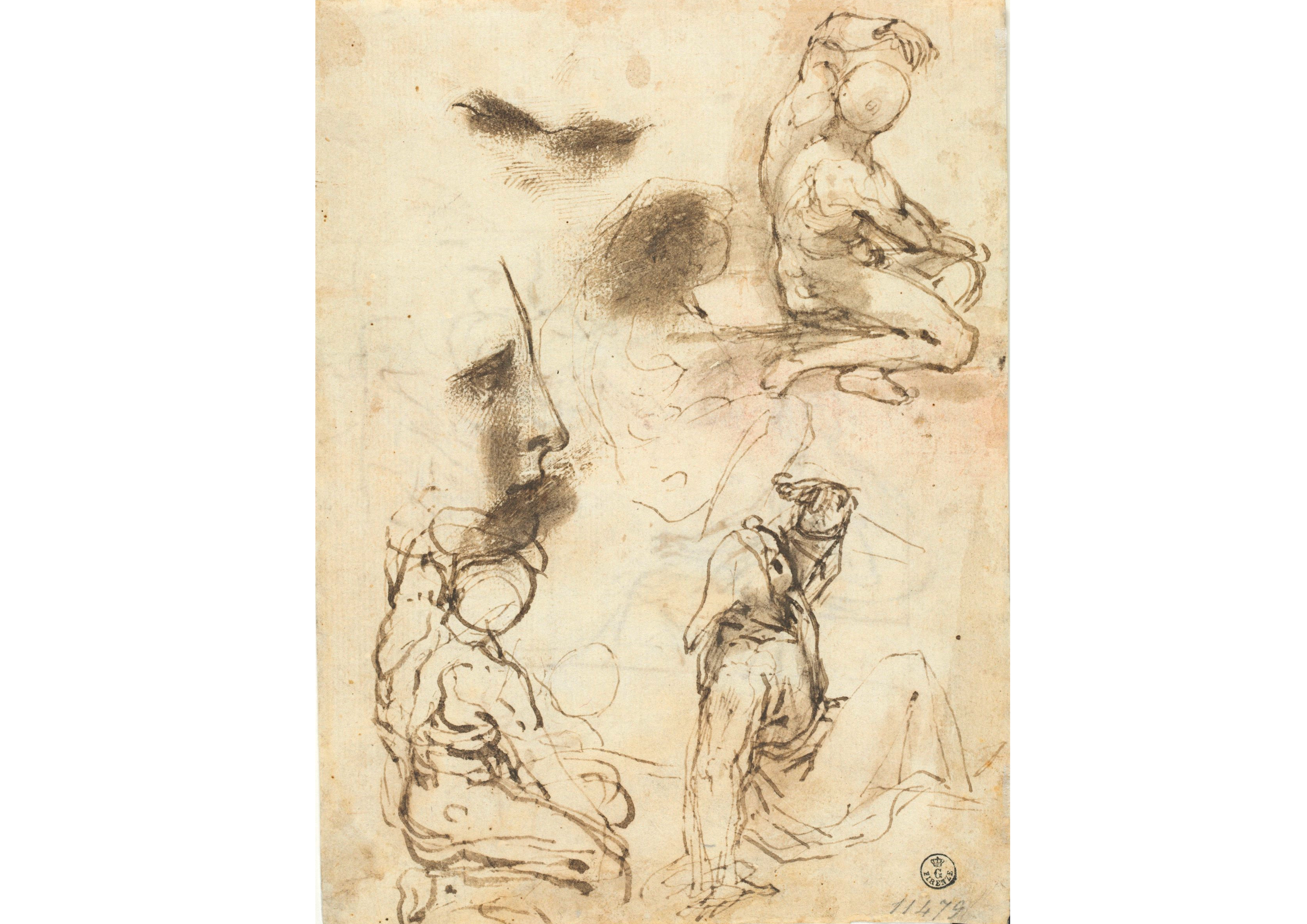 - 18/34Tre studi e uno schizzo di figura maschile sia nuda che vestita; volto di profilo