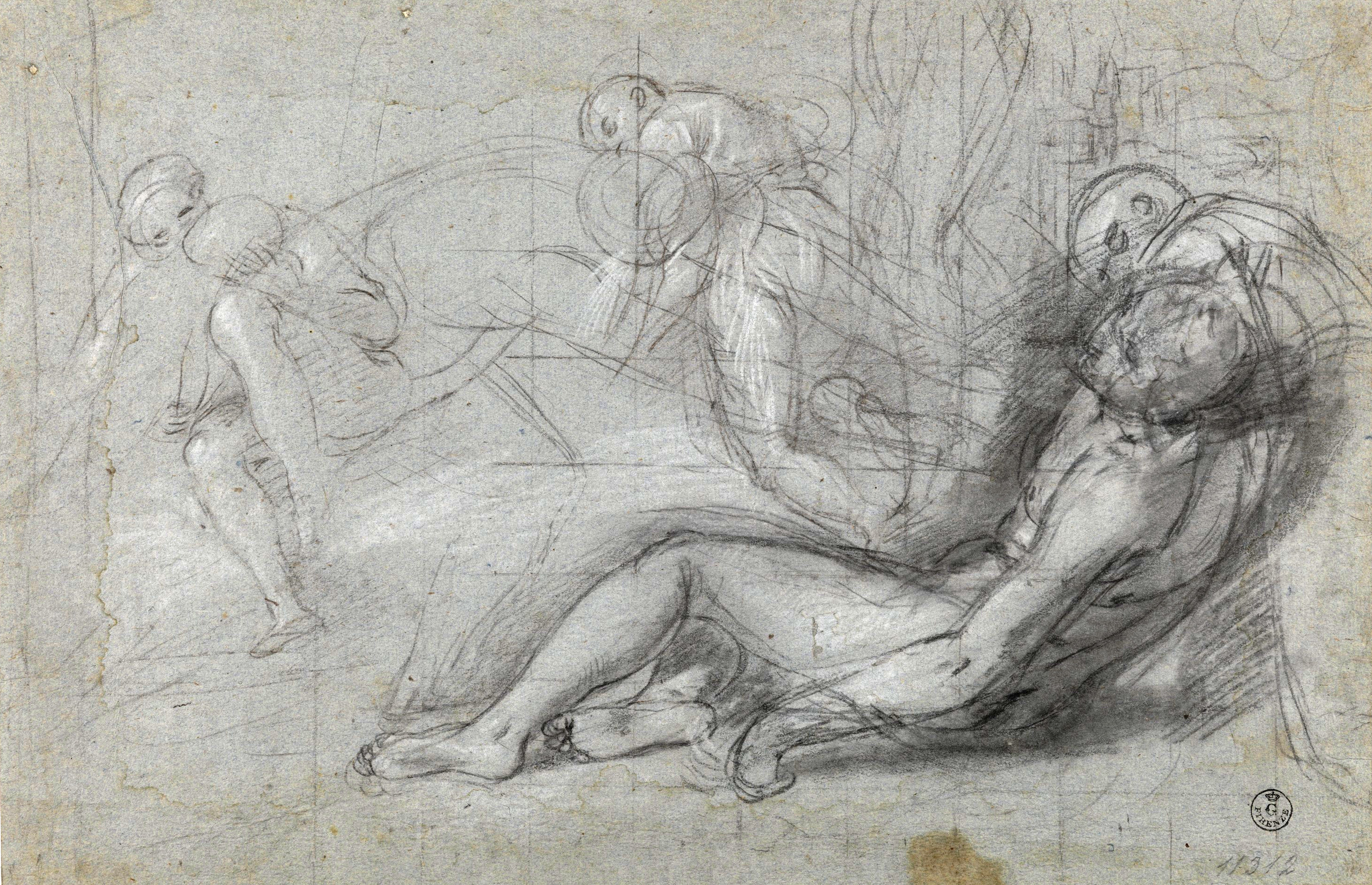 Inv. 11312 F rectoLa ripetizione variata riflette la velocità e la complessità del pensiero creativo che plasma progressivamente la figura, come dimostra il foglio per la 'Deposizione' del Duomo di Perugia (1568 - 1569). Barocci sperimenta alcune varianti per il rapporto tra la Vergine e la pia donna che la sorregge e analizza una delle pose sul modello nudo maschile. Ogni studio è caratterizzato da una propria specificità sia a livello stilistico che formale, ma allo stesso tempo risulta, nell’economia generale del foglio, subordinato a un unico intento progettuale.