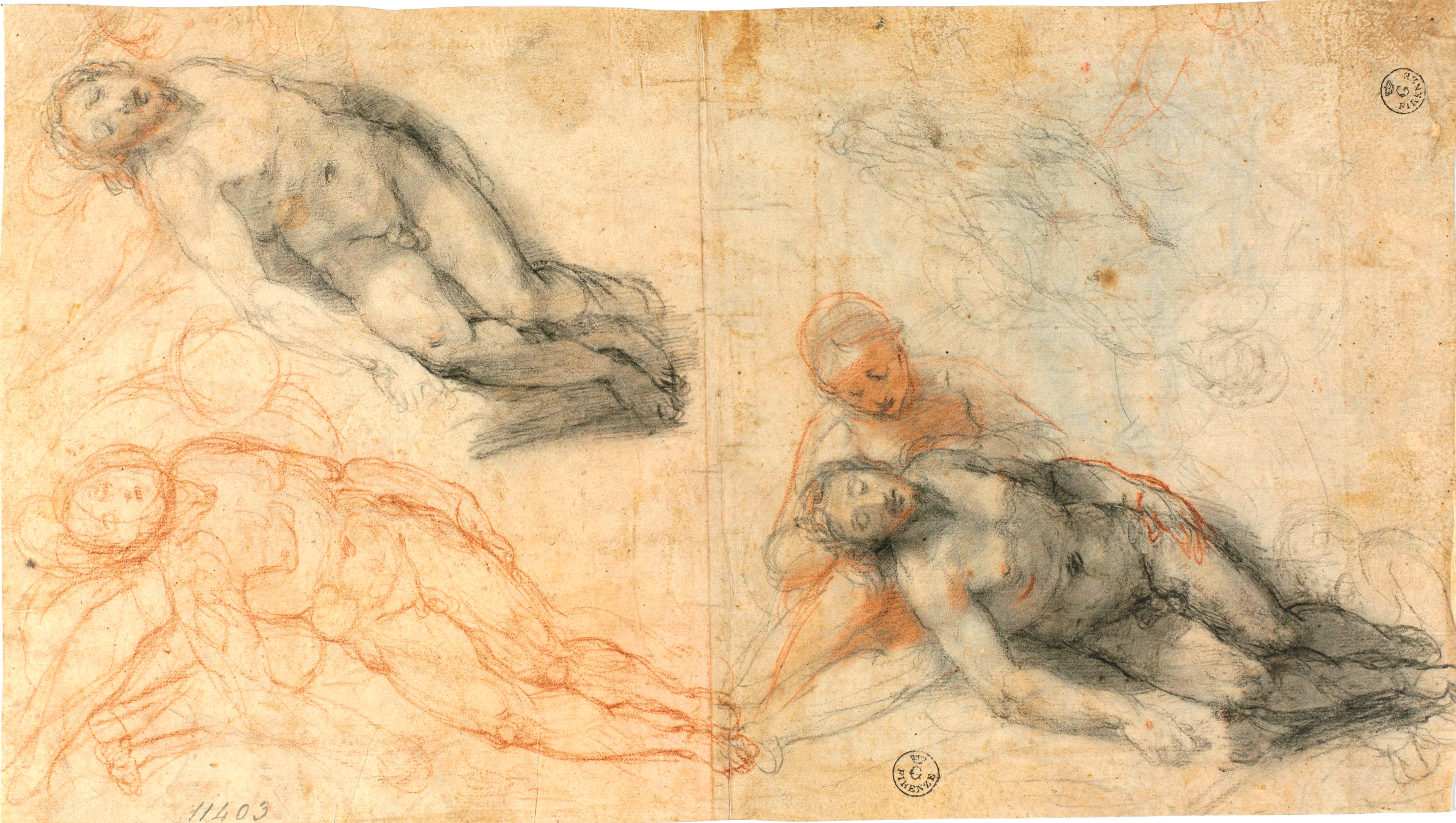 Inv. 11403 F rectoNel disegno per il 'Compianto su Cristo morto', commissionato intorno al 1600 e rimasto incompiuto, Barocci ripete diverse volte la medesima soluzione, partendo da un tracciato a puro contorno per arrivare a un’analisi degli elementi anatomici e chiaroscurali. Alla definizione delle figure concorre in modo determinante l’attenzione ai minimi mutamenti posturali ed espressivi, visibili nel passaggio da uno studio all’altro, ma anche all’interno di ciascuno di essi grazie alla sovrapposizione del tracciato a pietra nera con quello a pietra rossa.