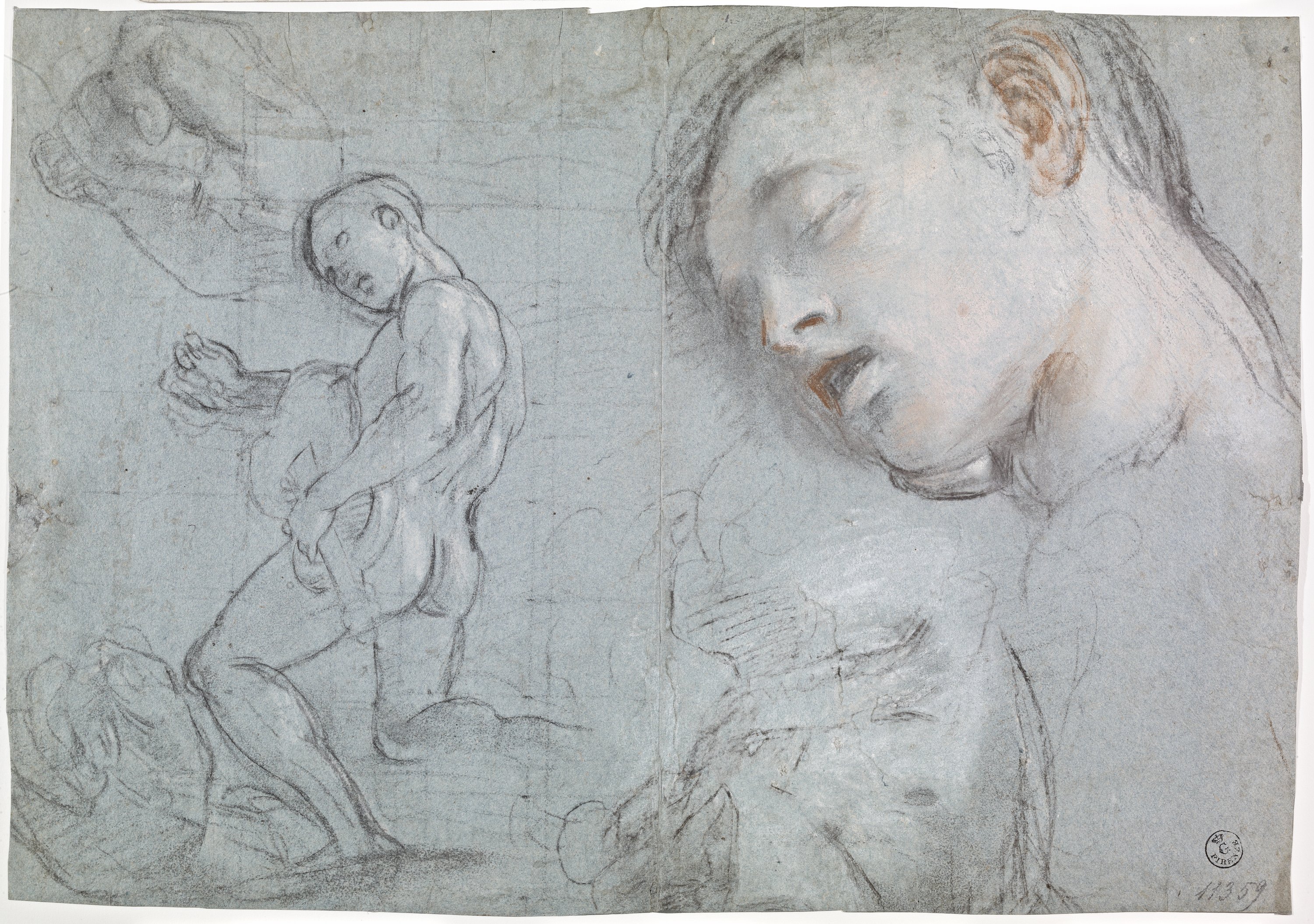 Pietra nera, carboncino, pietra rossa, pastello rosa, biacca (carbonato basico di piombo), carta cerulea