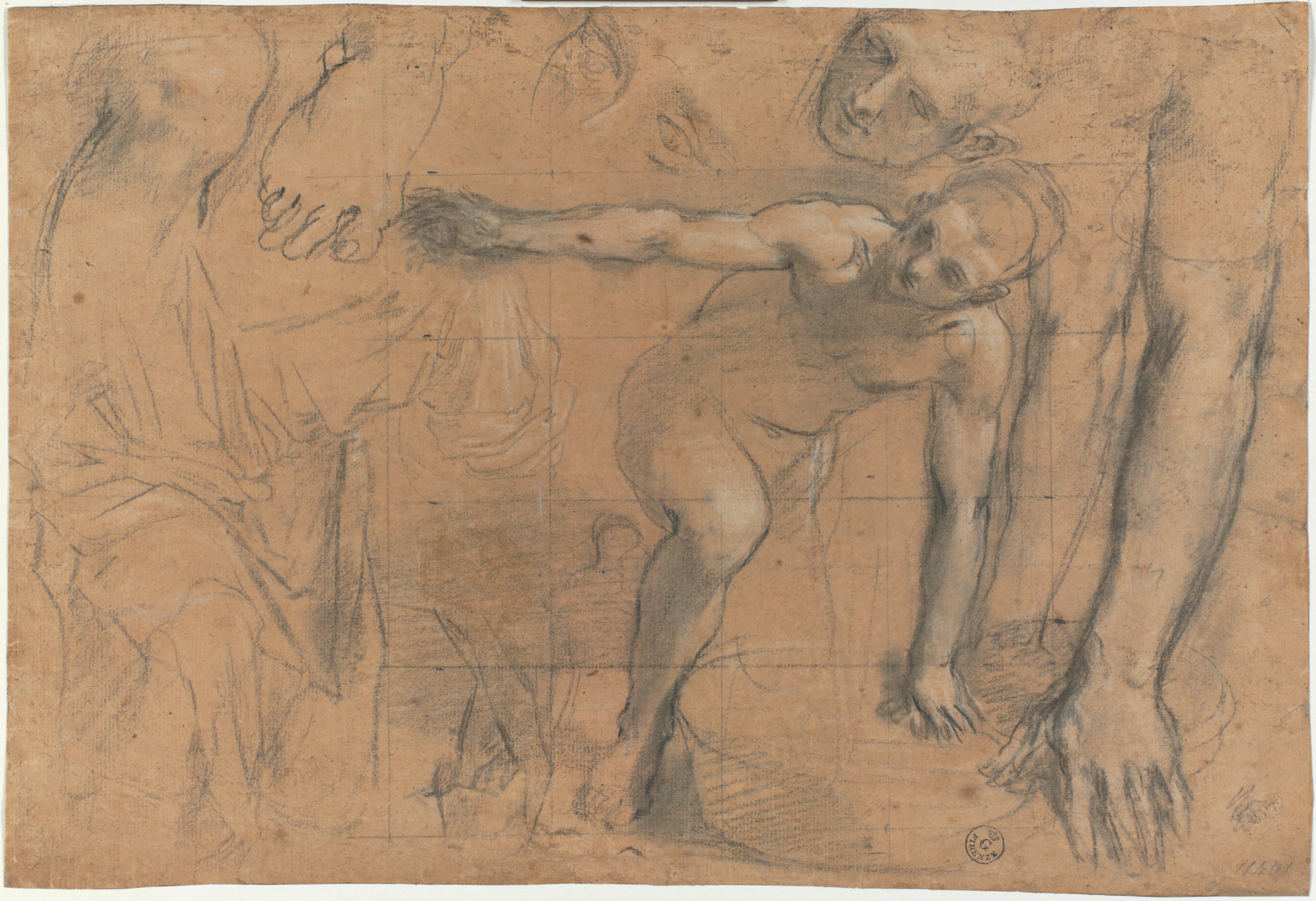 - 27/34Studio parziale di due figure maschili nude, una con un braccio alzato, l’altra a terra e studi della gamba e del braccio della prima