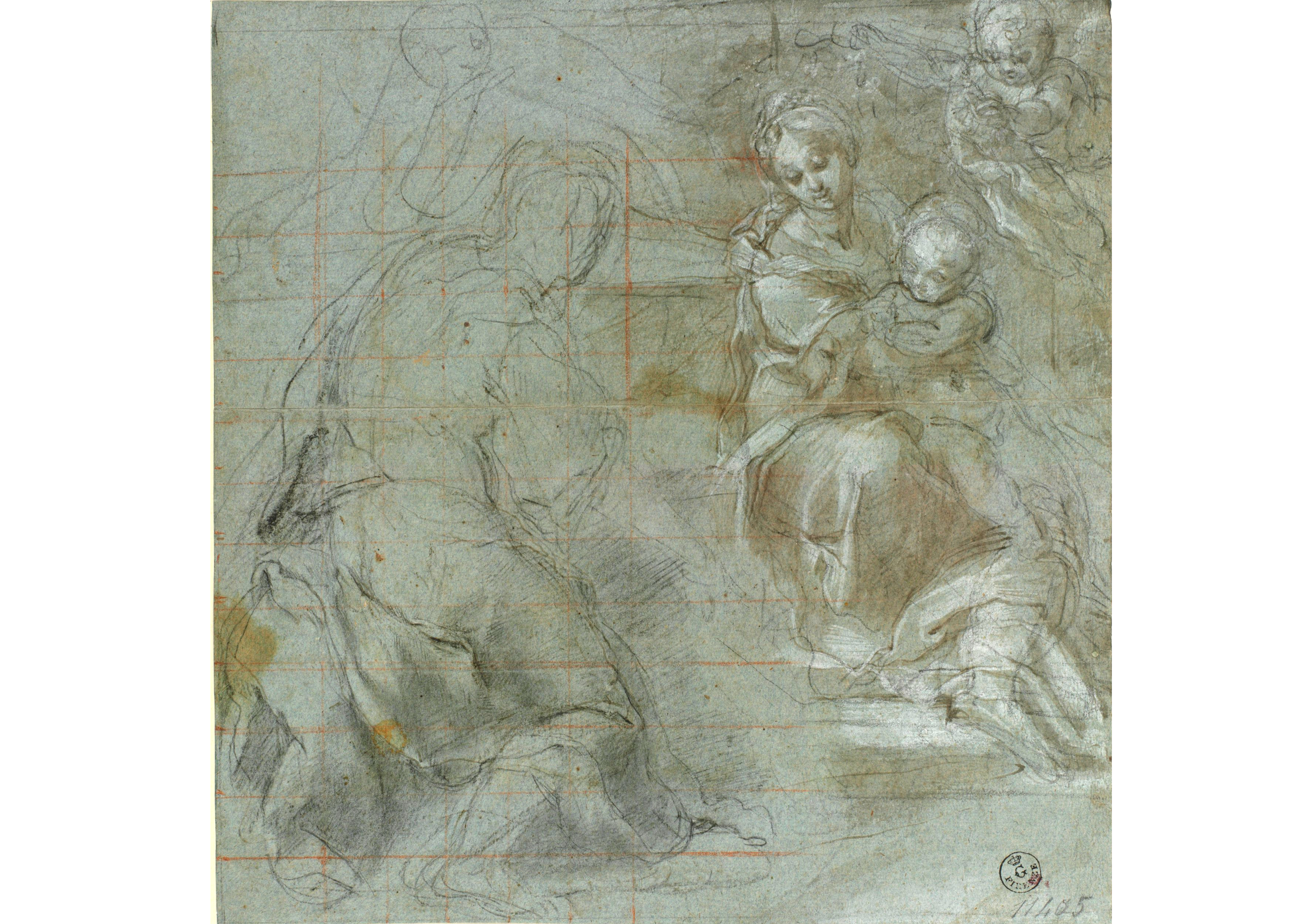 Inv. 11414 F rectoLo stretto legame che unisce le diverse fasi progettuali è evidenziato da due disegni per la 'Sacra Famiglia' affrescata al centro della volta della prima sala del Casino di Pio IV a Roma (1561 - 1563).