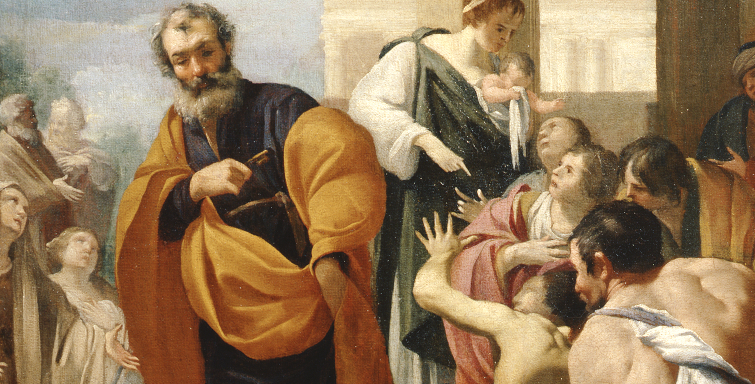 Gallerie degli Uffizi, Galleria delle Statue e delle Pitture, depositi, inv. 1890, no. 1018Molti segni e prodigi avvenivano fra il popolo per opera degli apostoli. Tutti erano soliti stare insieme nel portico di Salomone, nessuno degli altri osava associarsi a loro, ma il popolo li esaltava. Sempre più, però, venivano aggiunti credenti al Signore, una moltitudine di uomini e di donne, tanto che portavano gli ammalati persino nelle piazze , ponendoli su lettucci e barelle, perchè quando Pietro passava, almeno la sua ombra coprisse qualcuno di loro. Anche la folla delle città vicino a Gerusalemme accorreva, portando malati e persone da spiriti impuri, e tutti venivano guariti.
