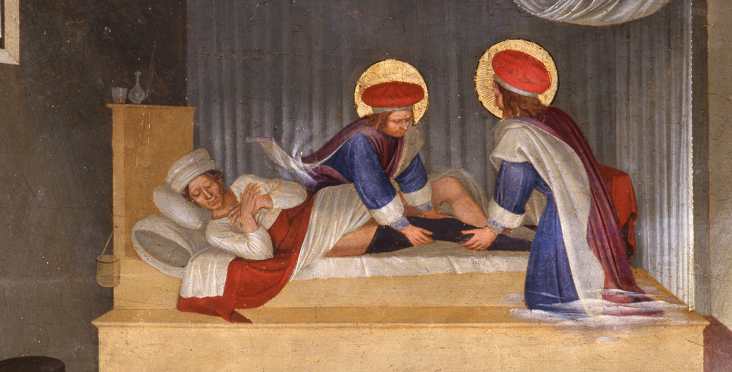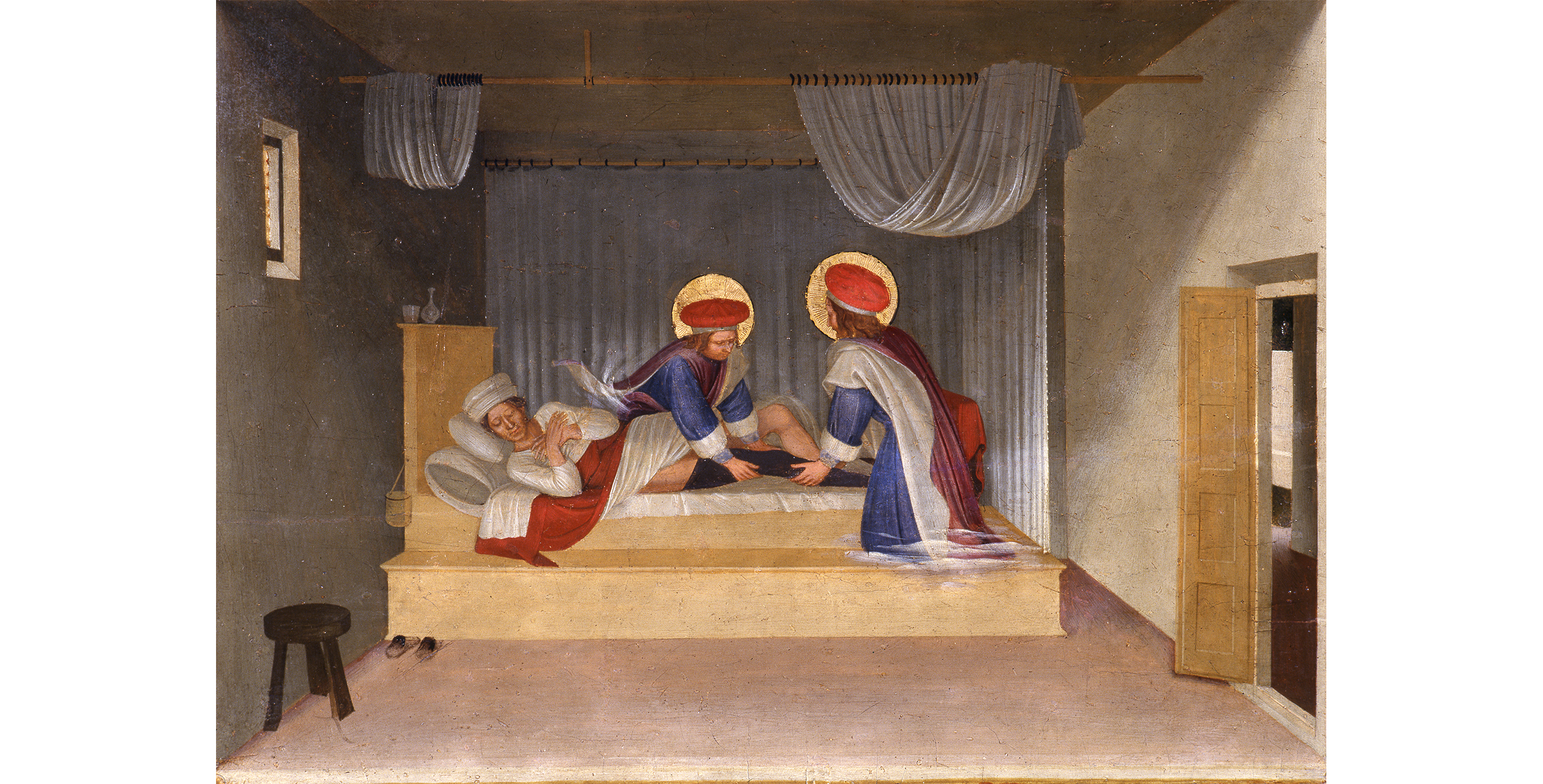 Firenze, Museo di San Marco, Inv. 1890 no. 8495Il dipinto illustra un miracolo compiuto dai santi medici Cosma e Damiano dopo il loro martirio, avvenuto intorno al 303. All’inizio del VI secolo, papa Felice IV aveva fatto edificare a Roma una basilica in onore dei due fratelli martiri, ancora oggi esistente. Si narra che il guardiano della chiesa, il diacono Giustiniano, avesse una gamba molto malata. Una notte sognò i santi Cosma e Damiano che con i loro strumenti, un coltello e alcuni unguenti, si recavano nel cimitero di San Pietro in Vincoli per trovare una gamba sana da trapiantare a Giustiniano al posto di quella malata. La scena illustra i due santi che attaccano la nuova gamba, mentre Giustiniano dorme. Poiché il cadavere da cui era stata presa la gamba sana era quello di un etiope, il nuovo arto ha la pelle scura, caratteristica che rende visivamente evidente il prodigio compiuto. Al risveglio, Giustiniano si trovò guarito della sua infermità e il miracolo contribuì ad acuire la fama dei due santi medici. L’eccezionale evento, narrato nella Legenda aurea (sec. XIII), restituisce dignità alla chirurgia, arte guardata con sospetto e disgusto per gran parte del Medioevo, praticata da cerusici e barbieri. Nel corso del Rinascimento, la riscoperta dei trattati di medicina greci e latini e l’affermazione dell’anatomia come disciplina scientifica posero le basi per l’avanzamento della professione medica e chirurgica. Il dipinto concludeva la narrazione della vita dei santi Cosma e Damiano illustrata dal Beato Angelico nella predella della pala dell’altare maggiore della Basilica di San Marco a Firenze, commissionata da Cosimo il Vecchio e da suo fratello Lorenzo de’ Medici. I due santi medici, in virtù dell’assonanza fra la loro professione e il cognome della casata, erano stati scelti come santi protettori dalla famiglia fiorentina, che fece spesso raffigurare la loro effigie nelle opere sacre commissionate.