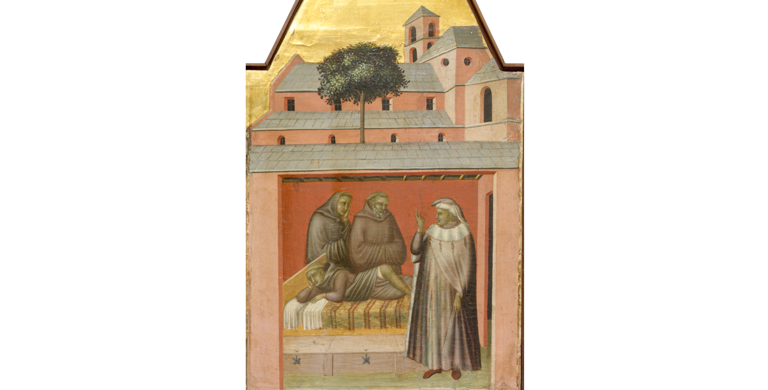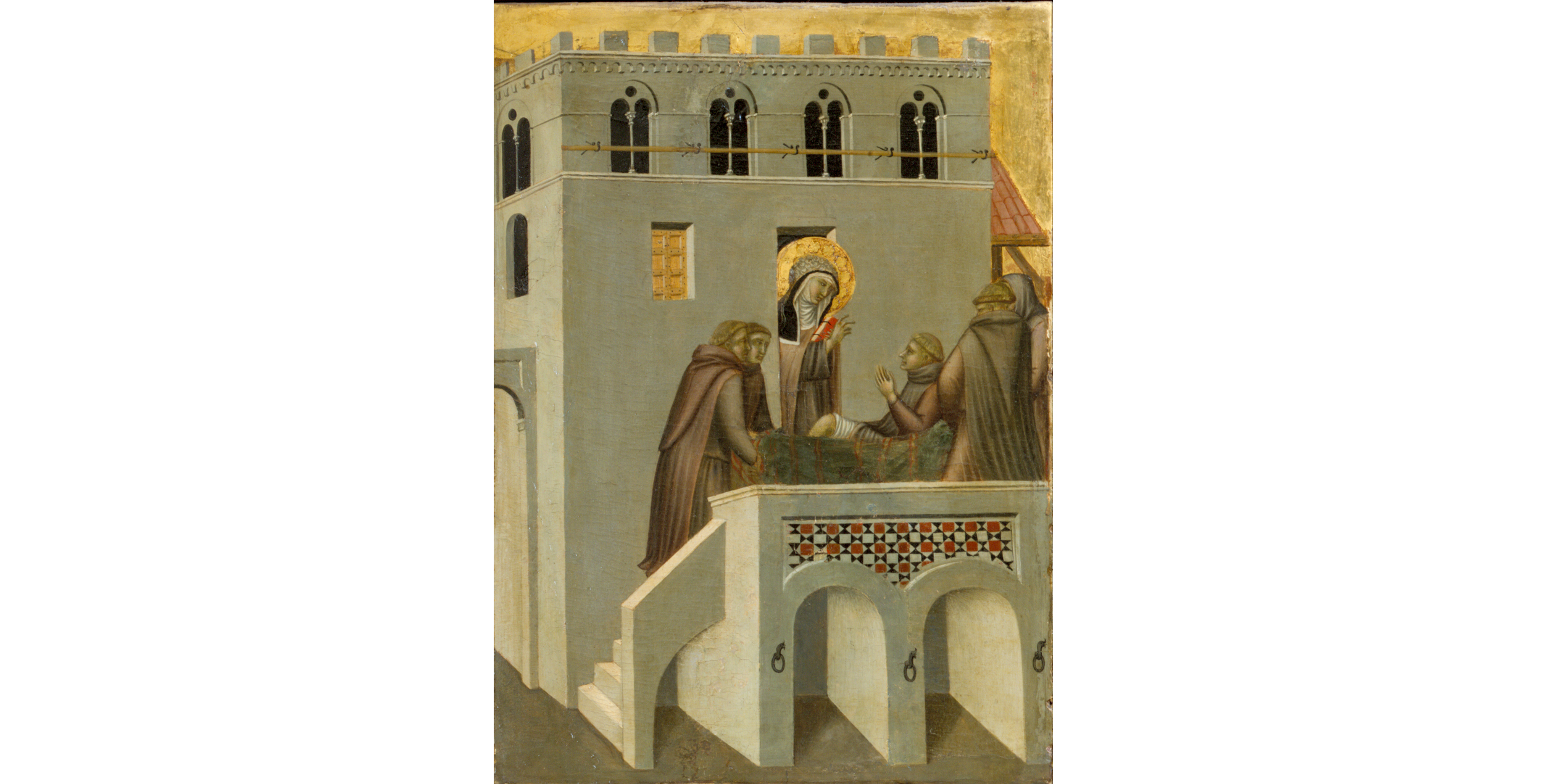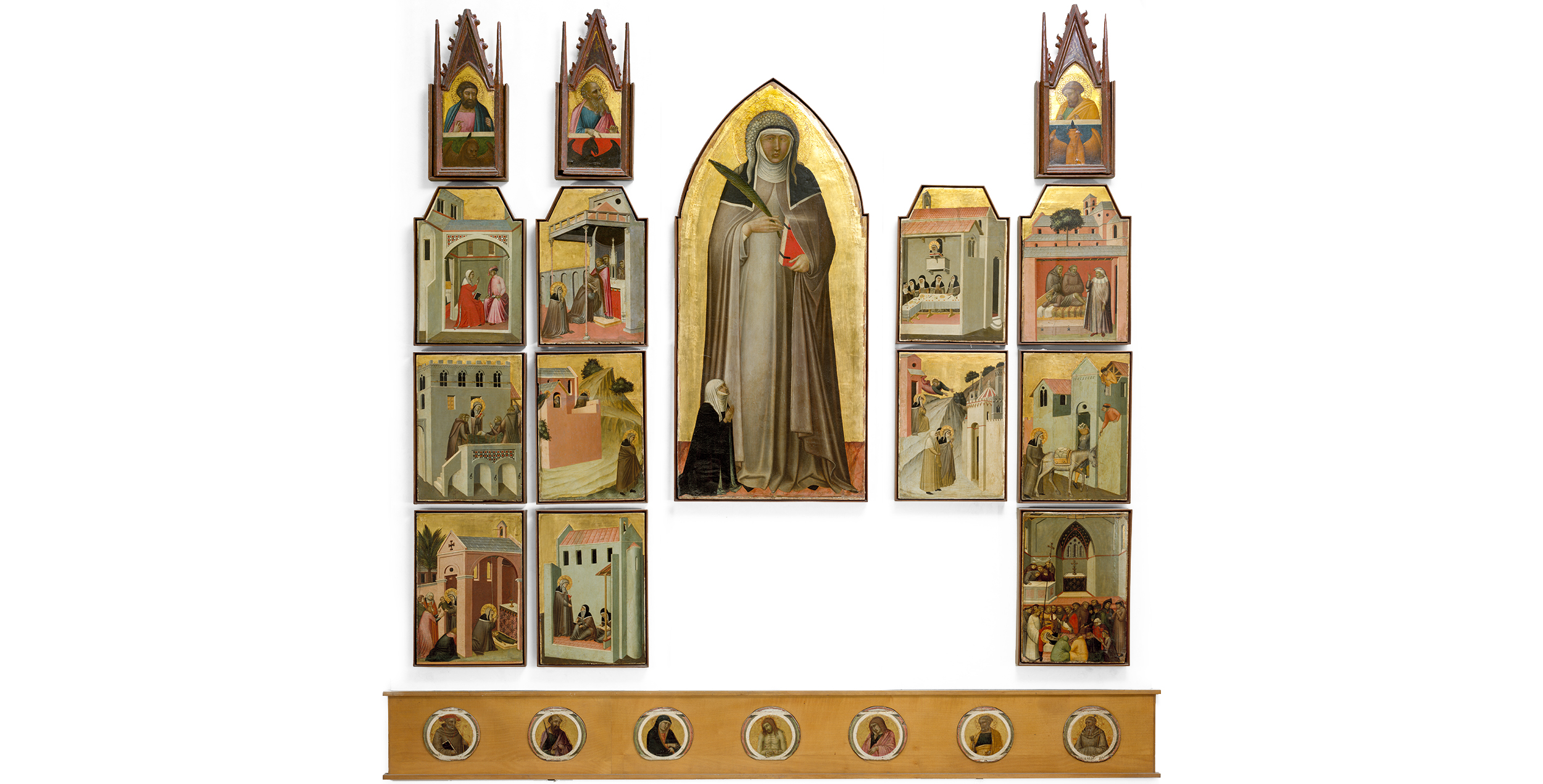 Santa Umiltà da Faenza, al secolo Rosanese Negusanti (Faenza 1226 – Firenze 1310), discendeva da una illustre casata di Faenza. Maritata con Ugolotto de’ Caccianemici, dopo vari anni di matrimonio scelse di abbracciare la vita religiosa, convincendo anche il marito a prendere i voti. Eventi miracolosi di cui fu protagonista, la resero famosa per santità fra i suoi conterranei. Dopo aver ricevuto un’apparizione di san Giovanni evangelista, si trasferì con alcune consorelle a Firenze, dove nel 1282 fondò il primo monastero femminile vallombrosano della città, intitolato all’apostolo, e dove dispensò altri miracoli. Dopo la morte, le sue spoglie, traslate nel 1311 in un apposito sepolcro nella chiesa del monastero di San Giovanni Evangelista, divennero oggetto di venerazione. La pala d’altare dipinta da Pietro Lorenzetti sormontava probabilmente l’altare dedicato alla beata e costituisce la più antica effigie di Umiltà oggi nota. La monaca ha la testa circondata dal nimbo, emblema di santità, nonostante che Umiltà sia stata beatificata solo nel 1720. Vestita con l’abito dell’ordine benedettino vallombrosano, ha la testa coperta da una pelle d’agnello - il melote - sua peculiare caratteristica.Il polittico, privo di alcuni pannelli e della cornice, ha la struttura tipica della pala agiografica, con la santa raffigurata a figura intera al centro, contornata da riquadri con gli episodi più salienti della sua vita. Questa tipologia, derivata da modelli dell’oriente cristiano, ebbe notevole sviluppo in Italia fra il XIII e il XV secolo. Spesso realizzate per essere poste in prossimità delle reliquie del santo raffigurato, queste immagini acquistavano la stessa sacralità delle reliquie e, di conseguenza, gli stessi poteri taumaturgici ad esse riferite. Vi sono spesso riprodotti miracoli con guarigioni e resurrezioni che richiamavano i devoti e incentivavano le elemosine e le donazioni, necessarie al sostentamento delle chiese e dei monasteri.