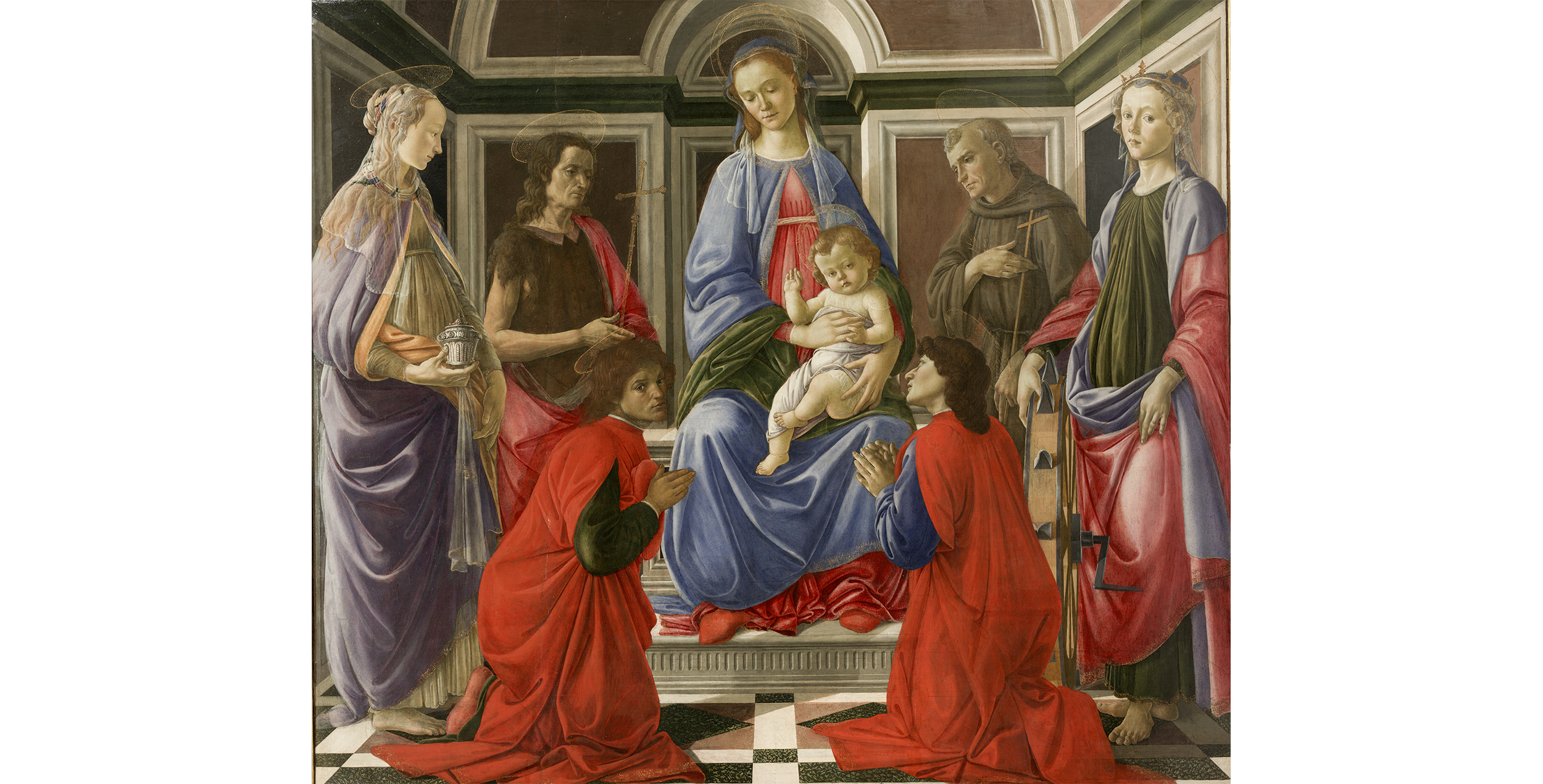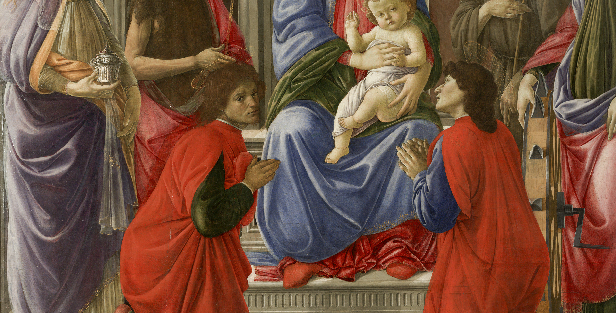 Gallerie degli Uffizi, Galleria delle Statue e delle Pitture, sala 10-14, Inv. 1890 no. 8657Fra i numerosi santi raccolti in sacra conversazione attorno alla Madonna con Gesù bambino, spiccano in primo piano i fratelli martiri Cosma e Damiano, raffigurati in ginocchio davanti al trono e identificati dal nome scritto in basso, in lettere capitali. Vissuti nei territori sudorientali dell’impero romano nel III secolo e martirizzati sotto l’imperatore Diocleziano, i due santi sono tradizionalmente rappresentati in coppia e vestiti con la toga rossa che li denota come personaggi eminenti e di rango, nello specifico medici. La toga rossa era abbinata ad un copricapo dello stesso colore, il tocco, che nel dipinto di Sandro Botticelli san Cosma stringe al petto. Sono invece qui assenti gli utensili attinenti alla professione medica, come vasi per unguenti e strumenti chirurgici, che non di rado caratterizzano l’iconografia dei due martiri.