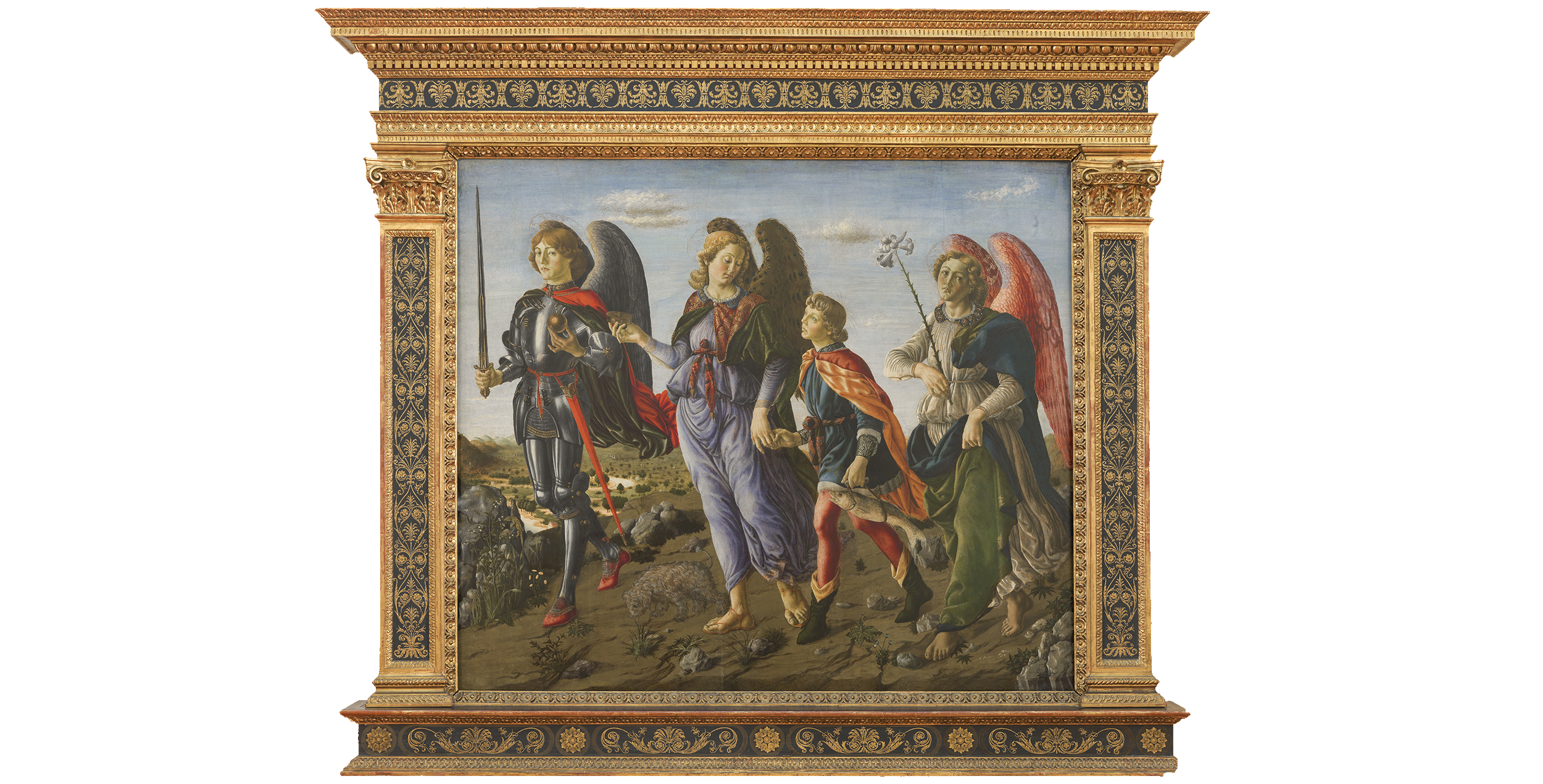 Gallerie degli Uffizi, Galleria delle Statue e delle Pitture, sala 15, inv. 1890 no. 8359In un paesaggio campestre, incedono i tre arcangeli, da sinistra Michele, con l’armatura del guerriero vittorioso sul demonio, Raffaele, angelo custode del giovane Tobiolo che lo accompagna, Gabriele, il messaggero che annunciò alla Vergine Maria il concepimento del Figlio di Dio.