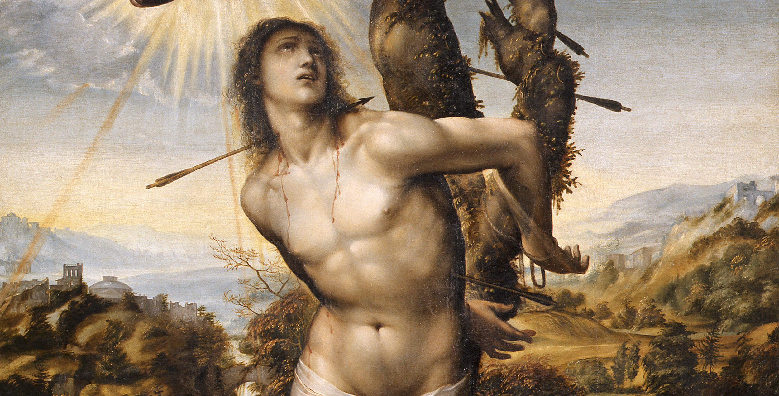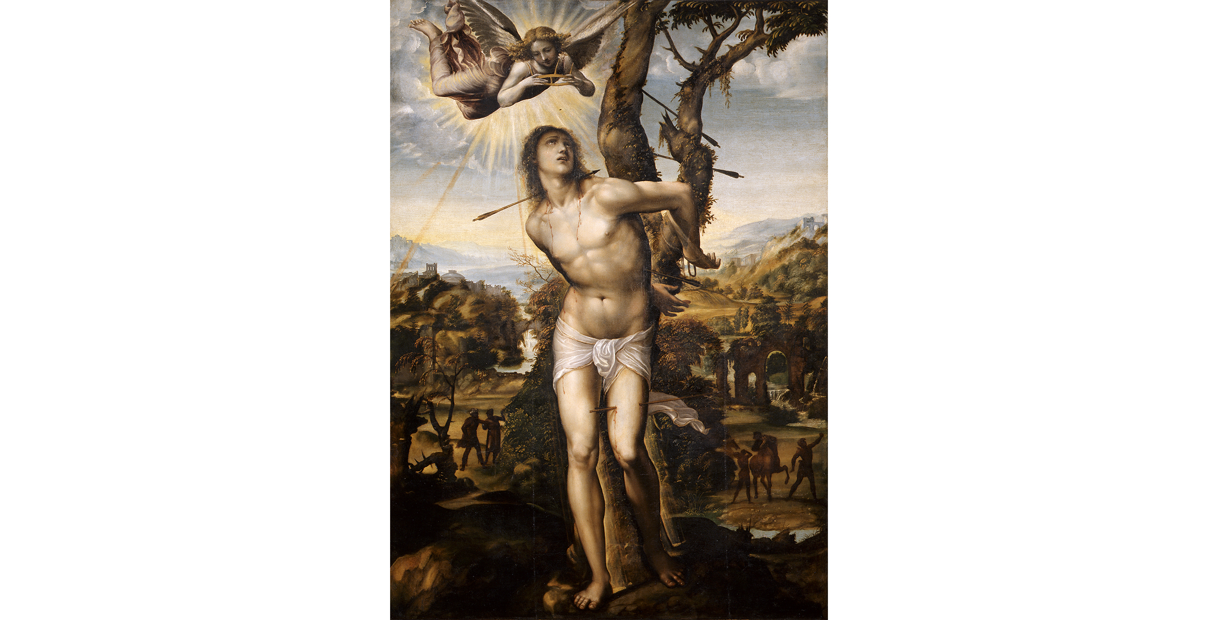 Sodoma fissa il protagonista in primo piano con una pittura luminosa e delicatamente chiaroscurata, su un fondo di paesaggio punteggiato di rovine antiche, di quelli che aveva imparato a conoscere a Roma, guardando l’esempio di Raffaello e dei suoi allievi. Il mito del santo, che gli agiografi definivano “athleta Christi”, coincideva- specialmente nella sensibilità rinascimentale- con il richiamo a un corpo perfetto e atletico, che si torce nel dolore seguendo la forma del tronco che lo vincola. Per trovare il giusto punto di perfezione formale e al tempo stesso incarnare l’espressione del dramma, Sodoma, come i suoi contemporanei, aveva a disposizione la vasta gamma di statuaria antica greco romana, inesausto serbatoio di modelli e forme. Più di tutte valeva il richiamo alla scultura più celebrata e copiata a Roma nel Cinquecento: il Laocoonte, il gruppo in marmo ritrovato nel 1506 sul colle Oppio e subito investito di una formidabile e duratura fortuna iconografica. L’icona del santo, languido nella sofferenza, il volto bellissimo solcato dalle lacrime mentre riceve dall’angelo la corona del martirio, era la prima ad apparire ai fedeli nel corso delle processioni, sollecitandone i più emozionati sensi di pietà e di fede.