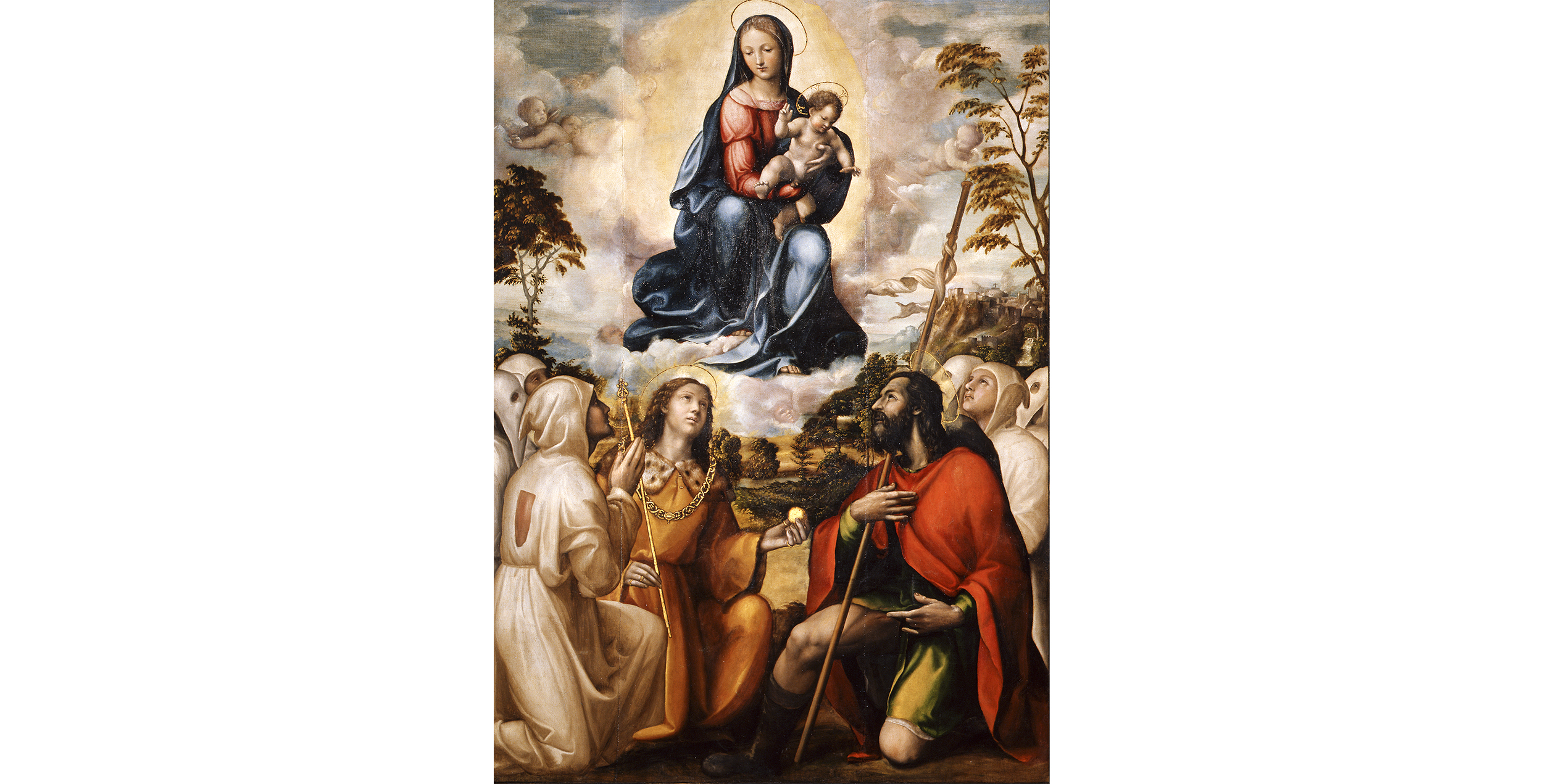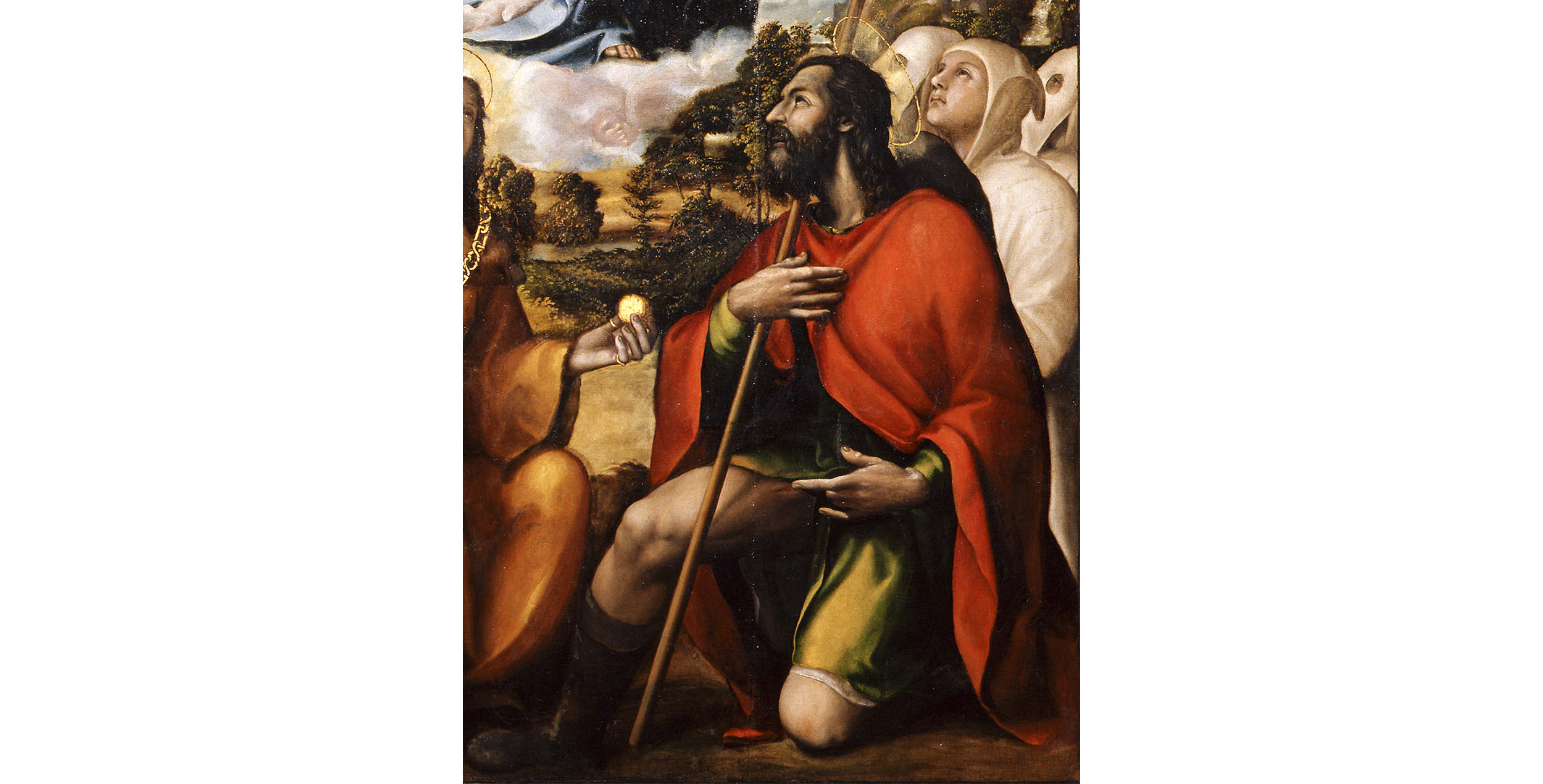 In particolare San Rocco (Montepellier 1345/1350- Angera?, Varese 1376/79) è un’altra figura tradizionalmente legata al contesto delle guarigioni per il suo ruolo di protettore contro la peste. La leggenda vuole che Rocco, in pellegrinaggio verso Roma, dopo aver donato tutti i suoi beni ai poveri, sostò ad Acquapendente, presso Viterbo, dedicandosi all’assistenza degli ammalati e operando guarigioni miracolose che diffusero la sua fama. Ammalatosi lui stesso di peste, guarì e riprese il suo cammino e le sue opere di bene. Rocco sarebbe morto in prigione, dopo essere stato arrestato presso Angera da alcuni soldati, perchè persona sospetta. Il suo culto si diffuse straordinariamente nell’Italia del nord, specialmente in Lombardia. Sodoma raffigura il Santo col bastone da pellegrino e l’angelo suoi tradizionali attributi, mentre indica sulla gamba destra il ‘bubbone’, il gonfiore tumefatto marchio della terribile peste nera. Ai lati di Sigismondo e Rocco, vestiti di tunica e cappuccio bianchi, si dispongono i confratelli di Porta Camollia, ministri di quel conforto morale e corporale sentito come un dovere civico e che ancora oggi sopravvive nella tradizione assistenziale toscana.