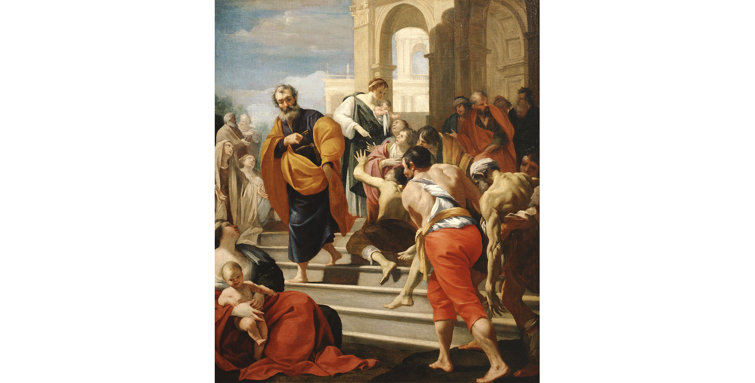 L'episodio raffigurato, tratto dagli Atti degli Apostoli e reso memorabile dall'affresco di Masaccio nella Cappella Brancacci in Santa Maria del Carmine a Firenze, conobbe una nuova fortuna iconografica nel secolo XVII in coincidenza con le terribili epidemie di peste che falcidiarono la popolazione. Nel dipinto Pietro, avvolto in un manto giallo e con in mano le chiavi, scende le scale del portico del Tempio proiettando la sua ombra su uno storpio prostrato ai suoi piedi, mentre tutt'intorno accorrono donne e uomini invocandone l'aiuto. In primo piano sulla sinistra, a mo' di quinta compositiva, una madre con in braccio un bambino sorridente, siede per terra rivolgendo lo sguardo verso San Pietro, fulcro radioso della scena, che nella sua fiera monumentalità ben incarna l'Apostolo designato da Cristo come “la pietra sulla quale costruire la Chiesa”(Matteo 16, 18). Sullo sfondo il monumentale portico del Tempio di Salomone col soffitto a cassettoni si apre su uno scenografico edificio di impronta classicheggiante.