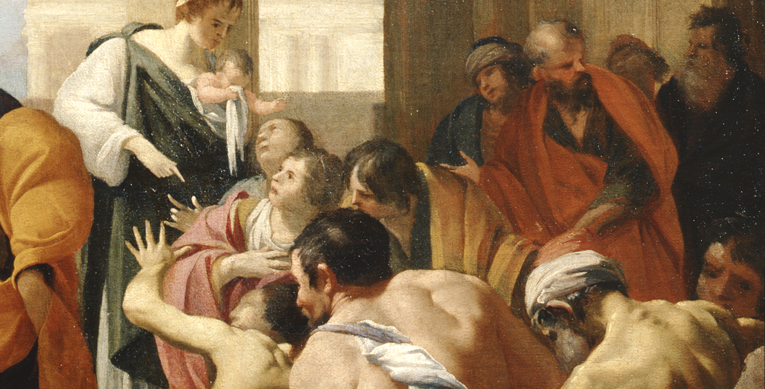 Sorprendono le varie gestualità e le diverse espressioni dei personaggi rappresentati, un’umanità derelitta che osserva una precisa disposizione rispetto alla figura di Cristo: gli infermi alla sua destra, dalla parte della mano che benedice e i bambini accompagnati dalle madri accorrono da sinistra, verso la mano che accoglie. Un gruppo di scettici farisei (“Allora gli si avvicinarono alcuni farisei per metterlo alla prova”, Mt 19, 3) apre la scena a sinistra e un cammello la chiude a destra sullo sfondo (“… è più facile che un cammello passi per la cruna di un ago, che un ricco entri nel regno dei cieli”, Mt 19, 13).