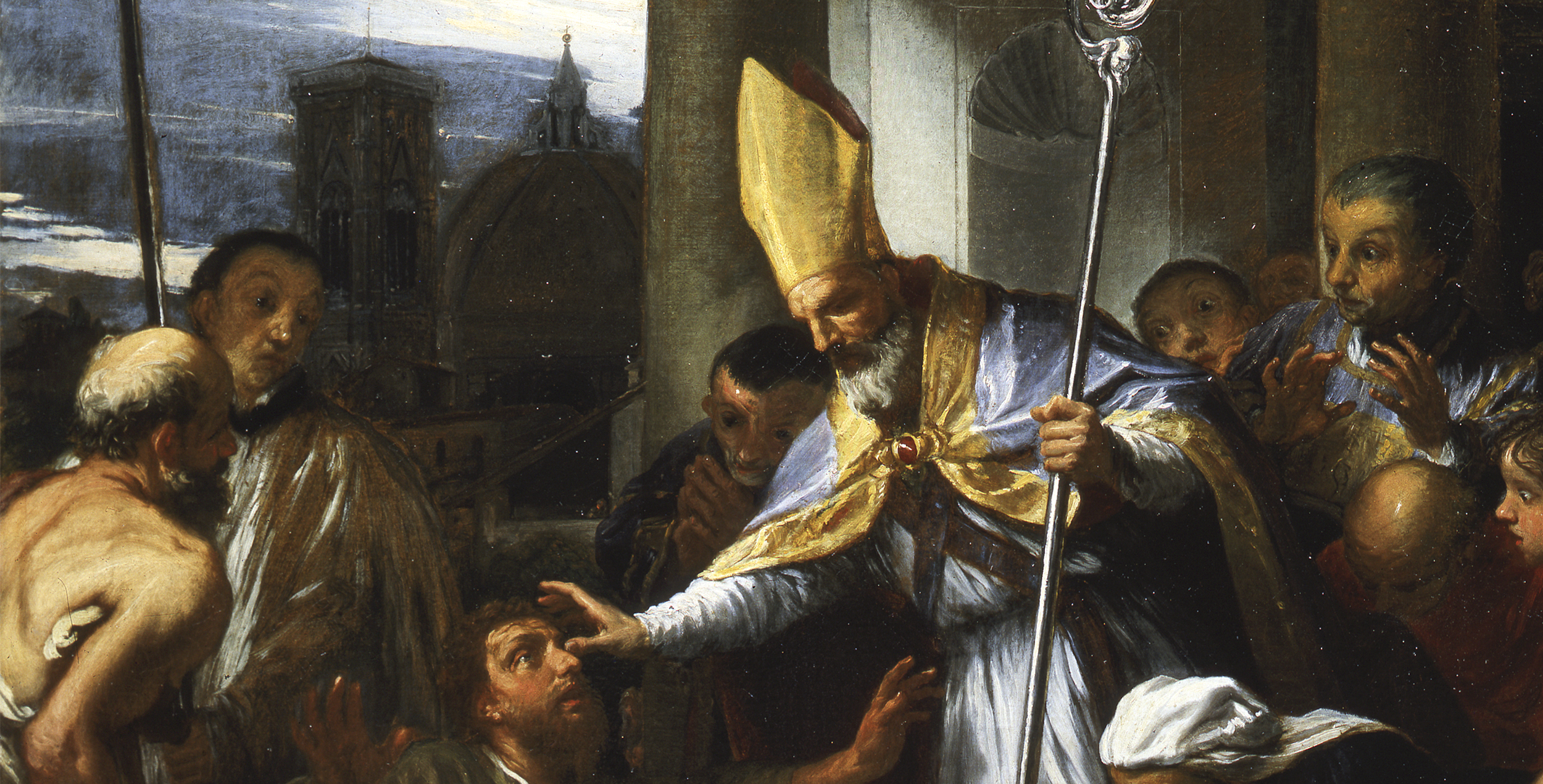 Palazzo Pitti, Galleria Palatina, sala di Berenice, Inv. Poggio Imperiale 1860 no. 1216La parabola del mendicante miracolosamente salvato dalla cecità è tra gli episodi della vita di San Zanobi più frequentemente rappresentato dagli artisti tra XV e XVII secolo. Al secondo vescovo di Firenze, vissuto nel IV secolo, venerato compatrono della città insieme ad Antonino e protettore dal 1651 dell’Accademia della Crusca, la tradizione popolare fiorentina riconosceva il compito di difensore dai morbi. La scena illustra il momento in cui il santo, sulla soglia della chiesa dove ha appena terminato di celebrare la messa, impone la mano sugli occhi del cieco, restituendogli la vista e guadagnando la sua conversione. Egli ci appare dunque non solo in veste di taumaturgo, ma anche come evangelizzatore delle terre orientali, secondo il dettato della tradizione agiografica. La semplicità del suo gesto, la compostezza severa del portamento, reso ancor più solenne dal fascio di luce che provenendo da sinistra si concentra su di lui, contrastano con l’animata reazione di uomini e donne tutt’intorno, dalla giovane madre seduta in terra ai chierici, fino ai due fanciulli a destra. Di ognuno di essi, il pittore fissa con una pittura rapida e narrativa, fatta di tocchi e contrasti di colore, l’espressione genuinamente sbigottita, gli occhi sgranati e quasi increduli di fronte all’improvvisa manifestazione di un potere soprannaturale e salvifico.