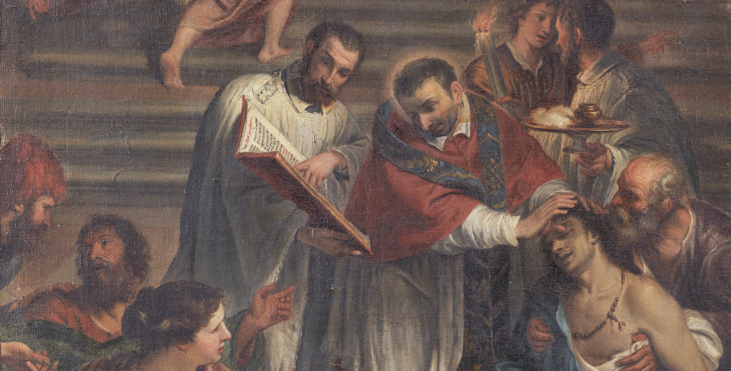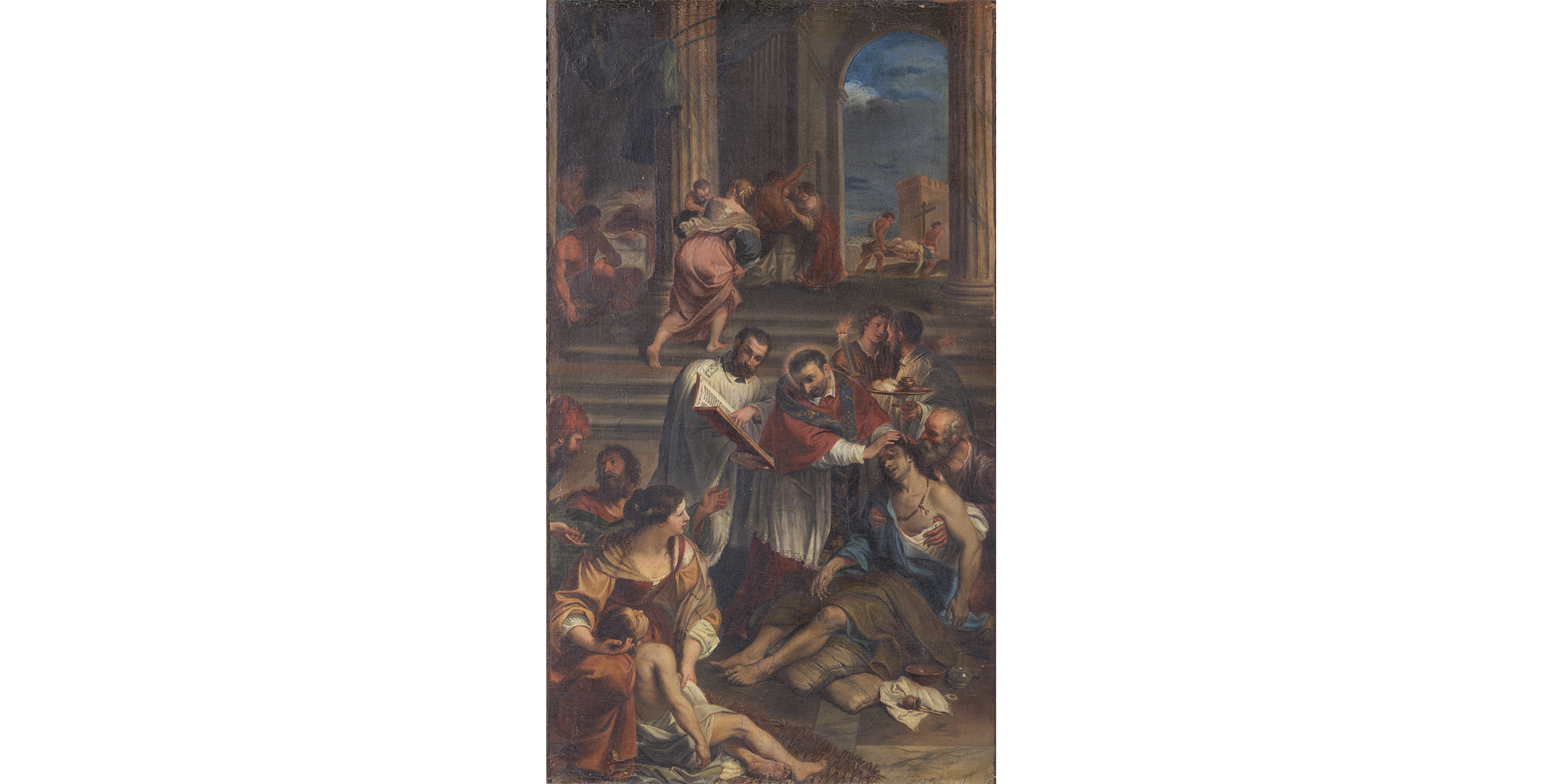 Cosi scrive Gian Pietro Giussani nella Vita di san Carlo Borromeo, pubblicata nel 1610, anno in cui papa Paolo V canonizzò il cardinale, morto il 3 novembre del 1584. Allo scatenarsi della terribile epidemia di peste in Lombardia, nel 1576, il Borromeo, assente da Milano perché in visita pastorale, rientrò subito, mentre il governatore spagnolo e il gran cancelliere fuggivano via. In città il cardinale organizzò l’opera di assistenza e aiutò tutti personalmente e instancabilmente fino al punto da ricevere un rimprovero dal Papa, preoccupato per la sua salute. Il suo culto, diffuso quando era ancora in vita, crebbe rapidamente dopo la morte e la sua figura divenne ben nota in tutta Italia grazie alla circolazione di dipinti, affreschi, incisioni, sculture, apparati effimeri, stendardi.