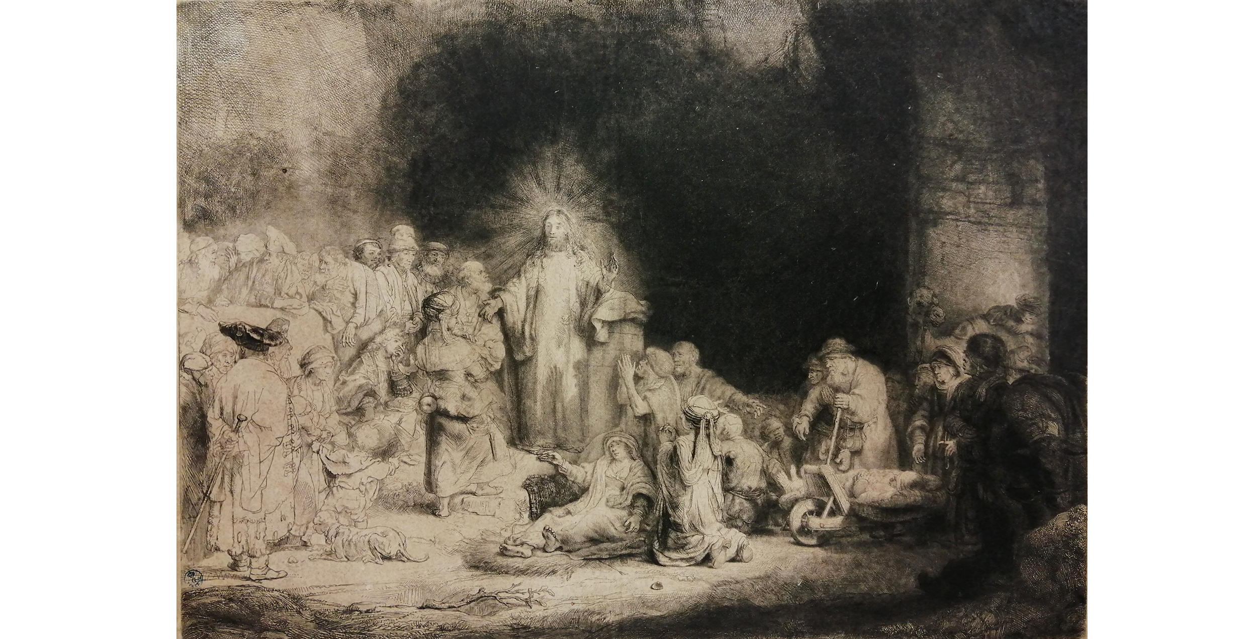 Figura miracolosa e salvifica per eccellenza è Gesù, qui presentato secondo il racconto evangelico di Matteo. Rembrandt riunisce in un’unica scena diversi episodi mettendoli a confronto con un personale e organico sforzo di interpretazione. Quella che ne deriva è una delle sue più celebri incisioni, che accosta il tema della guarigione dalle infermità a quello della purezza dell’anima - “Lasciate che i bambini vengano a me, perché di questi è il regno dei cieli” (Mt 19, 14).