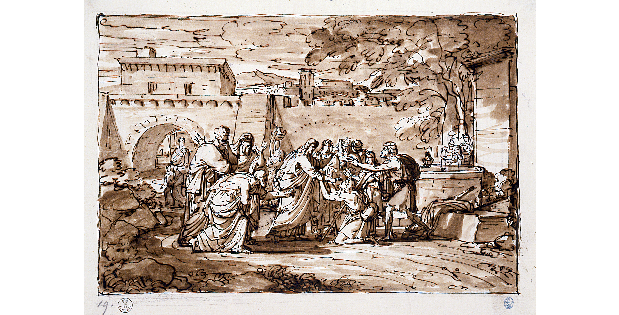 Il disegno si distingue per il dinamismo delle pose e dei gesti dei personaggi, accentuato da un veloce tratteggio e dalle mezze tinte. Alla vivacità della scena principale si contrappone la scenografica distesa dell’imponente cinta muraria, al di là della quale si erge la città. L’esecuzione mostra la piena maturità espressiva del pittore, che nel 1801 fu nominato ritrattista ufficiale di corte nell’intermezzo del Regno di Etruria.
