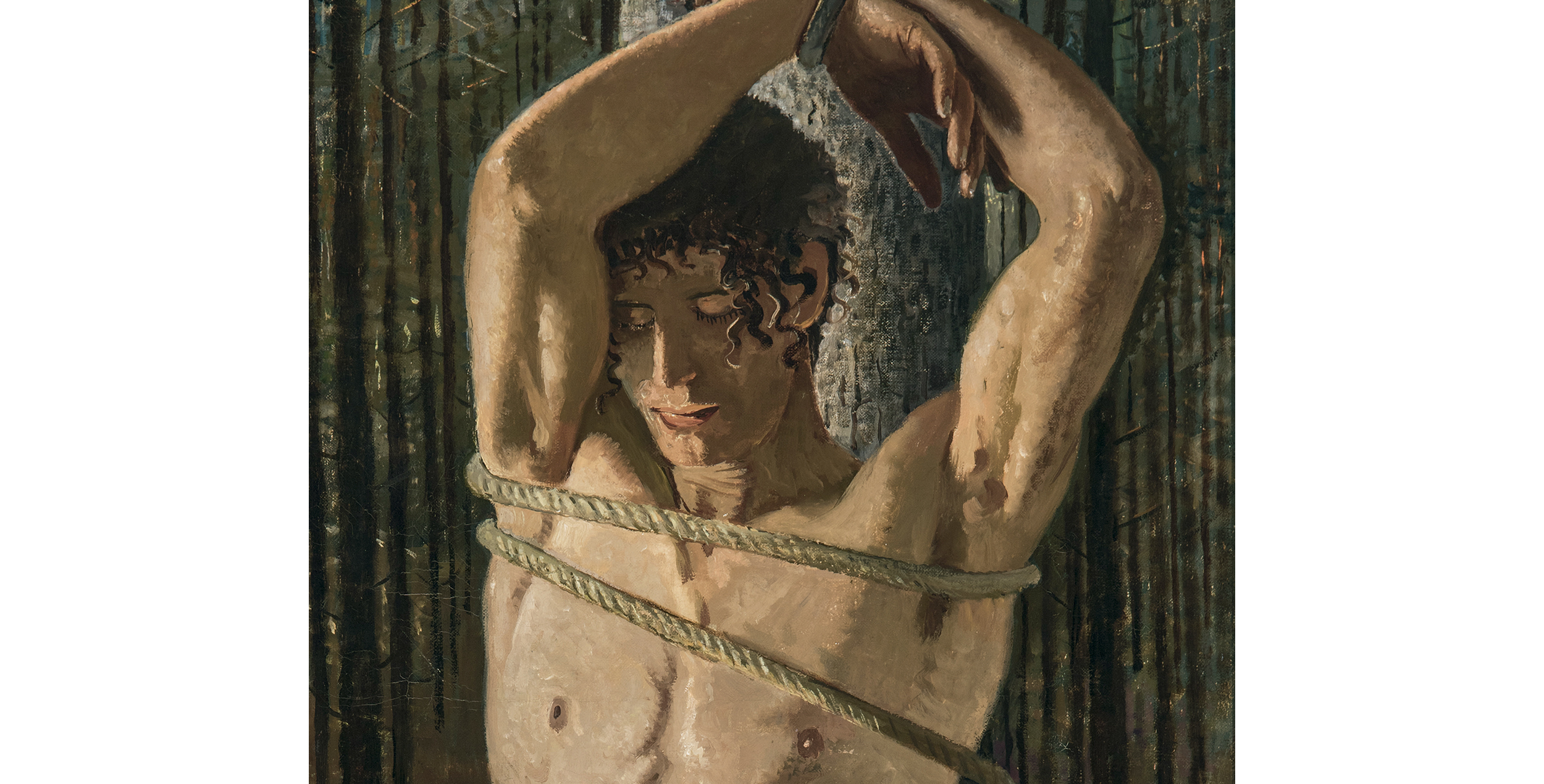 Niente vìola qui la bellezza del corpo che Colacicchi mette in scena, esaltato dalla luce radente che arriva da sinistra, languido e sensuale come vuole la rilettura moderna attivata nel 1911 da Le martyre de Saint Sébastien di Gabriele D’Annunzio dove il corpo efebico del Santo, portato in scena da Ida Rubinstein, incarna la perfezione umana, insieme estetica e morale. Anche Colacicchi sentirà l’esigenza a posteriori di spogliare il dipinto della sua valenza religiosa. Lo chiamerà infatti L’uomo legato, ripensando, come scriverà Flavia Arlotta, «a quello che succedeva intorno a noi mentre lo dipingeva, e ai partigiani». Tempi cupi, appunto, adombrati anche nella fitta abetaia vallombrosana dello sfondo (così diversa dai suoi consueti tributi al “Dio Sole”), ai quali tuttavia l’artista oppone l’intangibilità dello spirito e della bellezza.