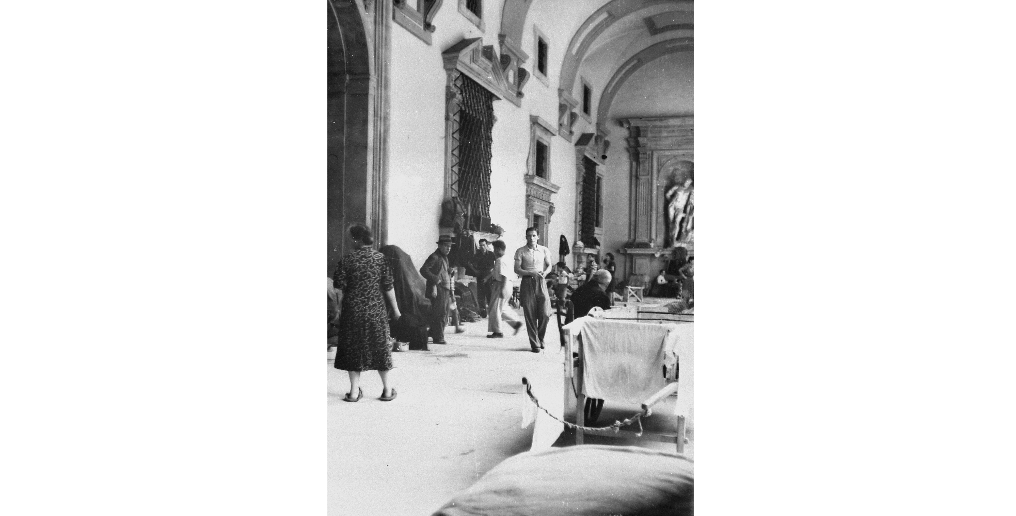 Sul vasto ripiano della Galleria Palatina lo spettacolo è veramente pittoresco: tutto il pavimento è letteralmente coperto di materassi, sacconi e coperte su cui nelle pose più varie giacciono corpi seminudi, gambe, spalle, dorsi lucidi di sudore; teste scarmigliate e riverse, bocche semiaperte come di morti. Molti russano, qualcuno si lamenta rivoltandosi in un sonno agitato. Dalle pareti le grandi statue neoclassiche guardano impassibili tutta questa umanità accasciata nel sonno pesante pieno d’incubi. In un angolo un lumicino proietta ombre deformi sulle volte; è una mamma che lo tiene acceso perché il suo piccolino ha paura. E su tutto domina continuo, pesante, opprimente il rombo del cannone vicino e il continuo vibrare delle vetrate.