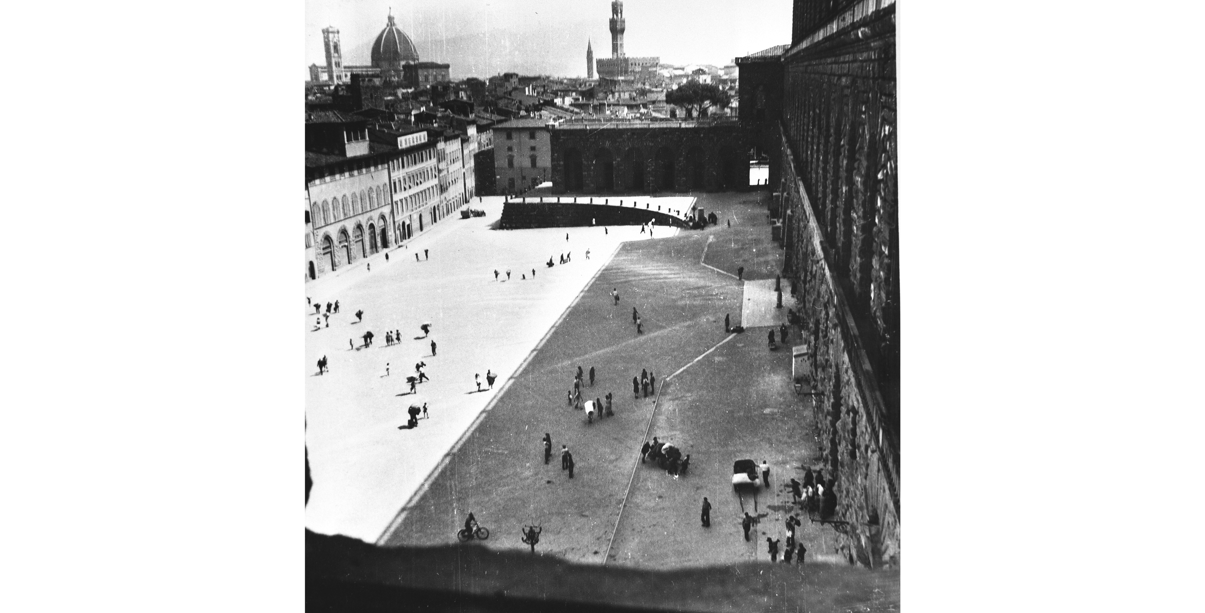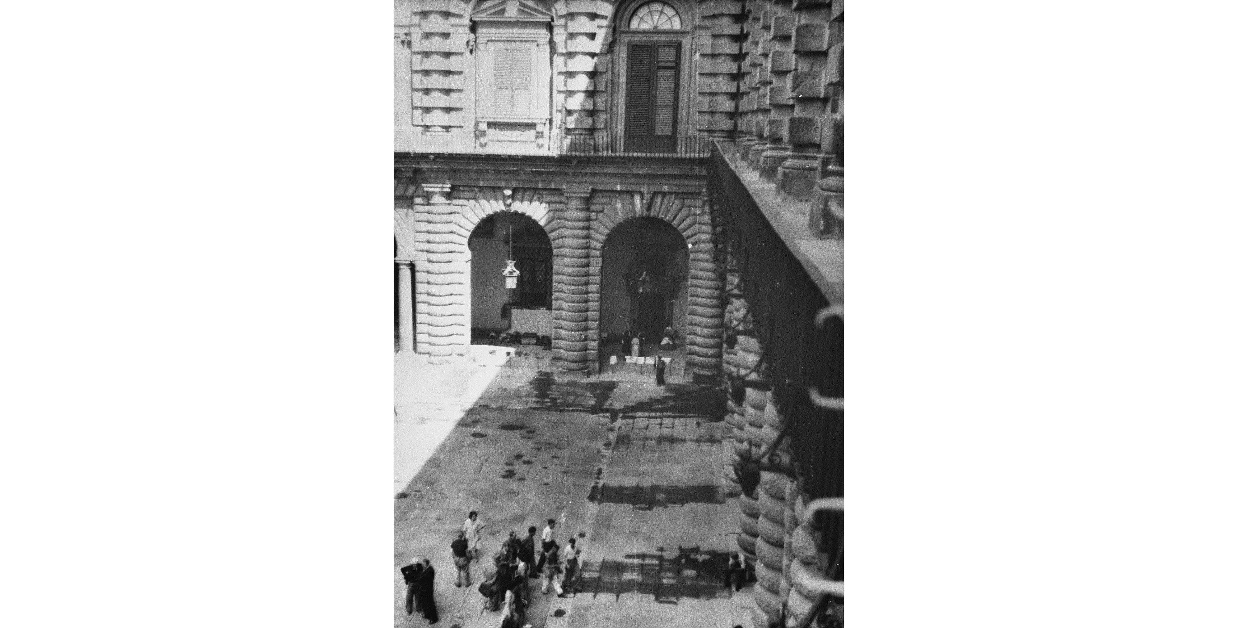 Fotografia: Nello Baroni, Palazzo Pitti, Cortile dell'Ammannati, Archivio di Stato di Firenze, Nello Baroni, Negativi, Negativi di fotografie di guerra, 5. Firenze (Palazzo Pitti), agosto 1944, n. 32). Nell'uomo voltato sulla destra è probabilmente riconoscibile Giovanni Michelucci.