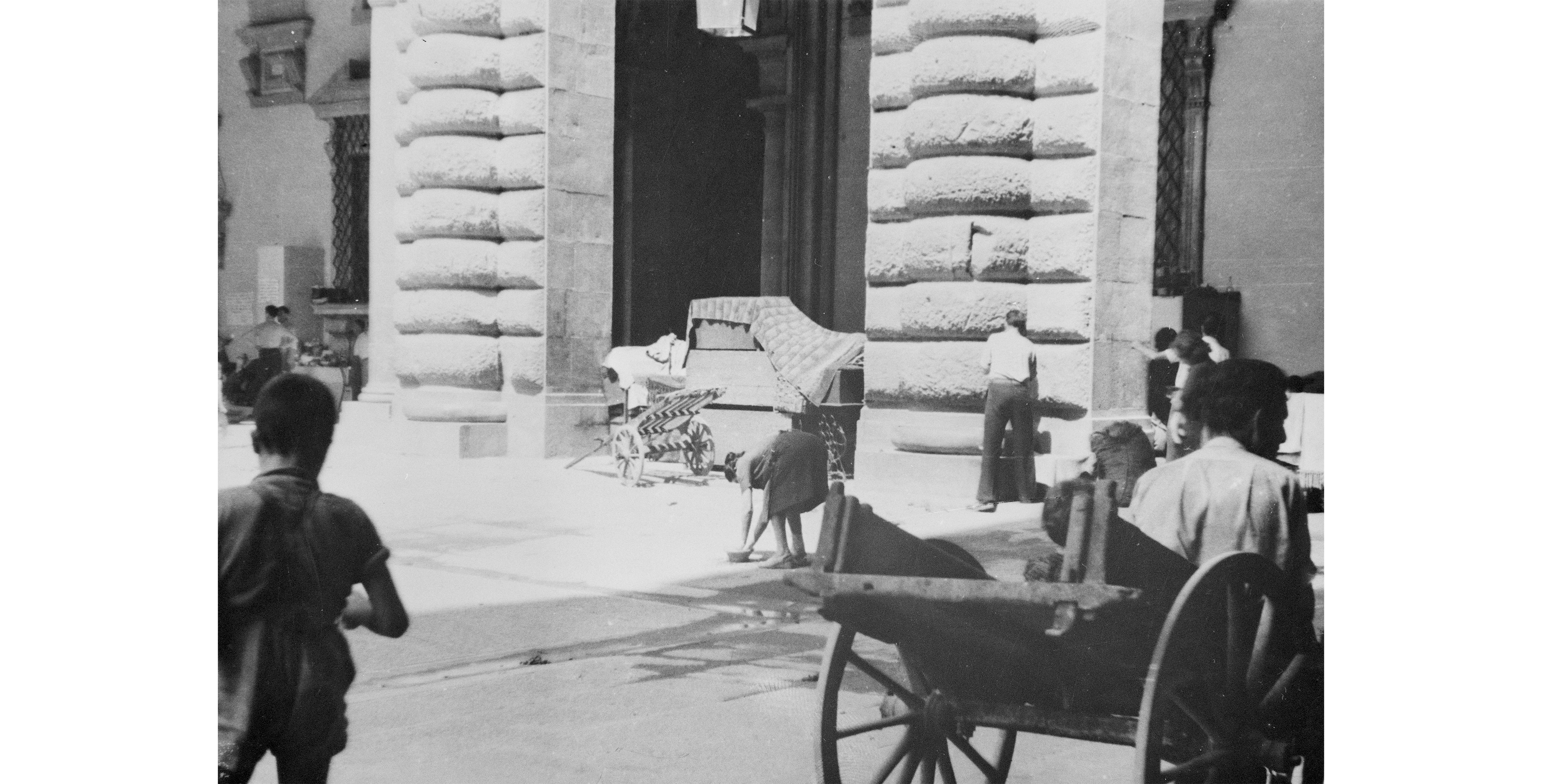 Fotografia: Nello Baroni, Palazzo Pitti, Cortile dell'Ammannati, Archivio di Stato di Firenze, Nello Baroni, Negativi, Negativi di fotografie di guerra, 5. Firenze (Palazzo Pitti), agosto 1944, n. 28. Nell'uomo in alto a sinistra è forse riconoscibile Giovanni Michelucci, mentre l'uomo di spalle con la camicia bianca è identificabile con Italo Gamberini.