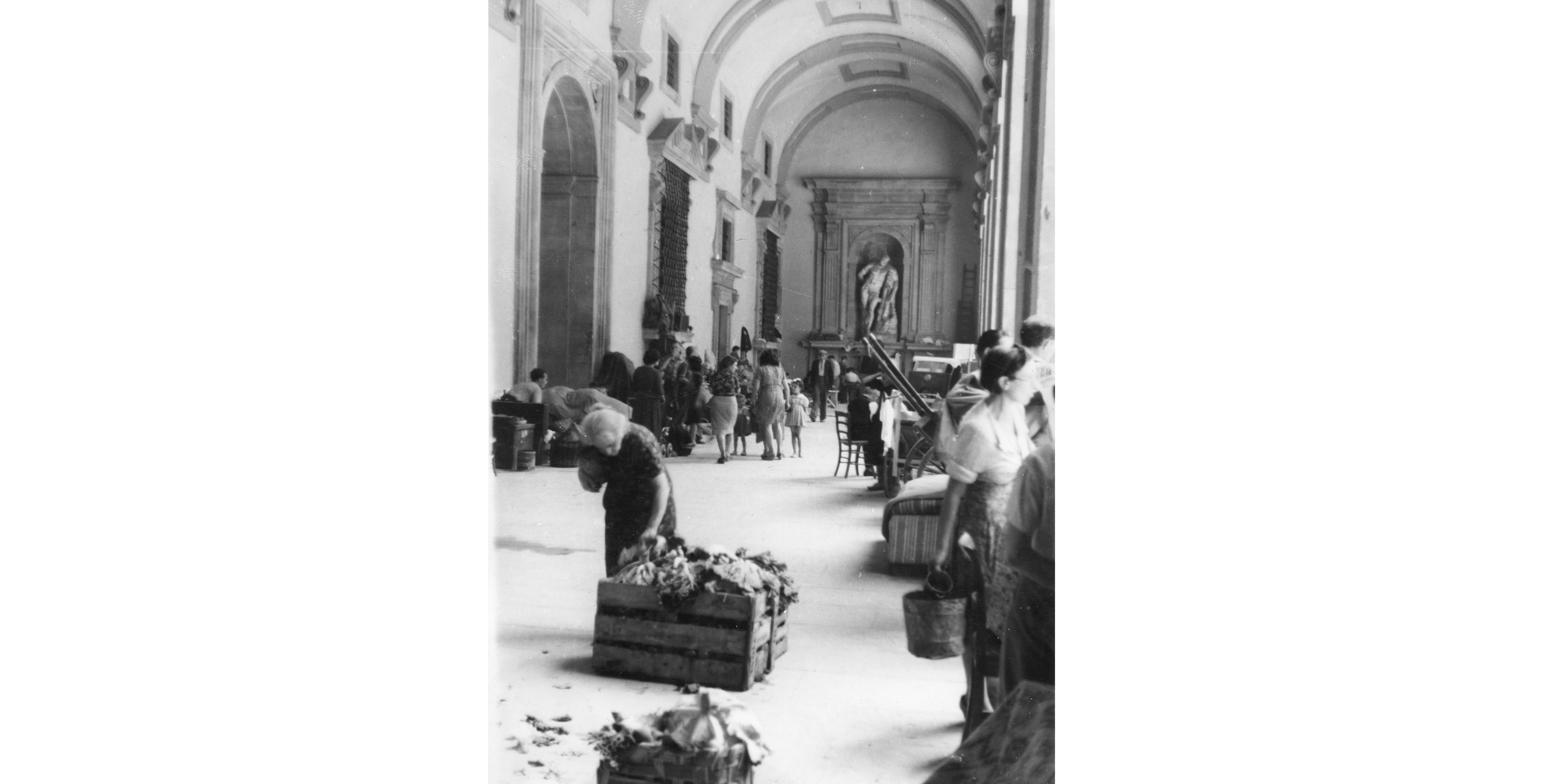 Cortili, ambienti di servizio, scaloni, soffittoni e sale di galleria - un tempo assiepate di quadri - si riempiono di gente. Ci si organizza per dormire, mangiare, lavarsi, perfino per morire. Perché la gente continua a morire - di stenti, di malattie, di vecchiaia - e viene seppellita temporaneamente dentro il Giardino di Boboli.