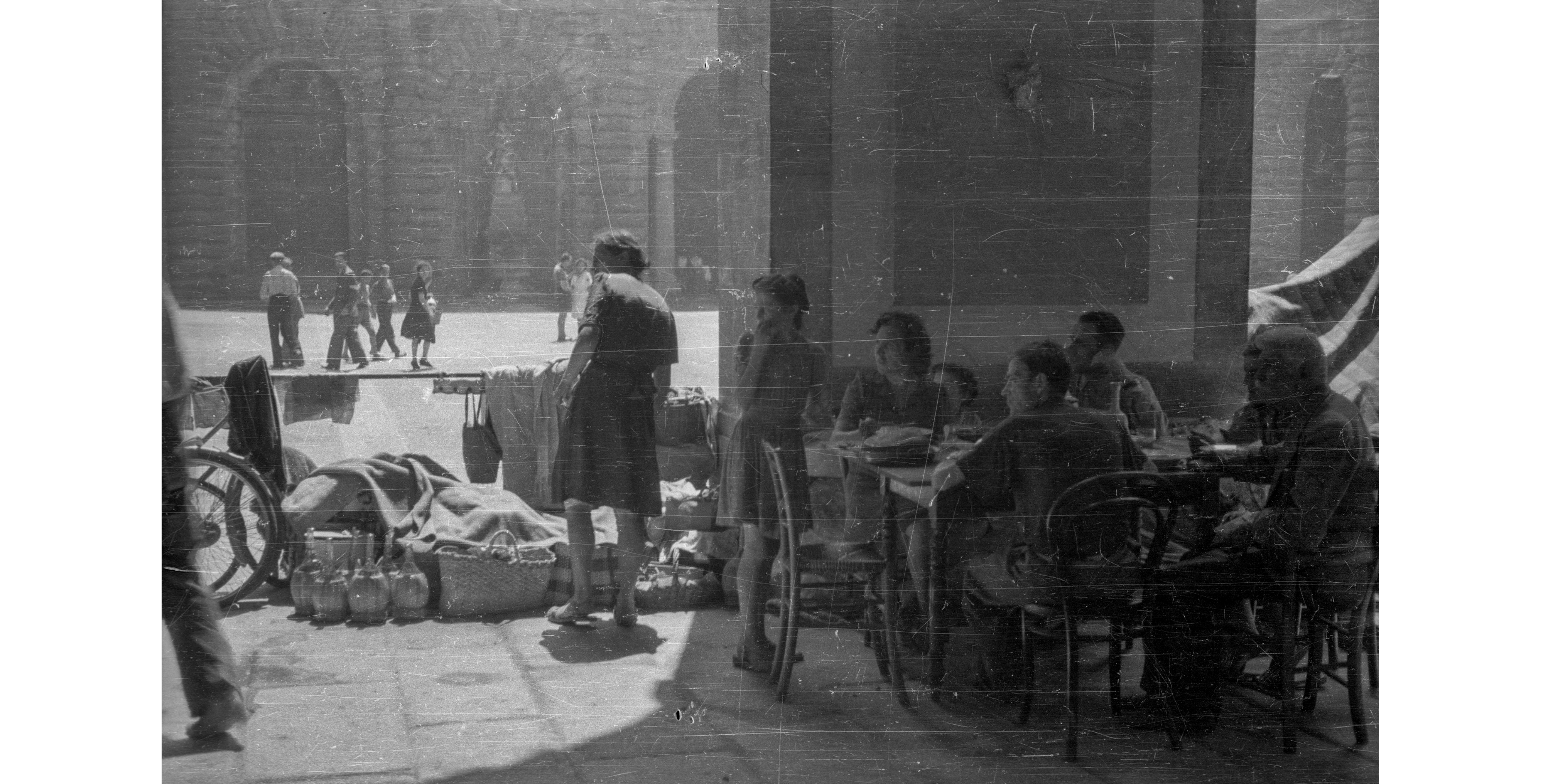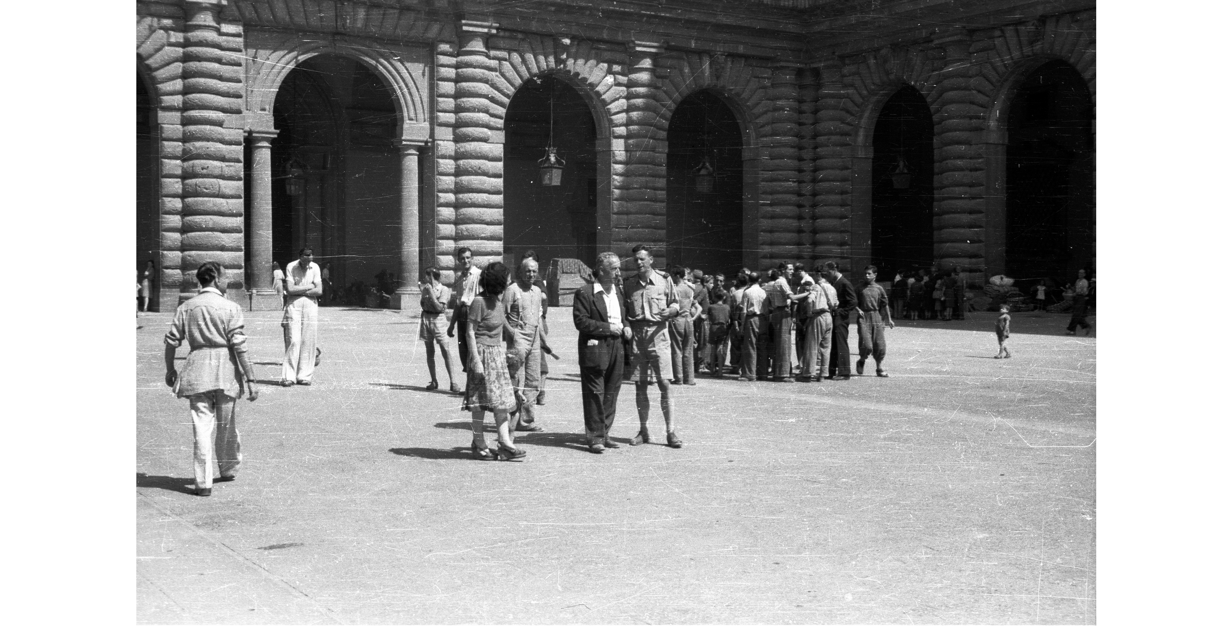Fotografia: Nello Baroni, Palazzo Pitti, Cortile dell'Ammannati, Archivio di Stato di Firenze, Fondo Nello Baroni, Negativi, Negativi di Fotografie di Guerra, 5. Firenze (Palazzo Pitti), n. 2. In piedi a destra è riconoscibile Edoardo Detti.
