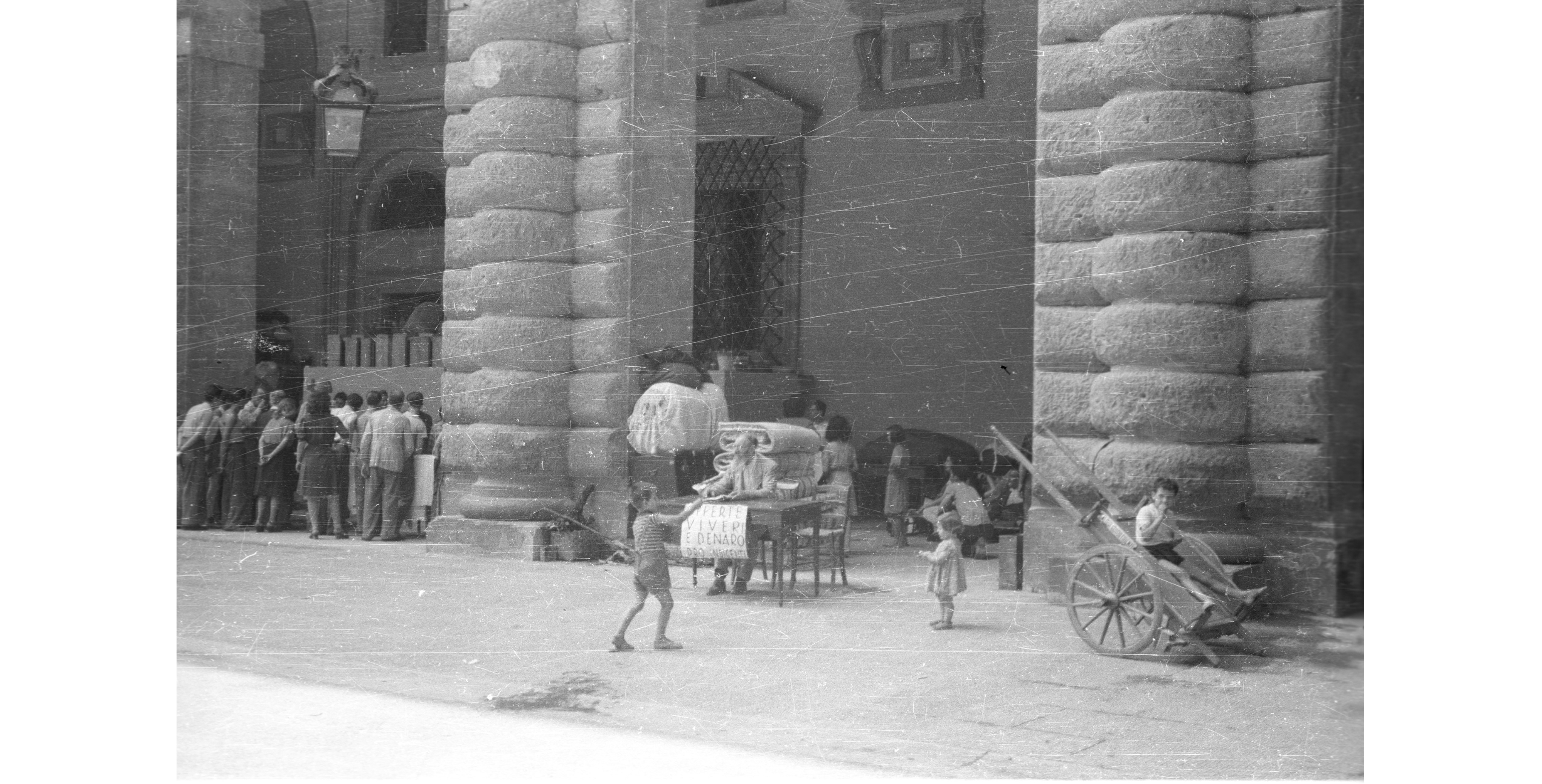All'alba - un'alba scipita e triste di giorno nebbioso- siamo in piedi e usciamo per andare verso Via Guicciardini. Non siamo i primi: di già su tutte le porte è un agitarsi di gente che porta giù roba, che la carica sui carretti, sui barroccini, sui barrocci più grandi. Ogni mezzo di trasporto viene messo in opera: dalle carriole da muratori alle carrozzine da bambini; c’è persino un signore – distintissimo - che serio spinge un carretto settecentesco con ruote grandissime e ferrature a riccioli e ghirigori. Chissà dove l’ha trovato.