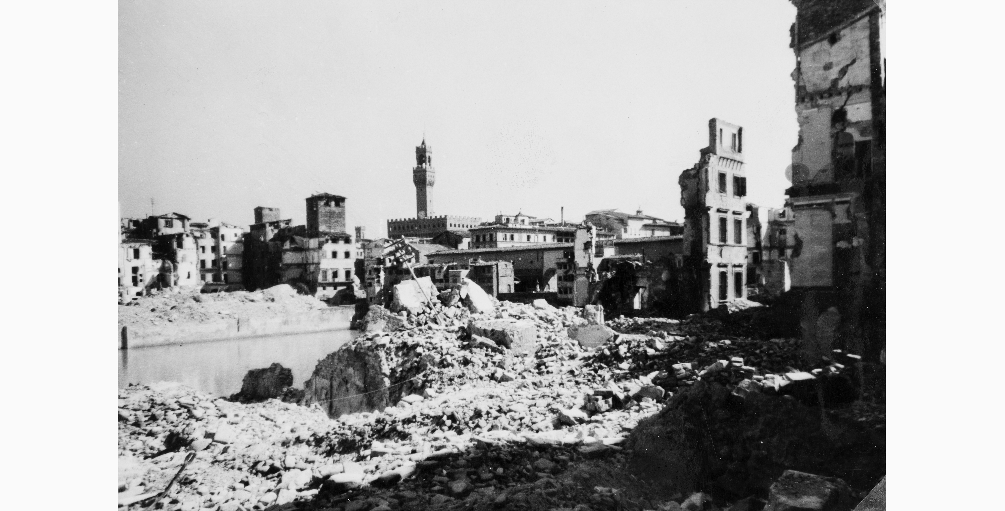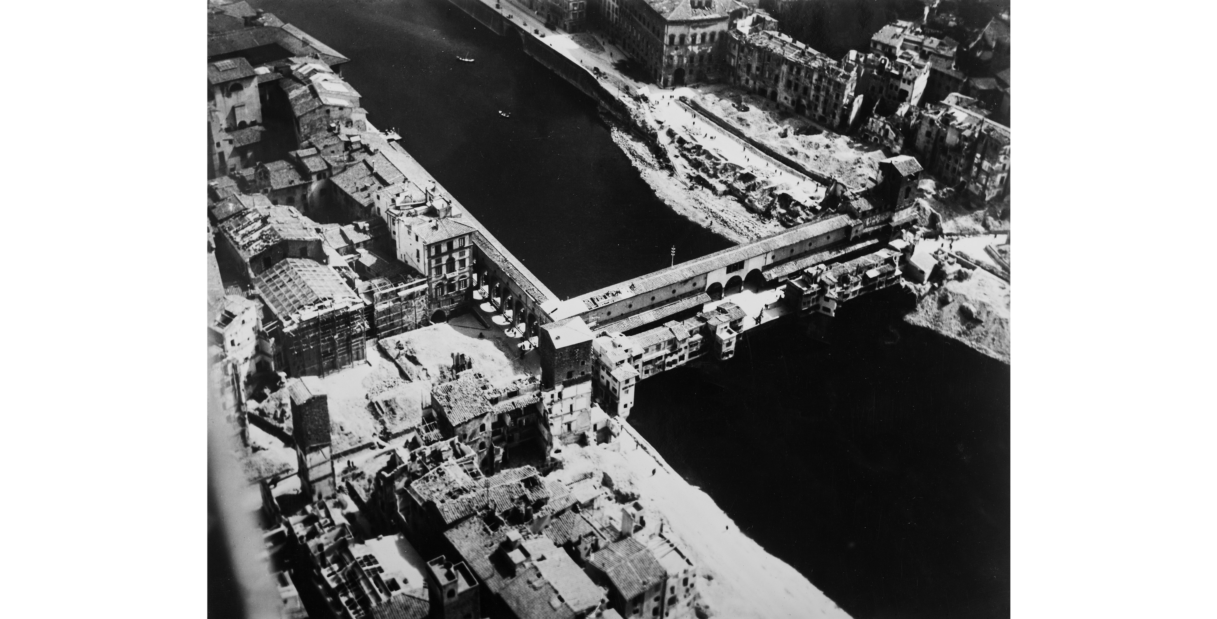 Fotografia: Esercito Alleato, Veduta di Ponte Santa Trinita distrutto, agosto 1944, Gabinetto Fotografico delle Gallerie degli Uffizi, n. 380127. La foto è stata scattata dall'esercito alleato nei giorni immediatamente successivi alla distruzione dei ponti.