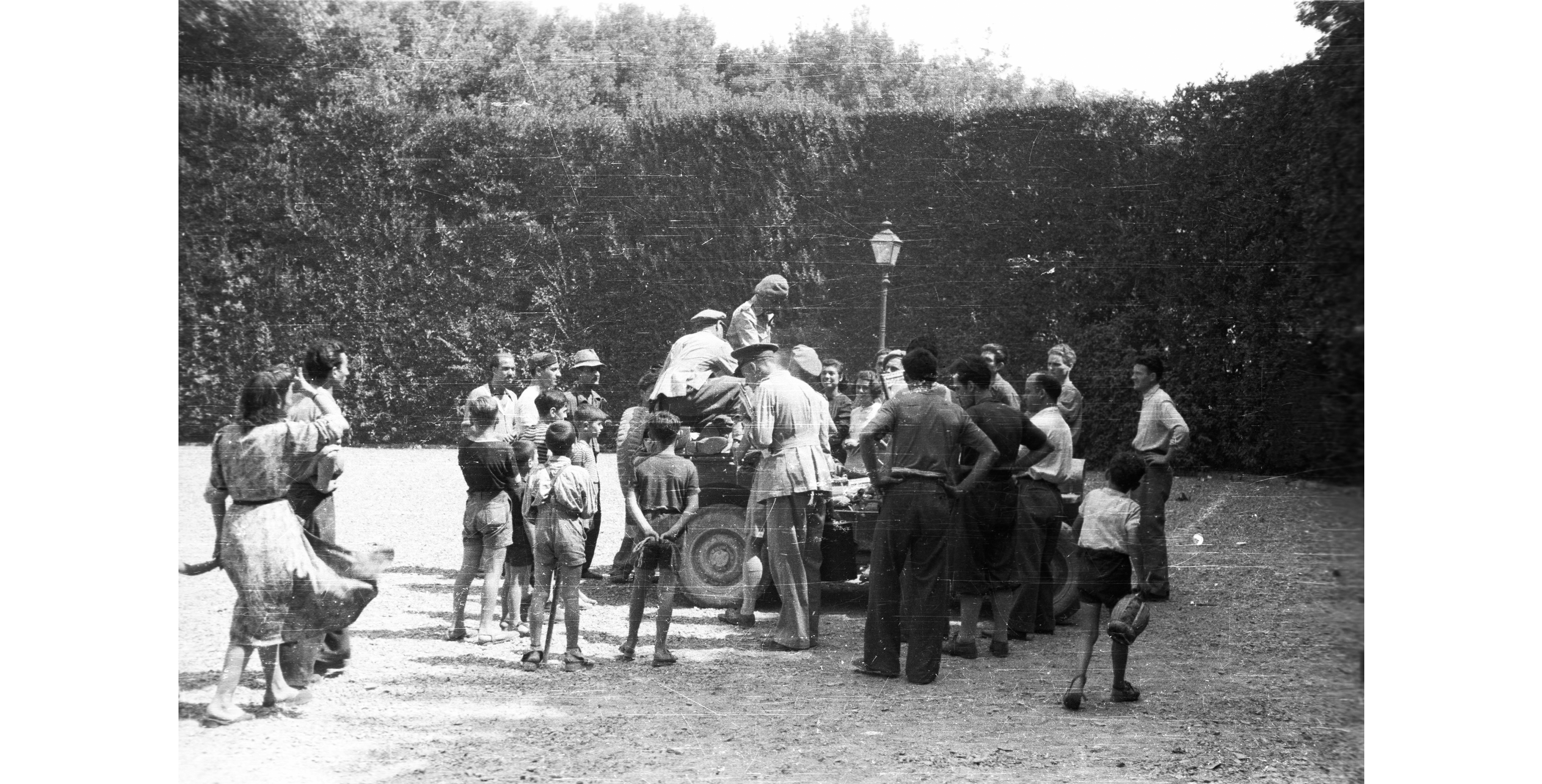 Mentre esco dalla stanza del Soprintendente dove ero andato a cercare notizie, sento un urlio confuso dalla parte del cortile dell’amministrazione; tutti corrono verso il passaggio. E di qui, attorniati da una turba di gente che urla incomposta, uno dopo l’altro, escono due “tommies” l’ elmetto a catinella sulle ventitré, il mitra imbracciato e, nel viso, un’espressione indefinibile di disgusto per questa turba di straccioni che li circonda.