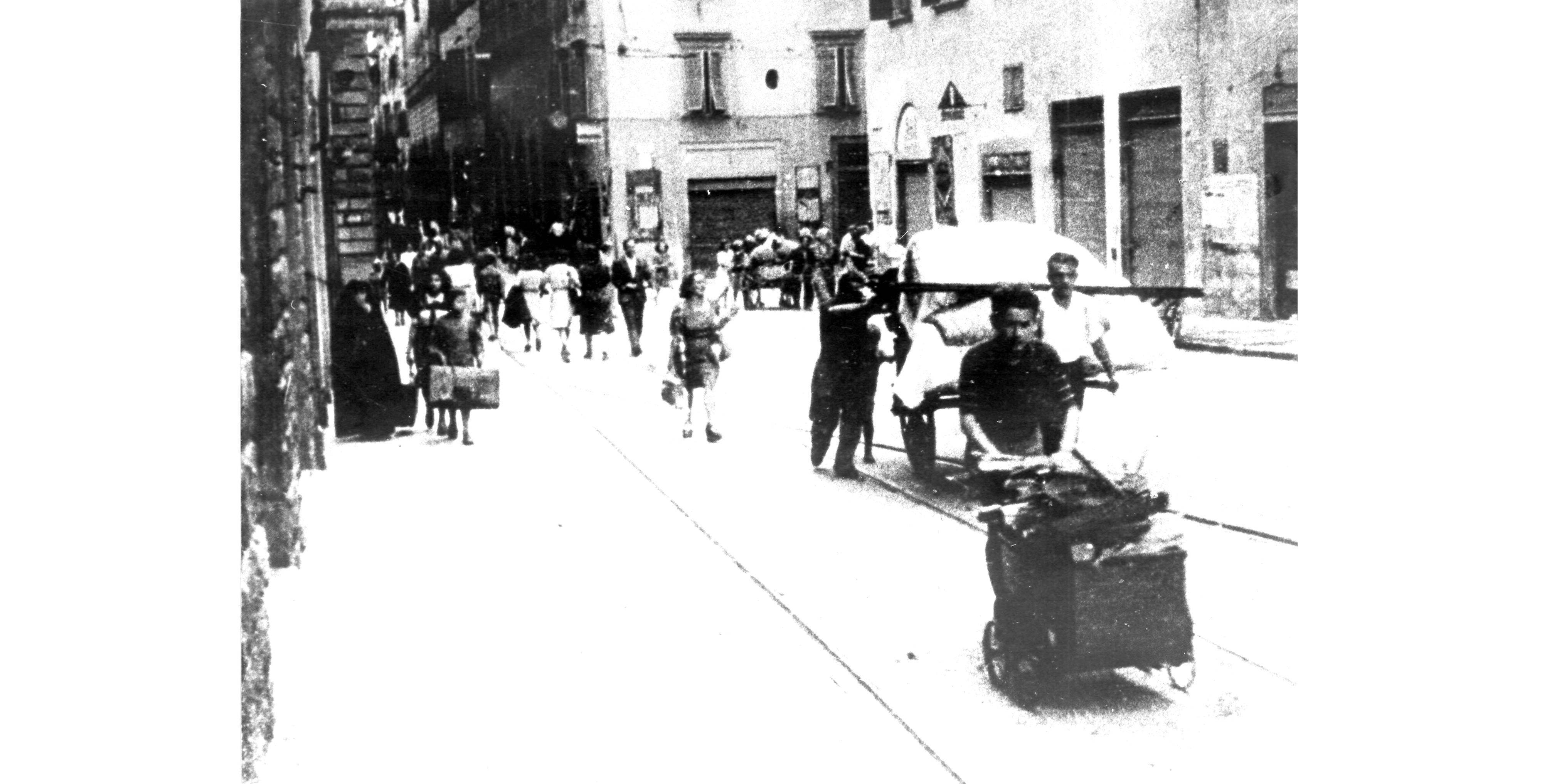 Due ininterrotte file di gente che tira carretti s’incrociano nella stretta via Guicciardini; sudano, faticano, inciampano, ma c’è in tutti un non so qual senso di disciplina come una consapevolezza che in questo momento non è il caso di abbandonarsi al leticare così caro ai fiorentini, e forse è tanto il rancore verso chi li costringe a questo calvario che non ce ne resta per gli altri.
