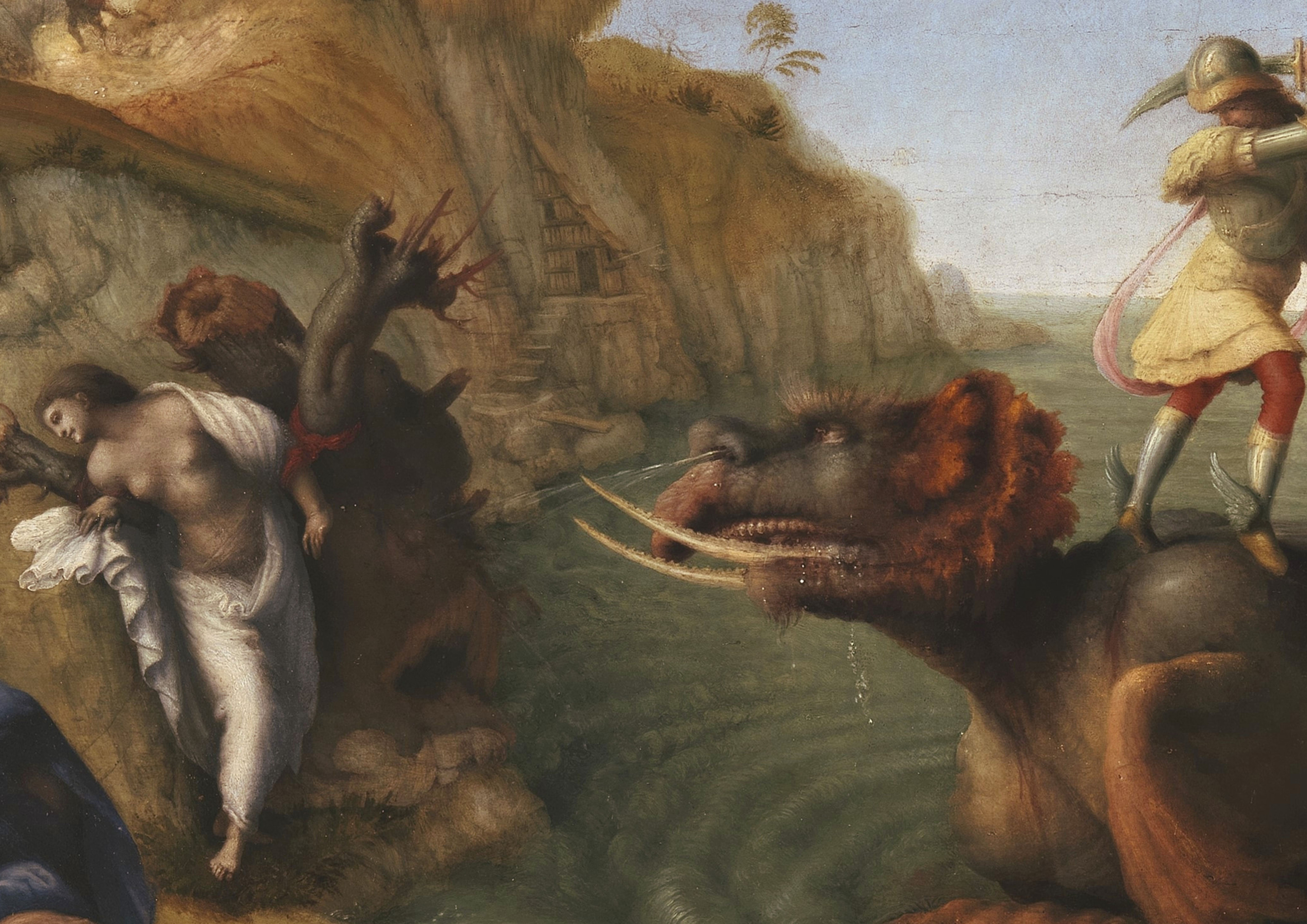 Il dipinto si contraddistingue anche per l'affascinante virtualità scenica dell'episodio narrato: il riferimento è al mito di Perseo e Andromeda raccontato dal poeta latino Ovidio, un modello stilistico per tutti i grandi scrittori, drammaturghi e artisti del Rinascimento italiano ed europeo in generale. In quel monumento letterario che sono le Metamorfosi, Ovidio ci ha lasciato un capolavoro di scrittura che nella metrica, nel fraseggio, nella struttura e nell'andamento ricalca quasi "mimeticamente" il senso letterale della "metamorfosi", della trasformazione, del tempo che trasmuta ogni forma in un'altra all'infinito, in un incessante moto: qui, nel dipinto di Piero di Cosimo, la stessa "virtualità scenica" della narrazione ovidiana che gioca a rappresentare il reale, è esemplificata in una raffigurazione sincronica e circolare dell'episodio, in cui i diversi momenti, che nel testo sono disposti in un ordine temporale, vengono dinamicamente iconizzati tutti in un'unica sequenza visiva che rende perfettamente quel senso di trasmutazione continua dell'essere che è alla base del poema ovidiano.