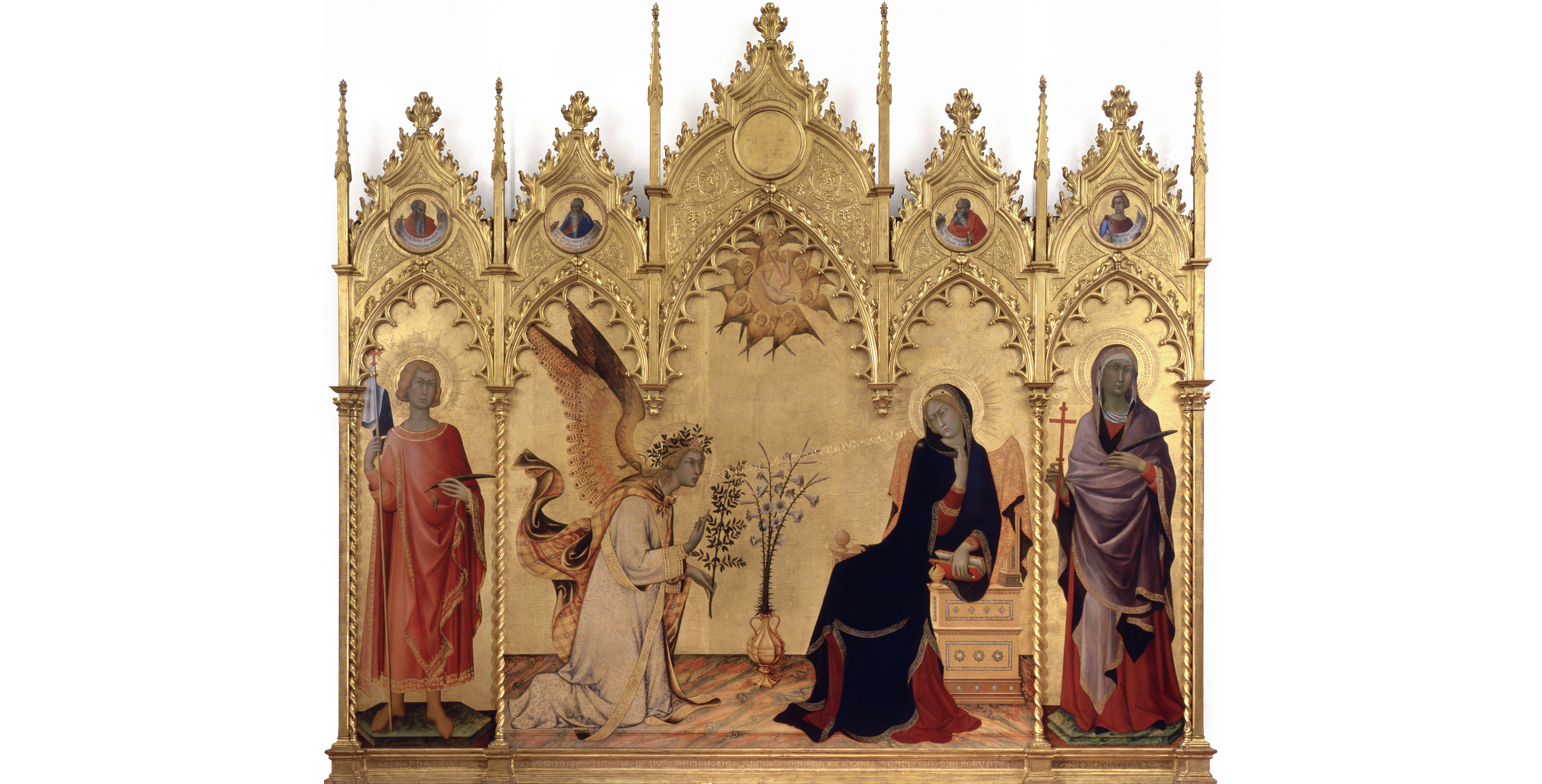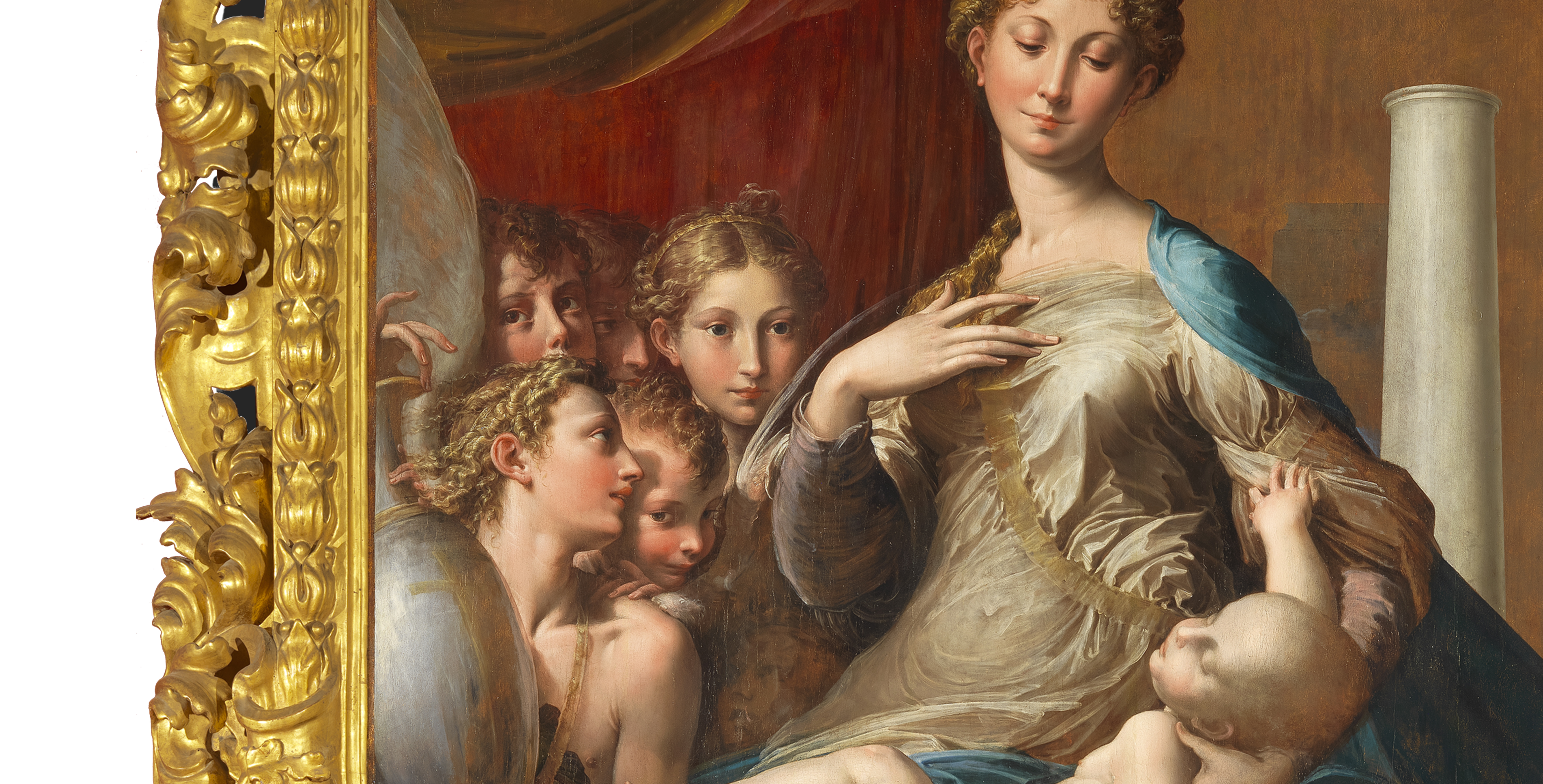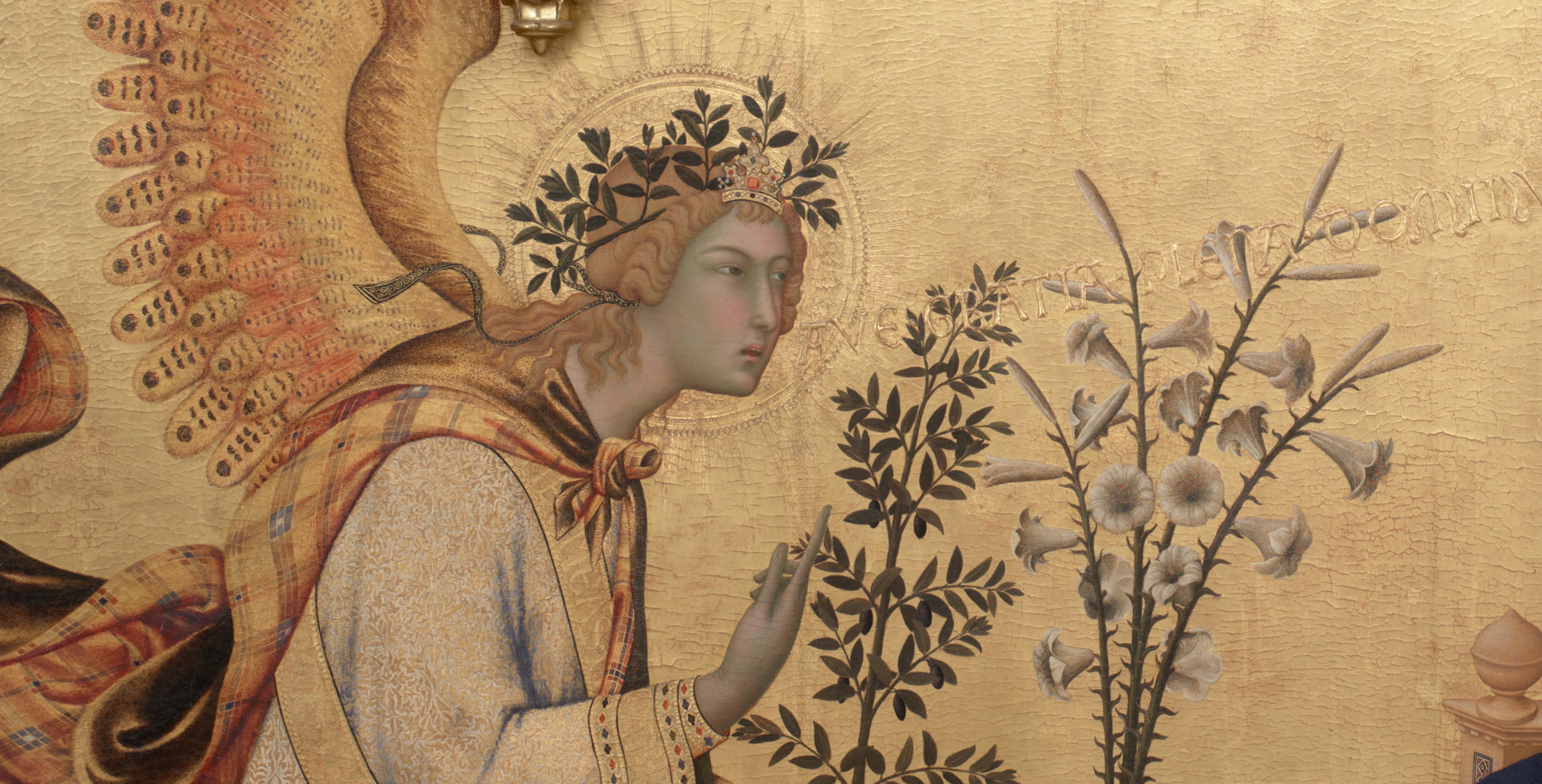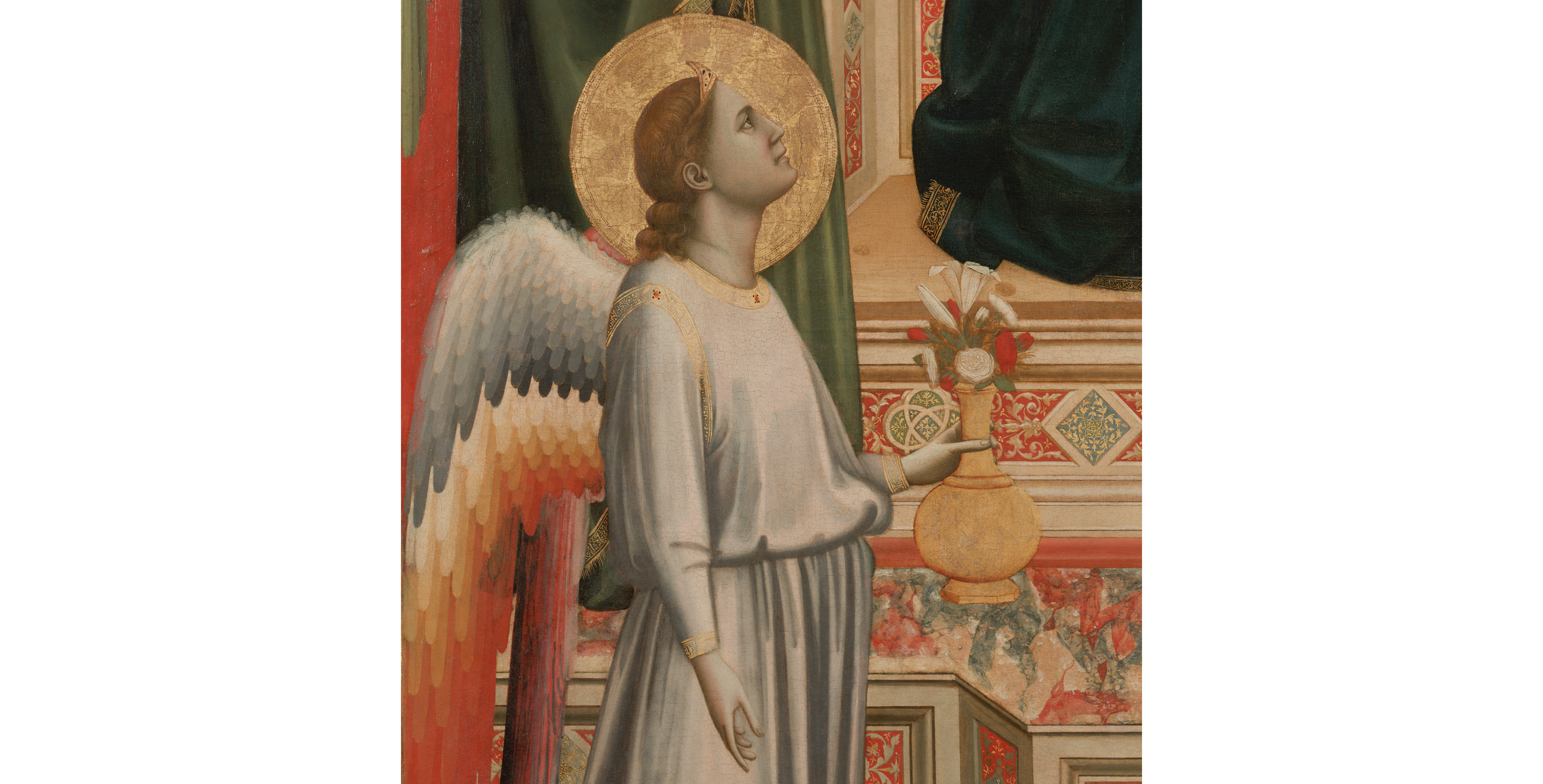 E proprio in quanto messaggeri di Dio gli angeli popolano l’Antico Testamento, appaiono nel libro del Genesi a sancire la cacciata di Adamo ed Eva dal Giardino dell’Eden, corrono a fermare Abramo un attimo prima di vibrare il colpo mortale su suo figlio Isacco, o rivestono il ruolo di spirito guida: è il caso del giovane Tobiolo, scortato amorevolmente dall’angelo Raffaele nel lungo viaggio intrapreso per recuperare i crediti del vecchio padre. Anche nei Vangeli il compito di queste creature eteree, né umane né divine, è quello di connettere terra e cielo, accompagnando la vita di Gesù e della sua famiglia. Un angelo annuncia a Maria la sua gravidanza, un’accolta di angeli intona inni di lode nella notte di Natale e all’arrivo dei Magi e, più tardi, gli stessi accudiscono Gesù dopo le tentazioni subite nel corso del suo eremitaggio nel deserto della Giudea, attendono Maria di Magdala sul sepolcro ormai vuoto per annunciare la Resurrezione, circondano la Vergine nel suo passaggio verso il cielo. Sono gli angeli, infine, i ministri del giorno del Giudizio, descritto nell’Apocalisse di San Giovanni. Da questa miriade di occorrenze nascono le riflessioni dei primi teologi cristiani sulla natura e il compito delle creature angeliche e la codificazione degli ordini che lo Pseudo-Dionigi Aeropagita riunì in nove gerarchie, dai serafini e i cherubini, i più vicini a Dio e letteralmente infiammati del suo amore, fino agli arcangeli e gli angeli, custodi del tempo e responsabili del destino dell’uomo. Ma al di là della voce dei padri della Chiesa l’affezione nutrita dalle tradizioni popolari per alcuni angeli come Michele, il guerriero che sconfigge il demonio, determina presto l’esigenza di raffigurare le loro fattezze e di renderli riconoscibili attraverso il loro elemento più distintivo ed evocato dalle scritture: le ali piumate. Un attributo che aveva connotato anche tante divinità pagane, ma che si prestava bene a spiegare ai fedeli l’essenza di queste creature intermedie, puri spiriti provenienti dal cielo ma al tempo stesso profondamente partecipi del destino dell’uomo sulla terra. A questo specifico attributo, il cui colore varia per distinguere l’appartenenza alla schiera dei serafini, dalle ali rosse, o dei cherubini, dalle ali blu, si sommano dettagli di abbigliamento come le lunghe vesti preziose, i dettagli del volto delicatissimi e quasi femminei, e gli strumenti musicali relativi al loro ruolo di cantori del divino. Il percorso che si apre in questa Ipervisione invita il visitatore a guardare opere celeberrime, o anche meno note, da questo speciale punto di vista. In ognuna di esse potrà scoprire le varianti e le scelte iconografiche nella rappresentazione degli angeli, a partire da quelli che affiancano il trono di Maria nella grandiosa Maestà di Giotto, passando dal delicatissimo e biondo giovane che si avvicina quasi spaurito a Maria nell’Annunciazione di Simone Martini, per approdare, dopo i paradisi incantati del Beato Angelico, alle interpretazioni dei manieristi, da Rosso a Parmigianino, e dei maggiori pittori del Seicento fiorentino. Ogni opera rivela l’universo simbolico cui l’artista ha di volta in volta attinto per dare corpo a questi incantevoli messaggeri. Un viaggio nell’arte italiana ed europea che lega le epoche e ci invita a ritornare al senso più profondo del nostro essere umani.