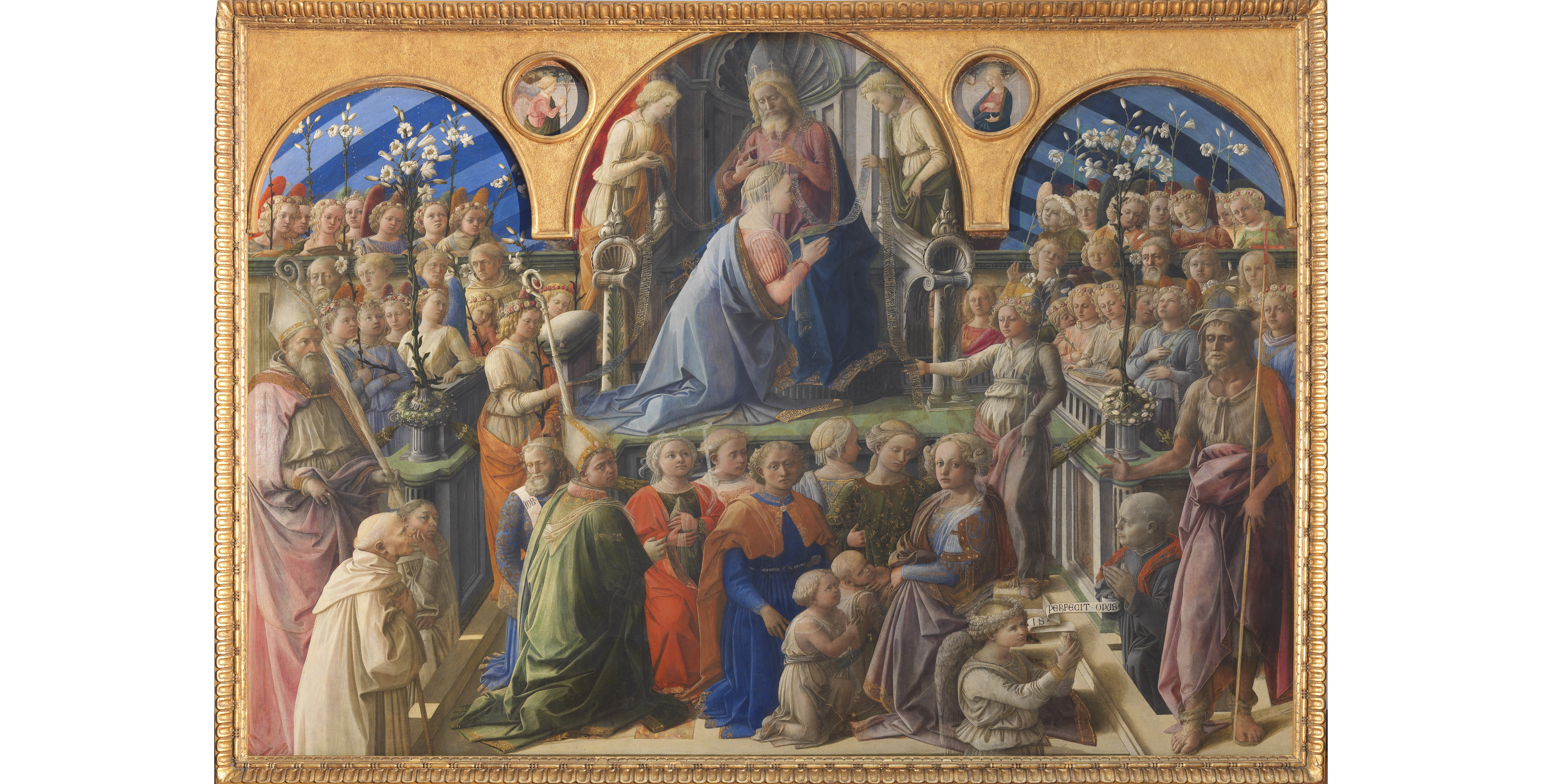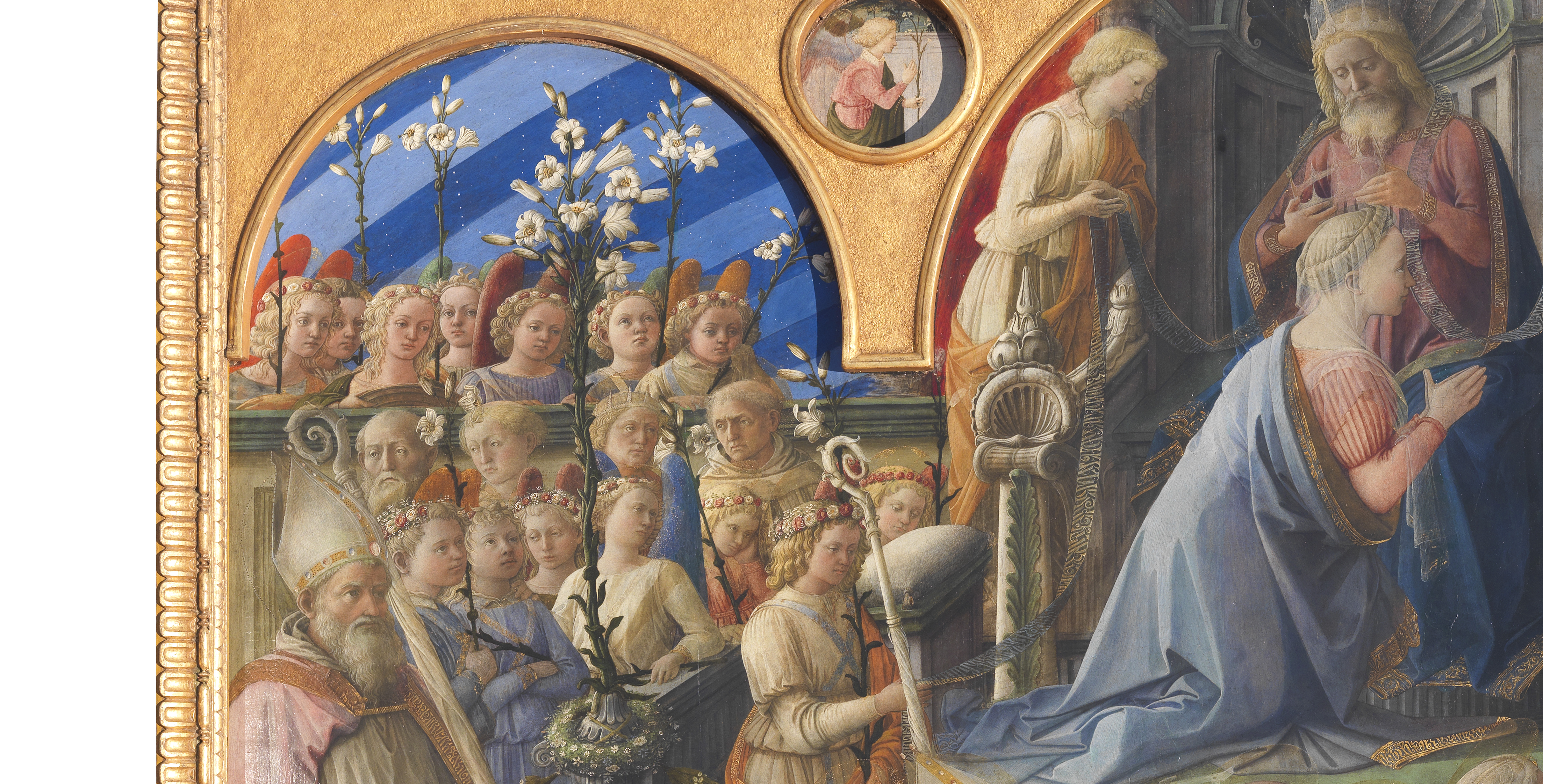 Cherubini e Serafini sono gli angeli più rappresentati nell’arte di ogni tempo ed è possibile riconoscerli anche tra le serrate file di fanciulli alati che caratterizzano l’opera di Filippo Lippi. La loro presenza nella grande tavola personifica ed amplifica l’incontro tra divino ed umano che avviene al centro, dove su di un trono monumentale Dio Padre incorona Maria. Il loro gesto di levare in alto i gigli richiama il momento stesso dell’incarnazione divina, rappresentato in alto nell’Annunciazione, ed esalta la purezza della donna, il suo essere senza peccato, creatura anch’essa divina ed umana.