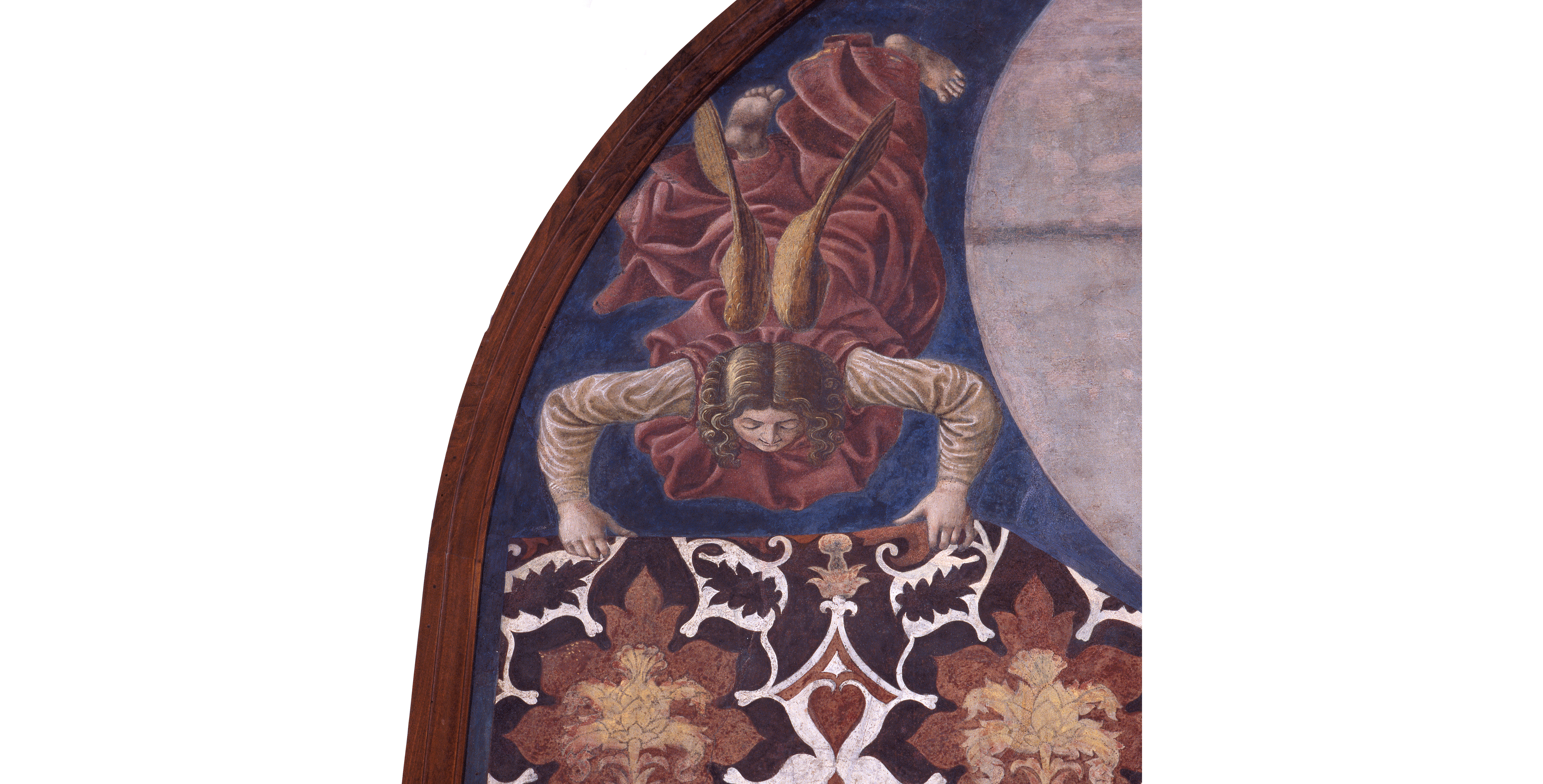 In alto, ai due lati del grande disco - oggi vuoto ed in origine contenente forse un Padre Eterno o lo stemma di famiglia - scendono in picchiata due grandi angeli in uno scorcio audace, mentre sostengono i lembi di un drappo d’onore decorato ad arabeschi, secondo un gusto che il pittore aveva studiato nel suo soggiorno veneziano. Il loro volo ed il sontuoso panno dispiegato fino a terra segnano i confini tra uno spazio che è sacro, nel senso etimologico di “separato”, ed un altrove indefinito, solo accennato nella lontananza blu oltremare del cielo.