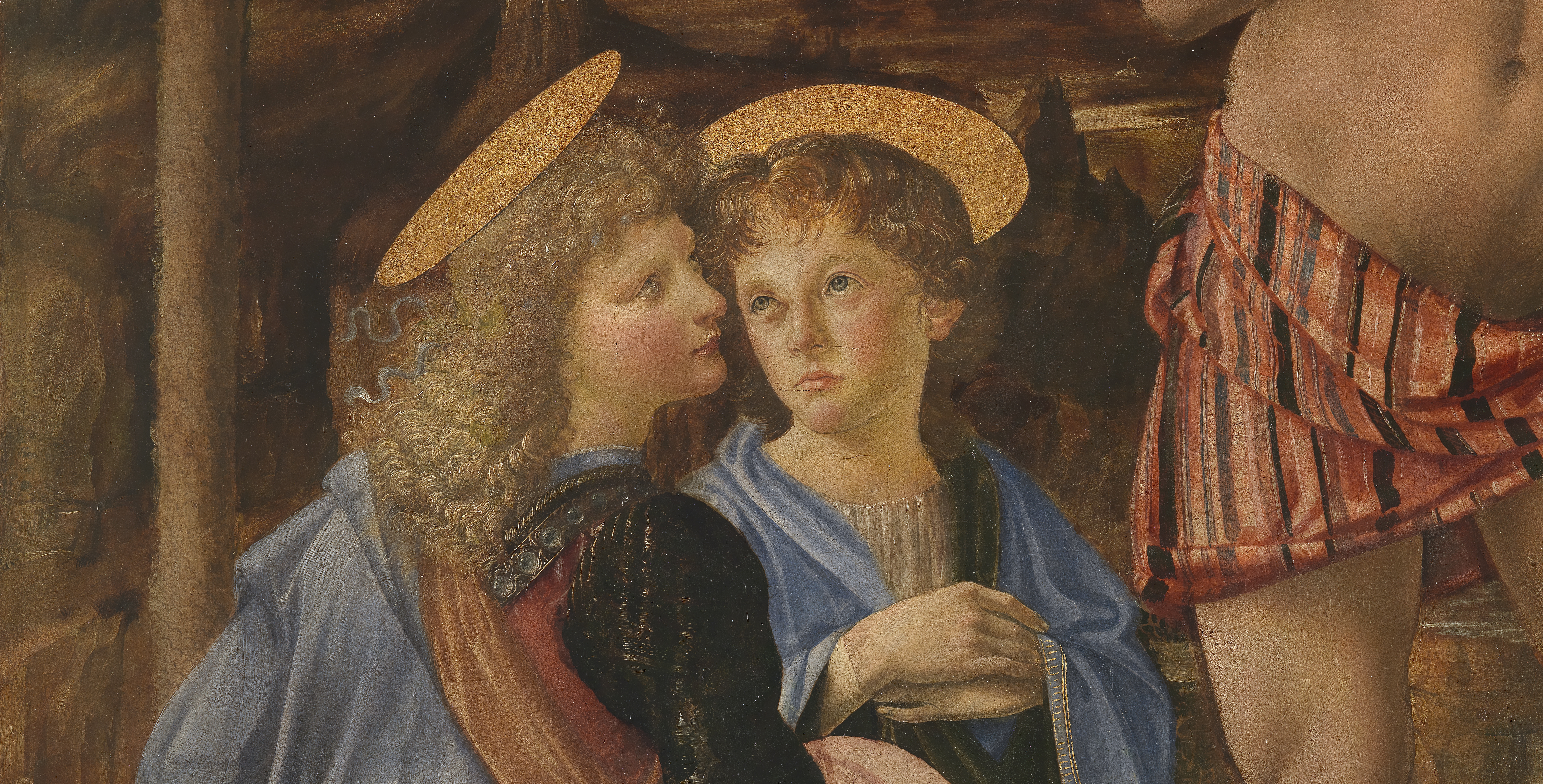 Due angeli assistono inginocchiati alla scena del Battesimo di Cristo. Fra i vari discepoli che collaborano all’esecuzione dell’opera nella bottega del maestro Verrocchio, le fonti danno particolare evidenza al giovane Leonardo da Vinci, che dà una straordinaria quanto precoce prova del suo talento nell’angelo di sinistra.