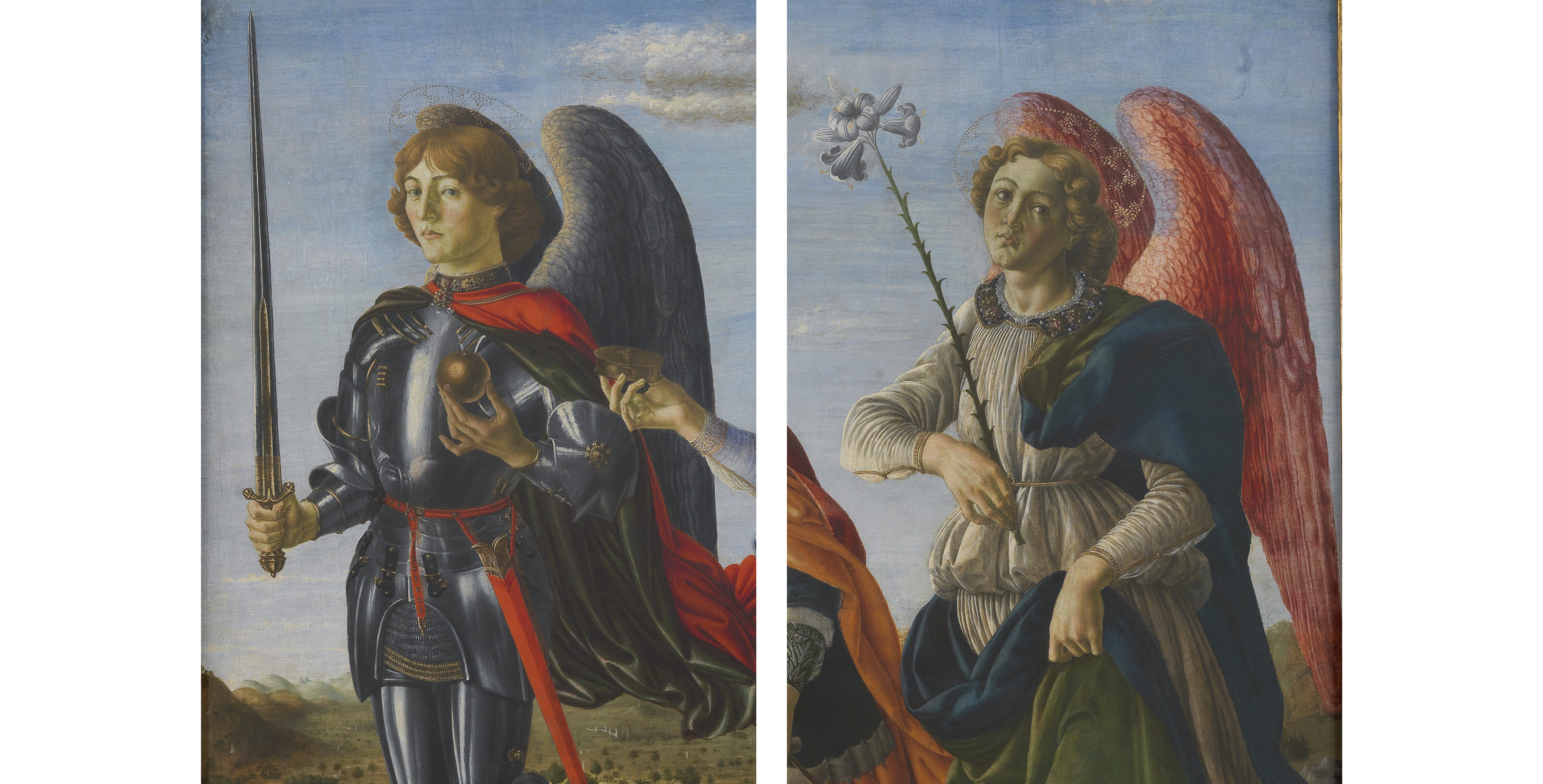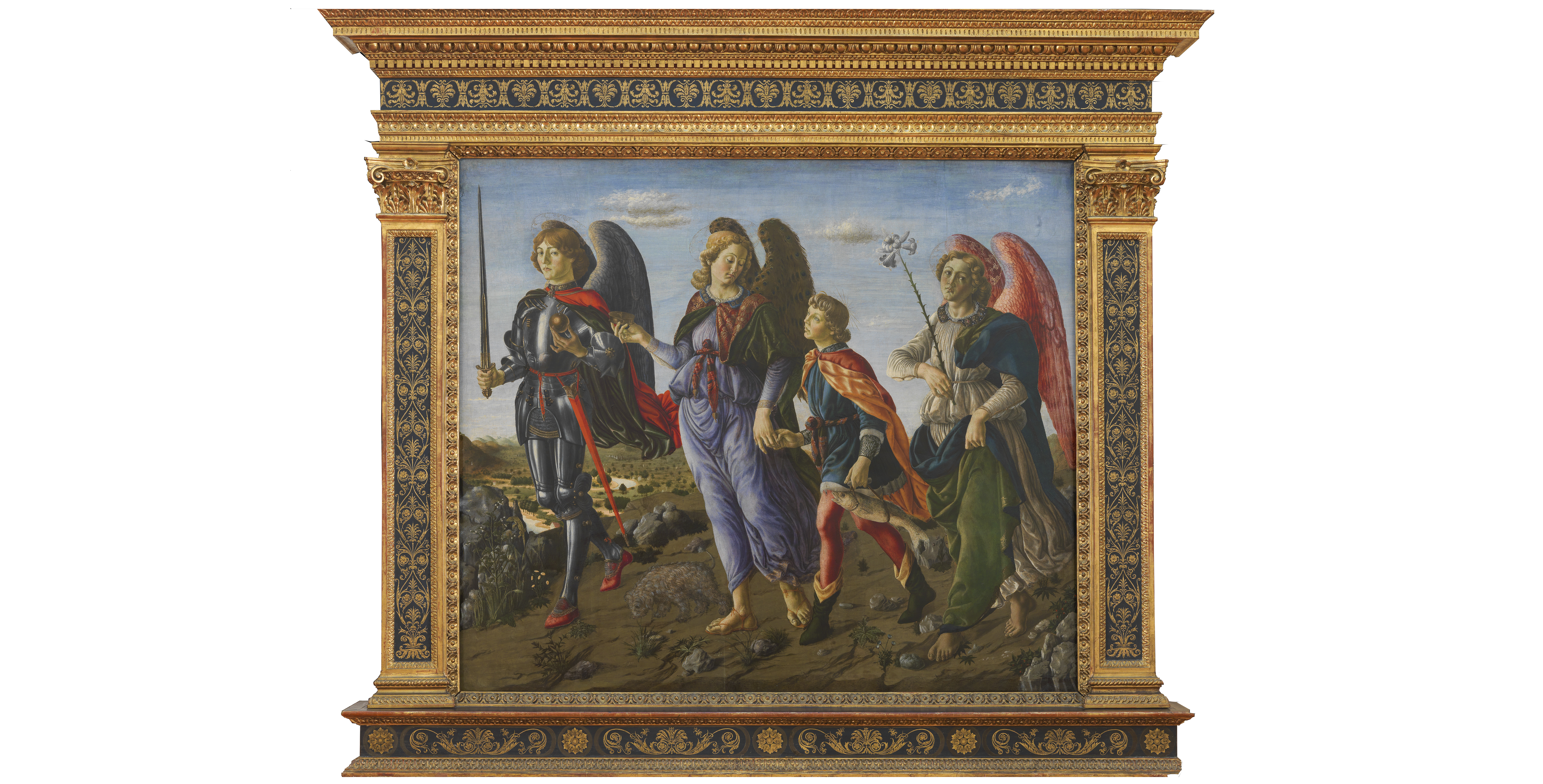 Raffaele dunque è l’angelo che custodisce, colui che tiene per mano e cura le ferite, come sembra indicare il vaso dei medicamenti che mostra. A fianco dei due protagonisti, il pittore raffigura anche gli altri arcangeli citati nelle Scritture, Michele e Gabriele, anch’essi caratterizzati da splendide ali, elemento iconografico mutuato dalla Vittoria alata del mondo classico.