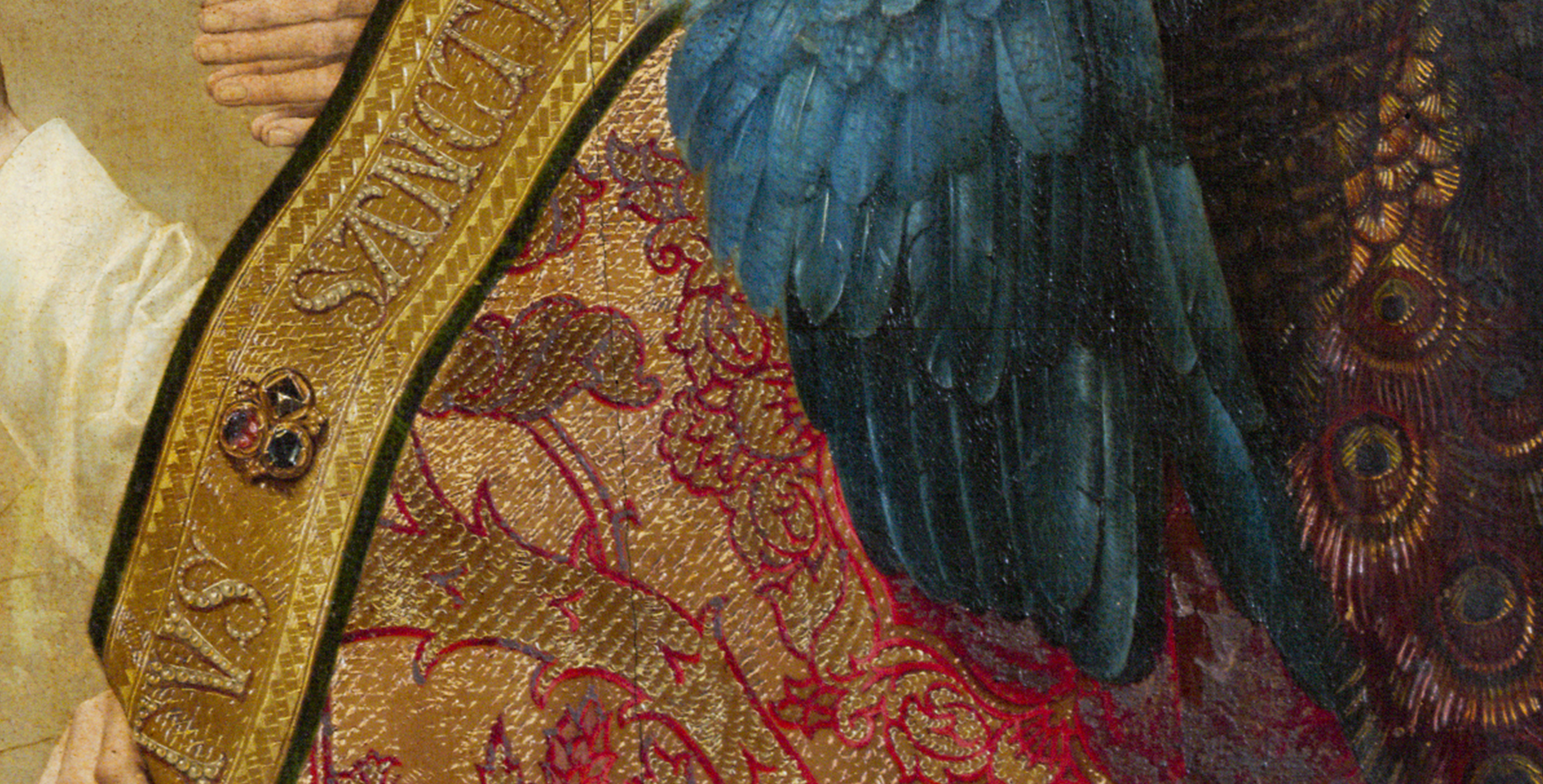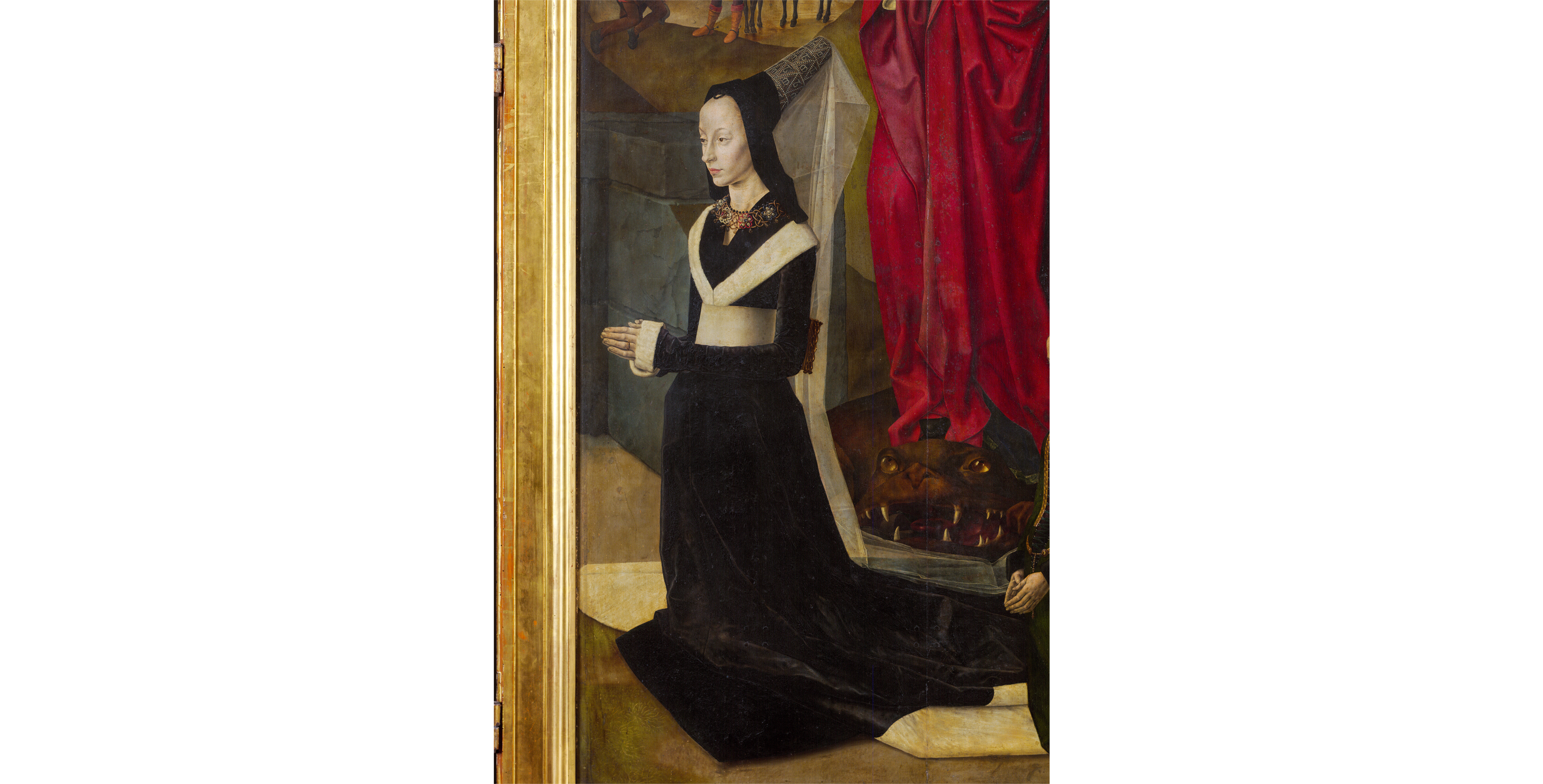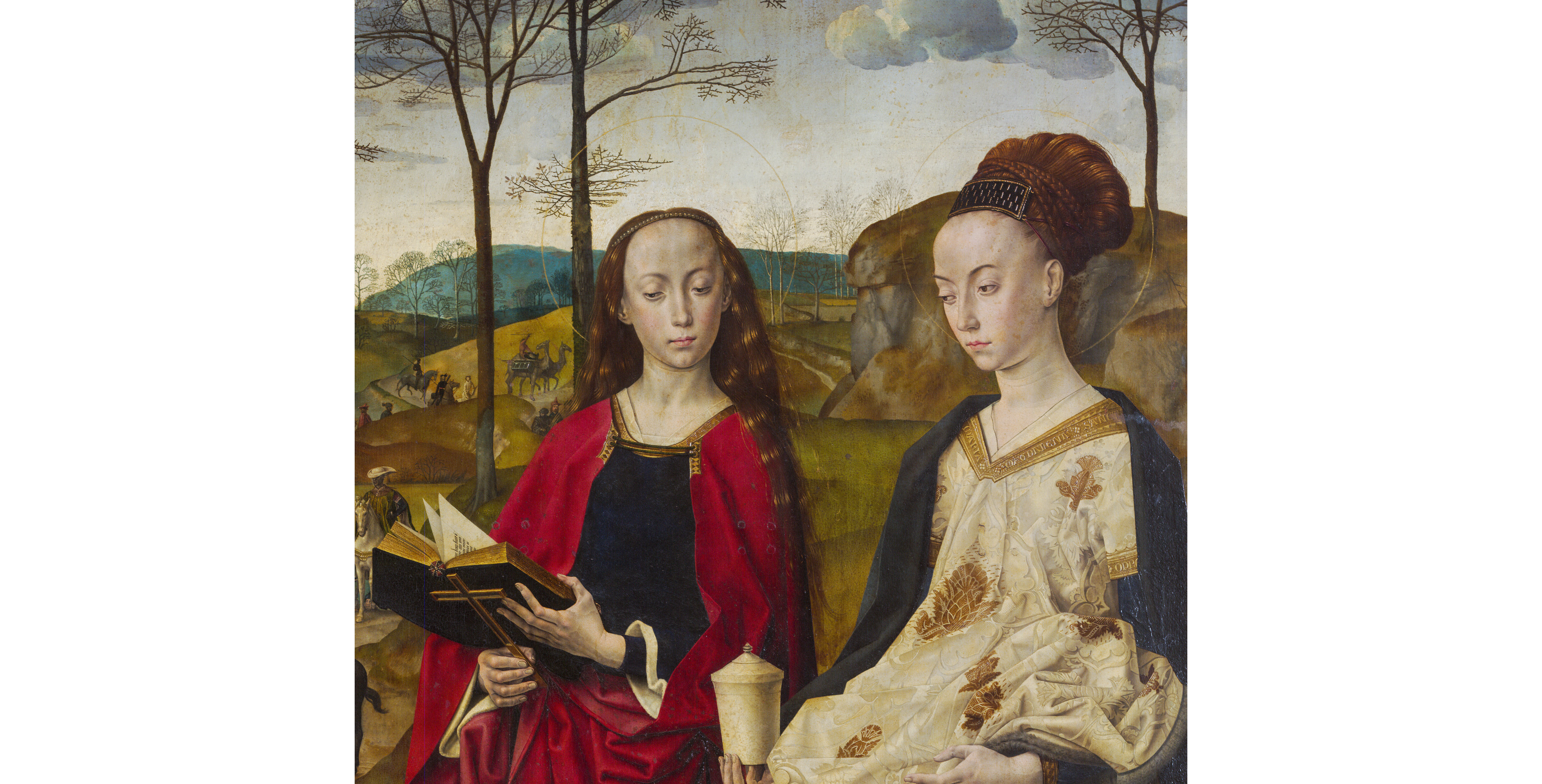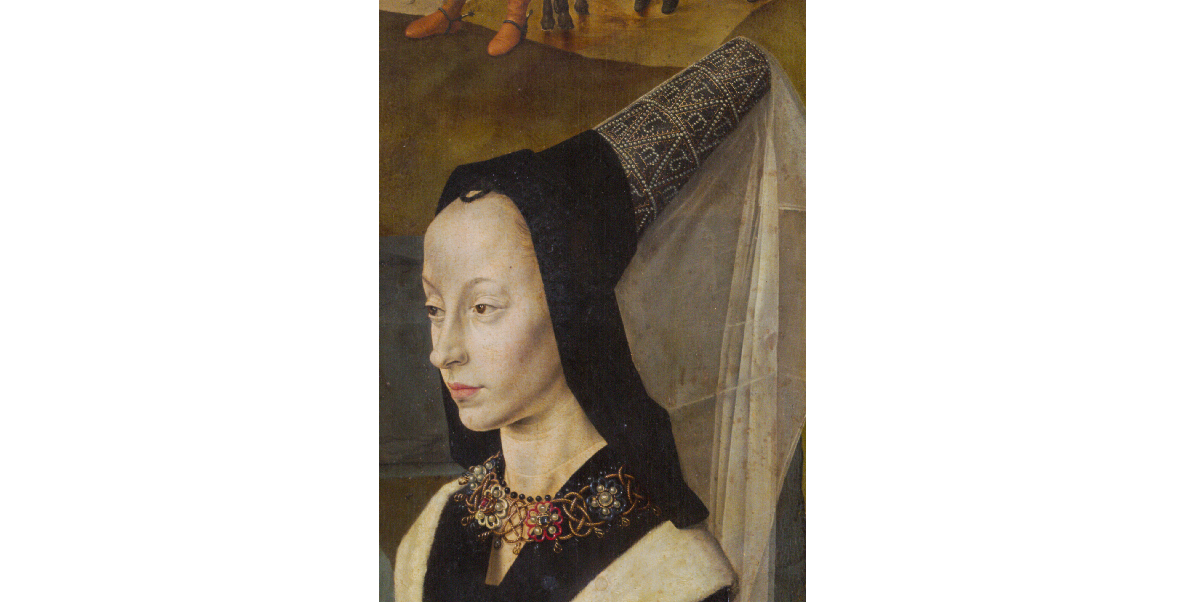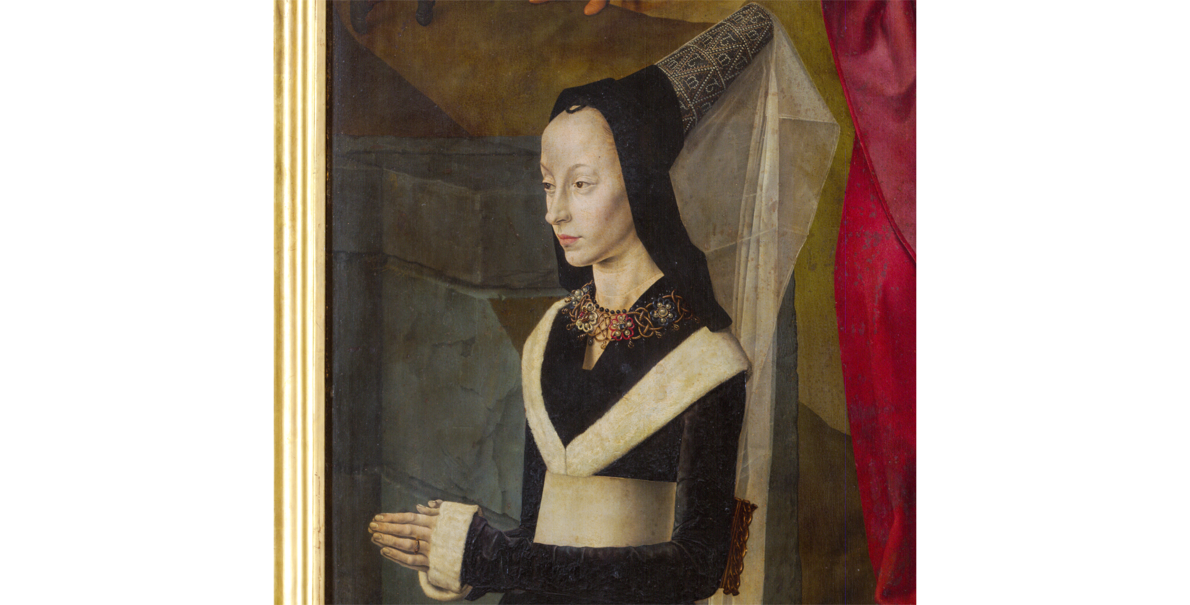 Del monumentale Trittico commissionato da Tommaso Portinari, i dettagli e in particolare quelli preziosi rappresentano forse uno degli aspetti più seducenti della ricerca di realismo di Hugo van der Goes. I monili, infatti, sono qui non solo segnali di stato sociale ma anche delle virtù morali delle dame Portinari: Maria Maddalena e Margherita rispettivamente moglie e figlia del committente. La prima reca all’anulare un anello eloquentemente composto da un rubino e uno zaffiro à cabochon affiancati, un genere di anello matrimoniale detto gimmel ring ( dal latino gemellus ) ben documentato nella ritrattistica fiamminga. Maria inoltre indossa un opulento collare di smalti, rubini, zaffiri, perle e grani di onice di fattura verosimilmente borgognona. La scelta delle gemme nasce da urgenze simboliche che, travalicando le motivazioni estetiche ed economiche, raccontano il ruolo della Dama ornata nel matrimonio, nella famiglia e nella società del suo tempo: in questo caso le perle significano castità, i diamanti forza e nobiltà, i rubini amore e generosità e gli zaffiri umiltà. Gioielli di simile importanza erano spesso doni di nozze o meglio ‘prestiti’ destinati a rimanere di proprietà del marito cui spettava il diritto di disporne a propria convenienza. Infatti in questo collare realmente esistito e documentato fedelmente anche da Hans Memling nel ritratto di Maria Portinari oggi al Metropolitan Museum di New York, è stato ipoteticamente individuato il monile che Tommaso fu costretto, in seguito, a vendere per ripianare i debiti del fallimento del Banco mediceo da lui diretto a Bruges.